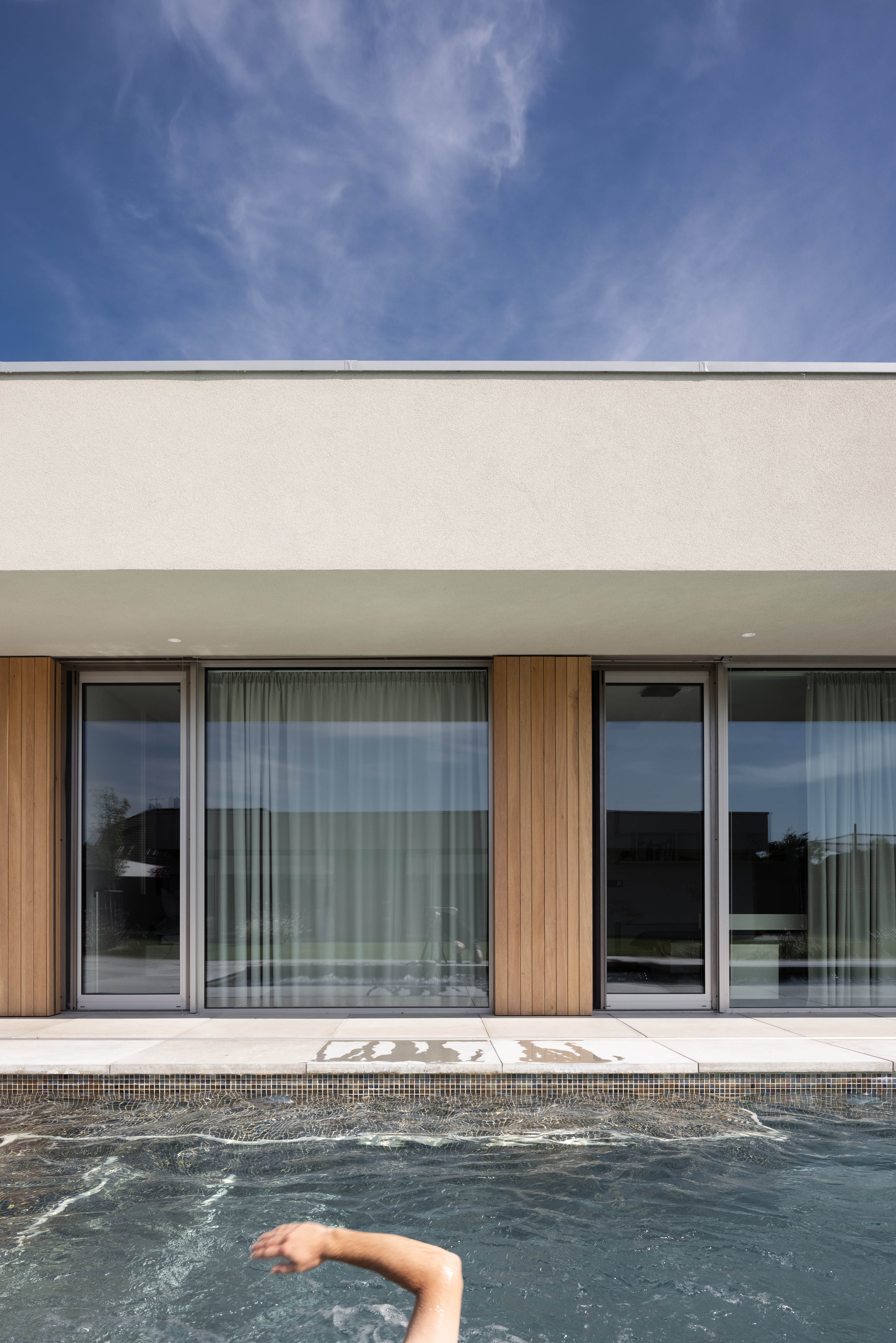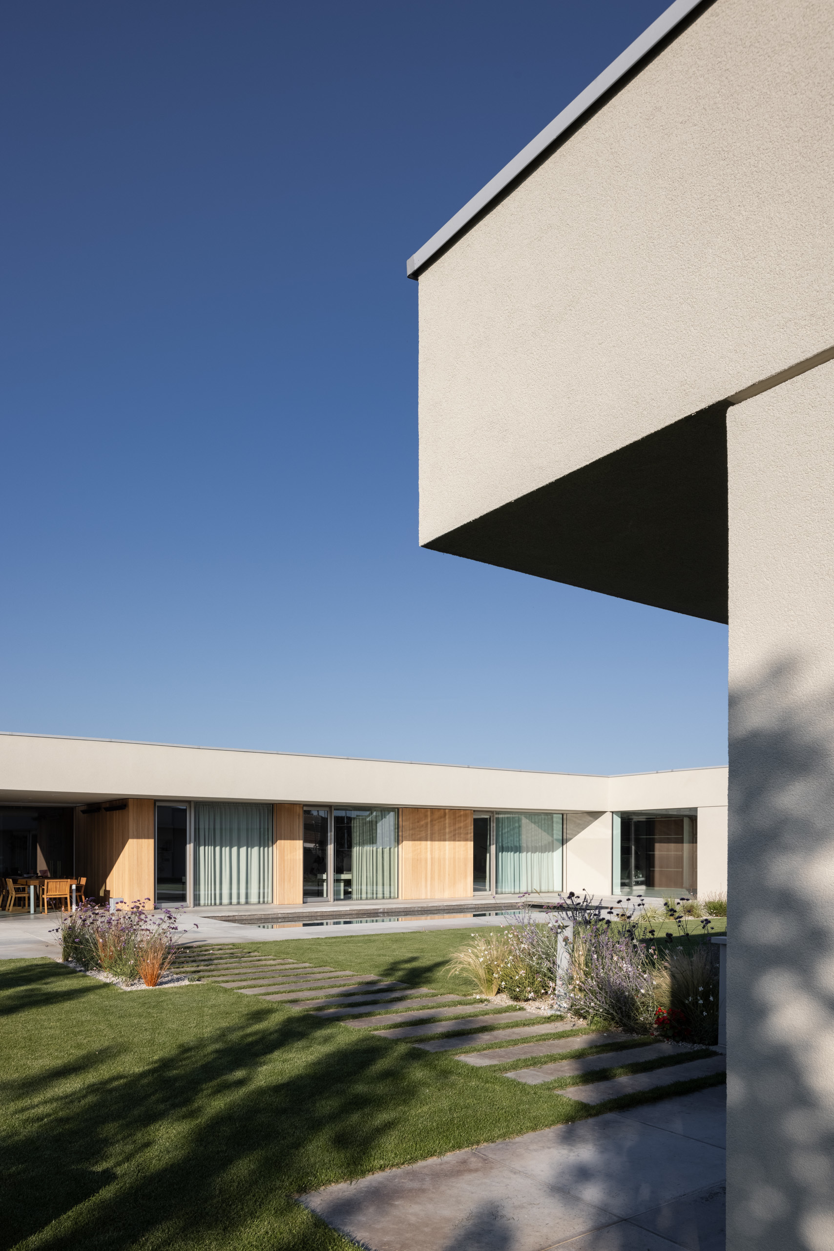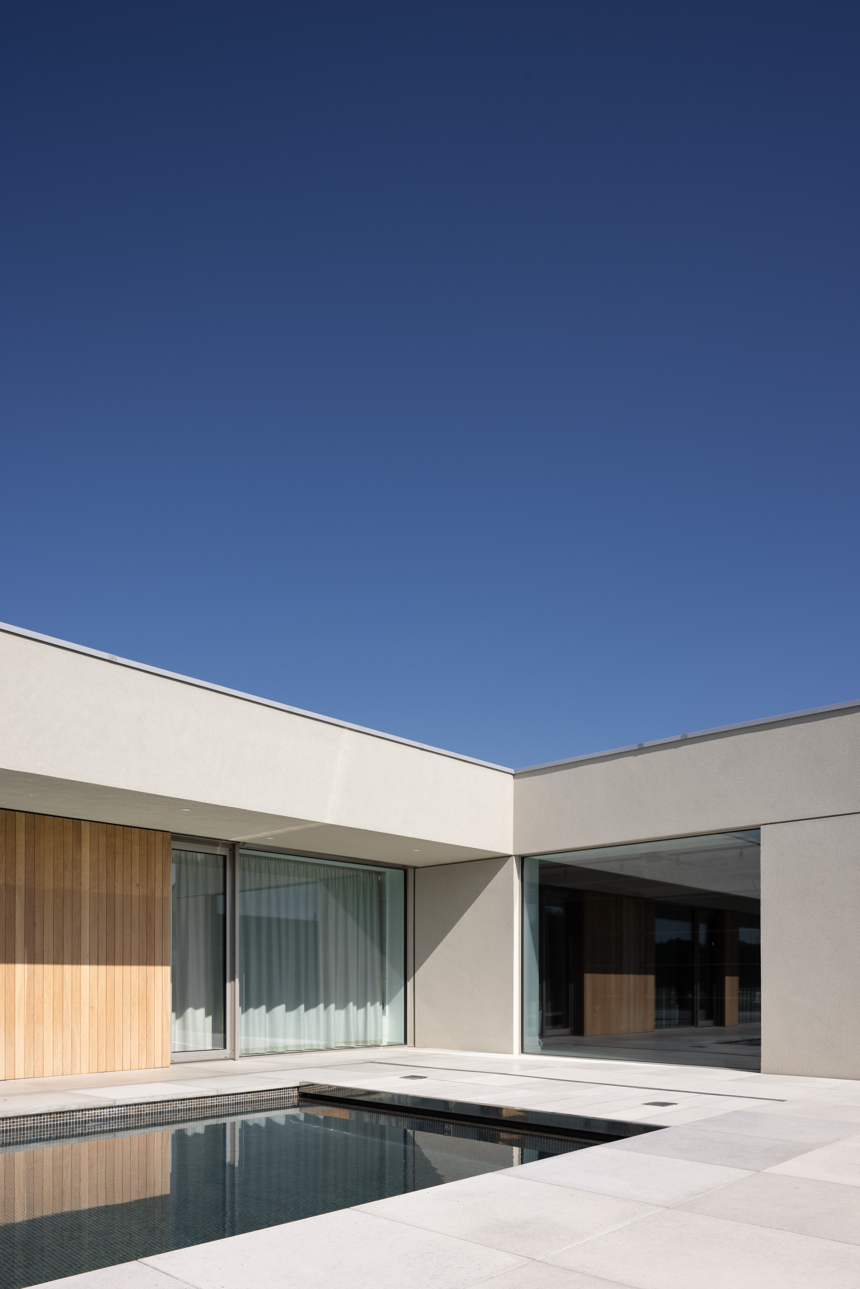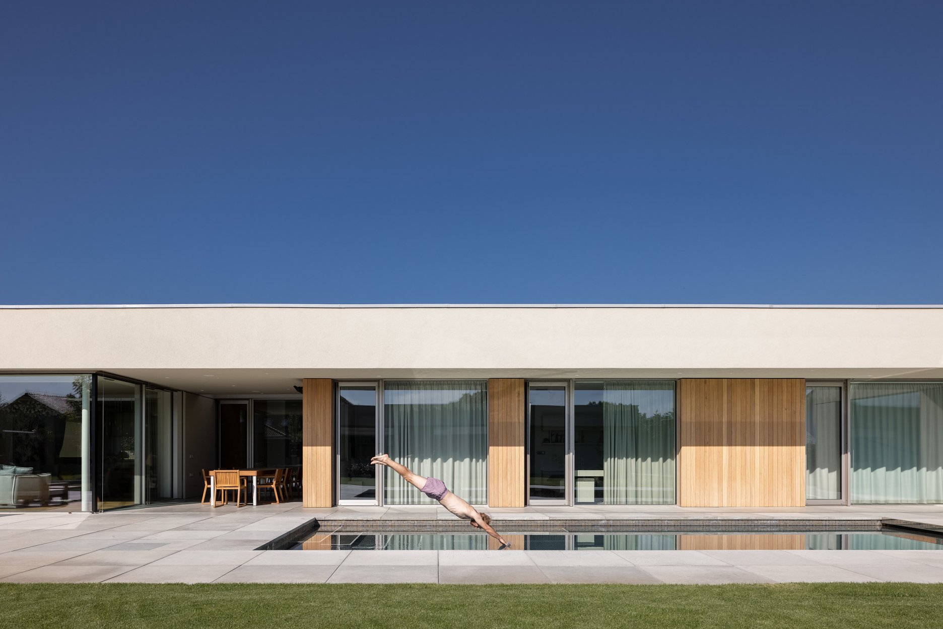 Vytvárame členitý dom, pričom strecha zámerne zostáva kompaktná. V rôznej miere prekrýva átria no zároveň ju niekde zámerne vypúšťame. Použitím svetlíkov vpúšťame do domu svetlo a vytvárame tak ďalší dynamicky meniaci sa element. Dom má rôzne zákutia a atmosféry, niekde sa viac otvára, na druhej strane zase introvertne uzatvára. Zádverie sa stáva hlavným komunikačným priestorom domu a rozdeľuje priestor na spoločenský a obytný trakt. Obývací priestor spolu s izbami je otočný do záhrady, otvára sa na terasu s bazénom. V osi domu je situovaný záhradný domček, ktorý slúži ako spoločenská miestnosť a hosťovská izba či sklad. Pracujeme s jednoduchou materialitou, nechávame vyznieť samotnú štruktúru domu a hru svetla na čistých plochách.