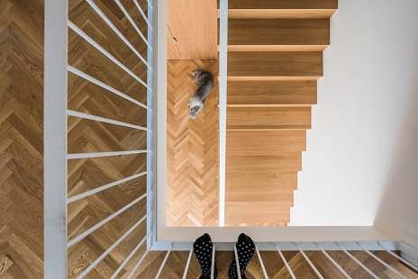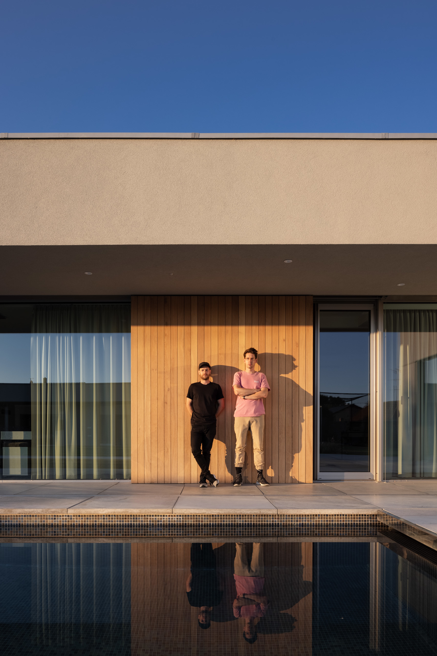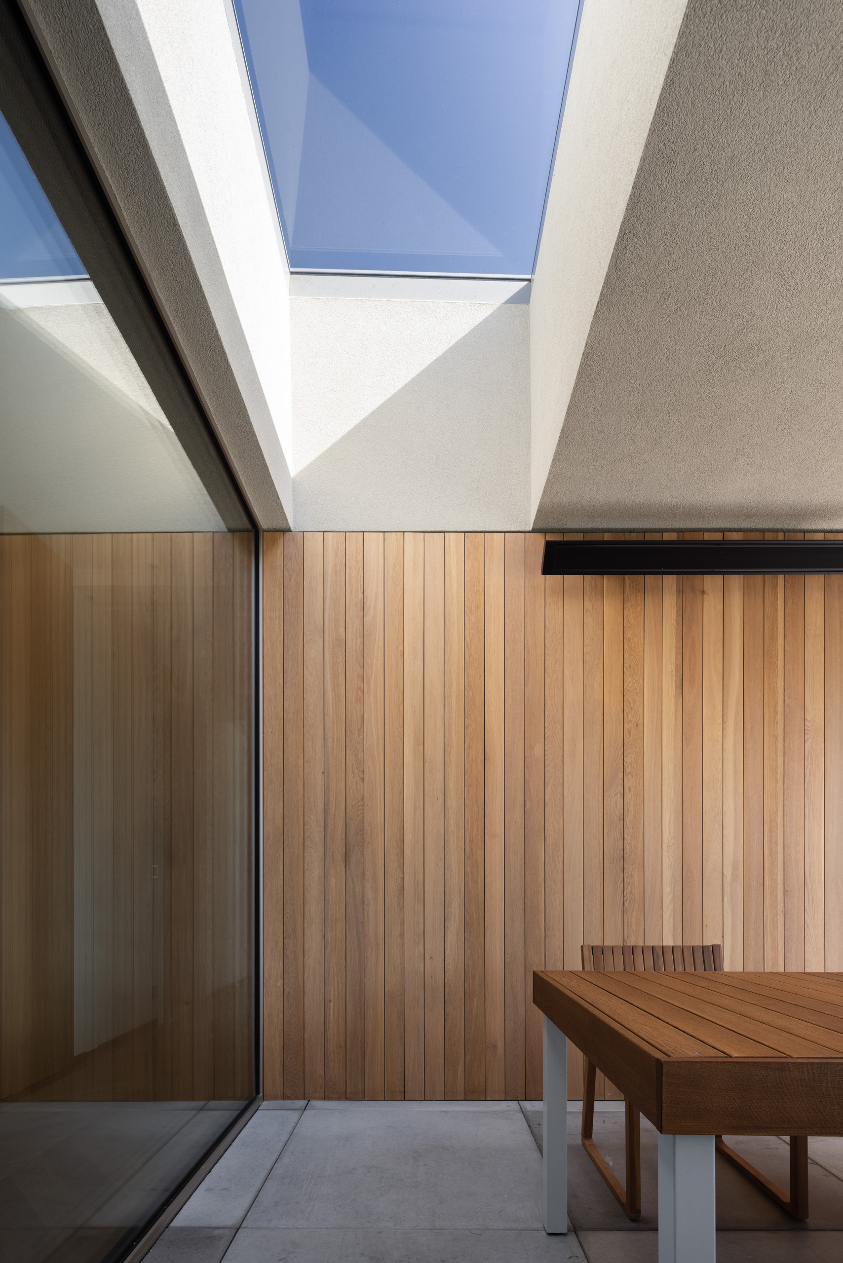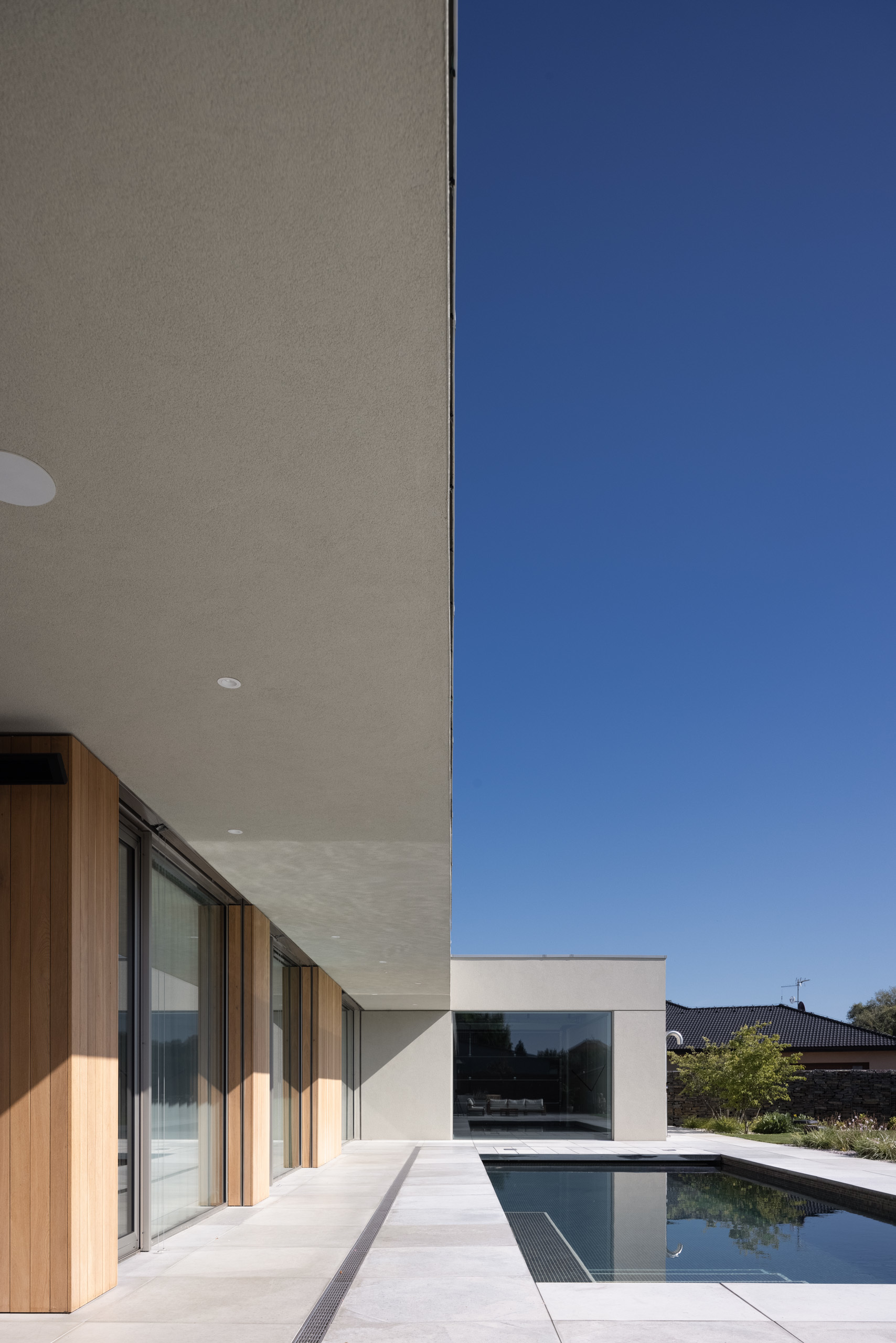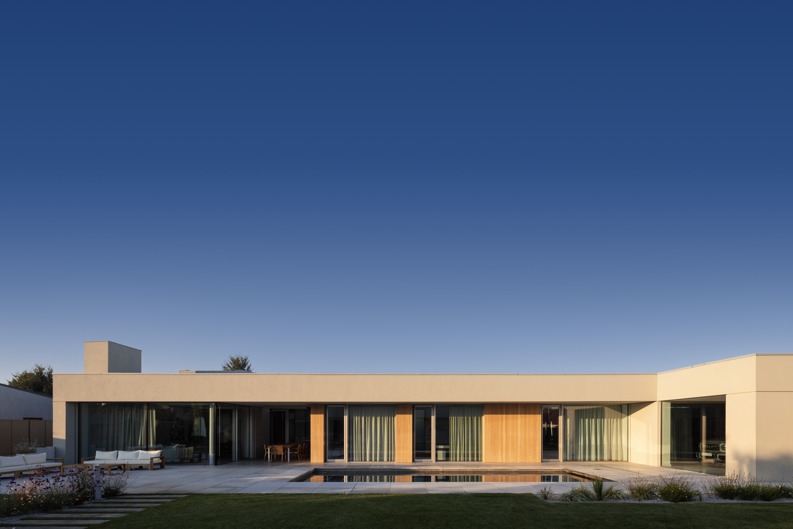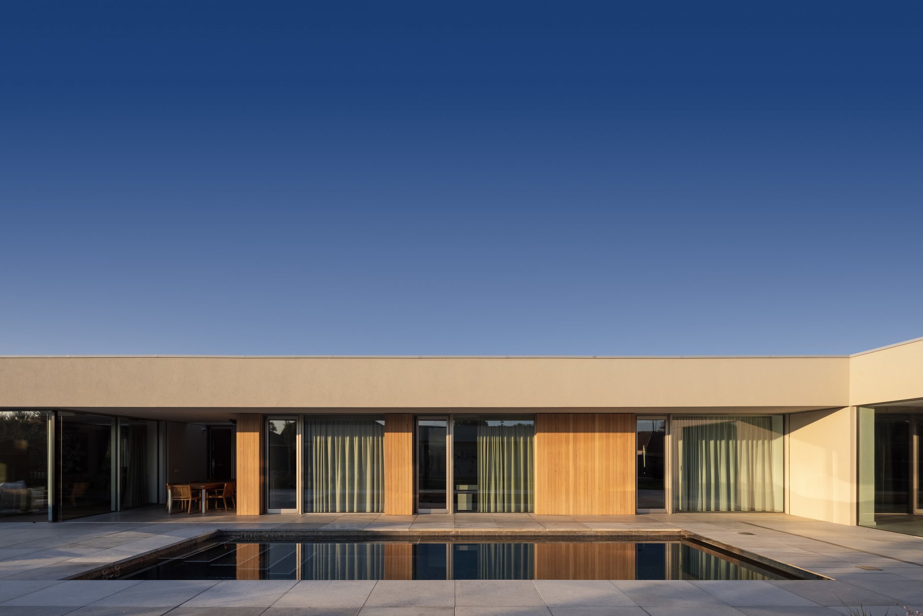 Vytvárame členitý dom, pričom strecha zámerne zostáva kompaktná. V rôznej miere prekrýva átria no zároveň ju niekde zámerne vypúšťame. Použitím svetlíkov vpúšťame do domu svetlo a vytvárame tak ďalší dynamicky meniaci sa element. Dom má rôzne zákutia a atmosféry, niekde sa viac otvára, na druhej strane zase introvertne uzatvára. Zádverie sa stáva hlavným komunikačným priestorom domu a rozdeľuje priestor na spoločenský a obytný trakt. Obývací priestor spolu s izbami je otočný do záhrady, otvára sa na terasu s bazénom. V osi domu je situovaný záhradný domček, ktorý slúži ako spoločenská miestnosť a hosťovská izba či sklad. Pracujeme s jednoduchou materialitou, nechávame vyznieť samotnú štruktúru domu a hru svetla na čistých plochách.