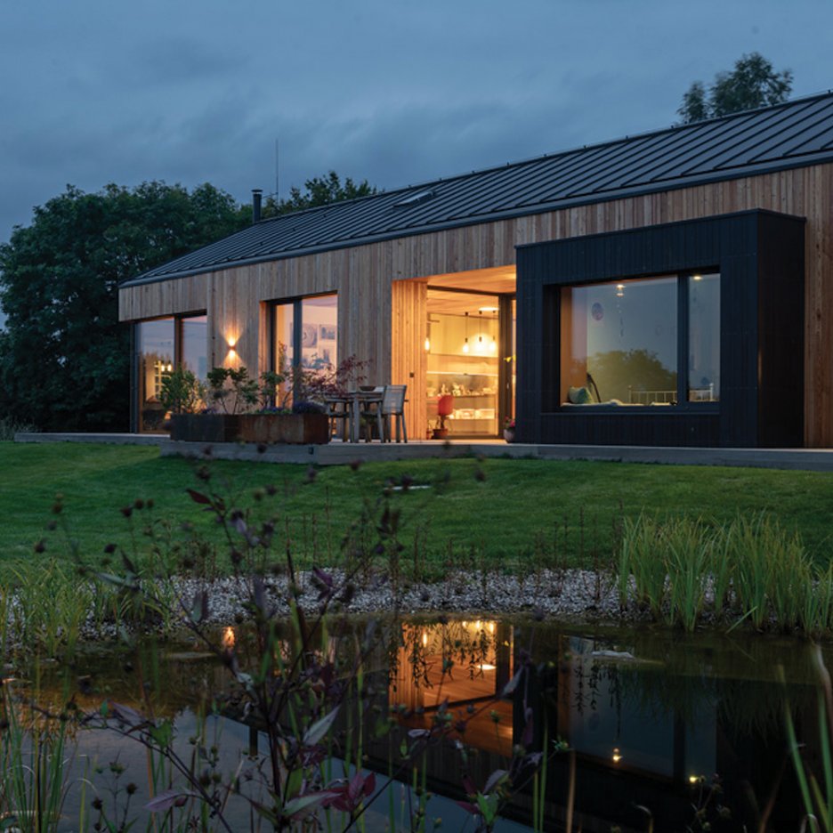 Konstrukci domu tvoří dřevěné šroubované masivní panely a fasádu domu dřevěný vertikální obklad ze sibiřského modřínu. Objekt zahradního domku se saunou má stejně jako kryté parkovací stání z důvodu lepšího propojení s přírodou extenzivní vegetační střechu. Za domkem se schovává skleník a opodál sad.