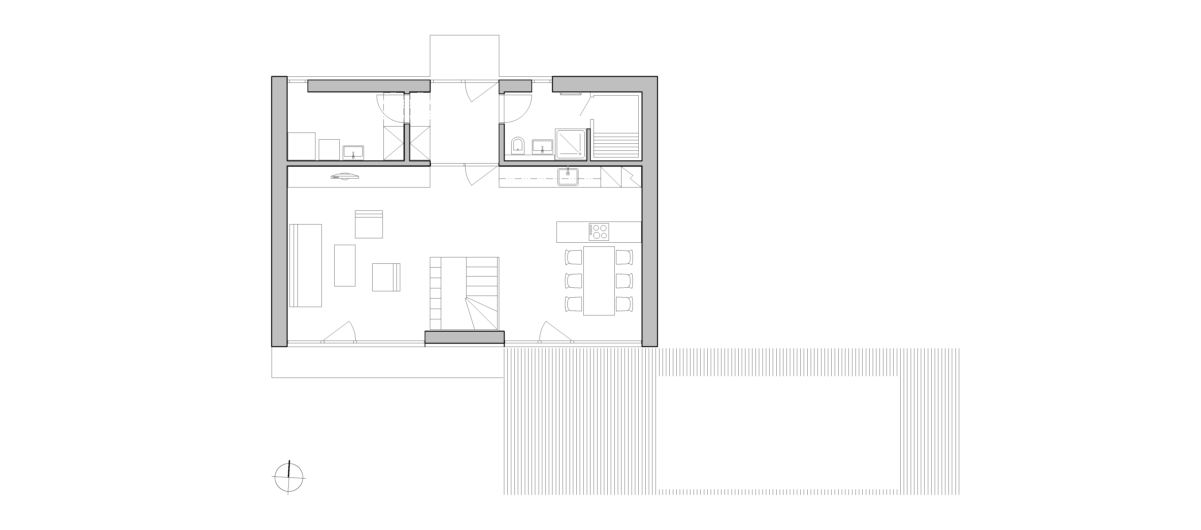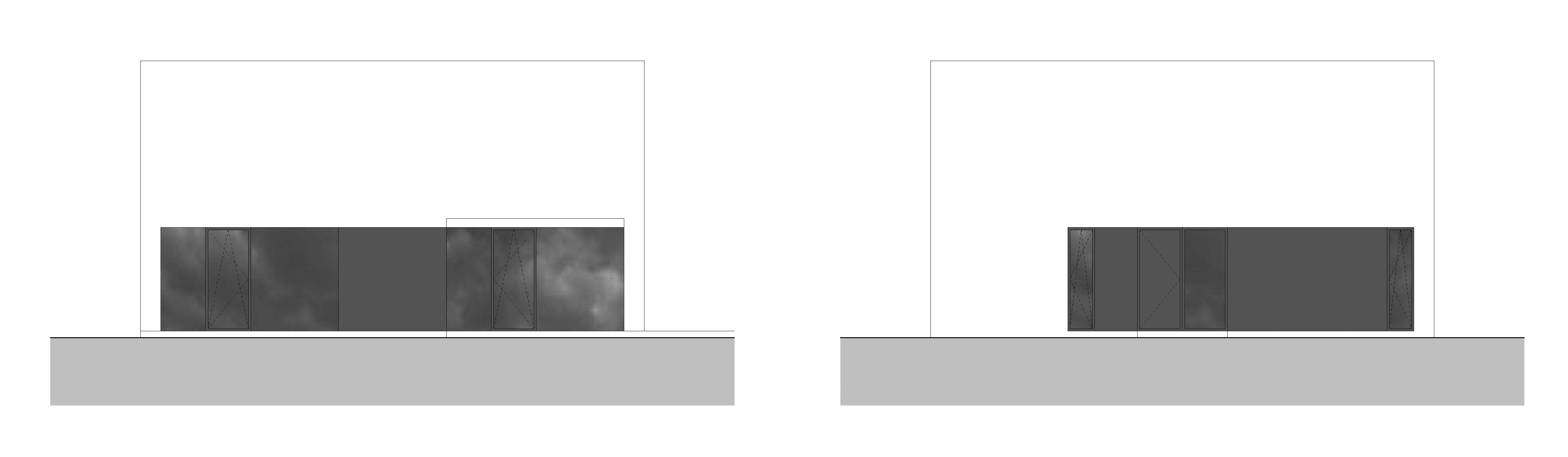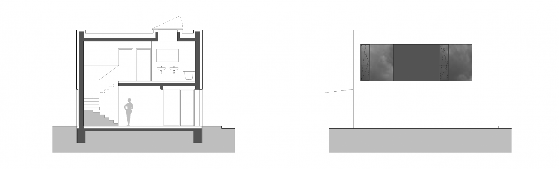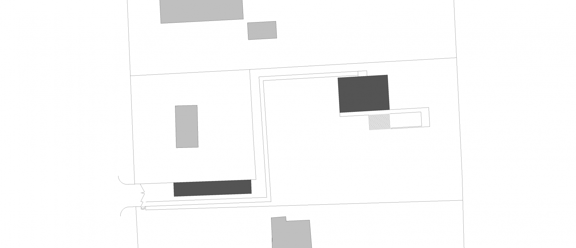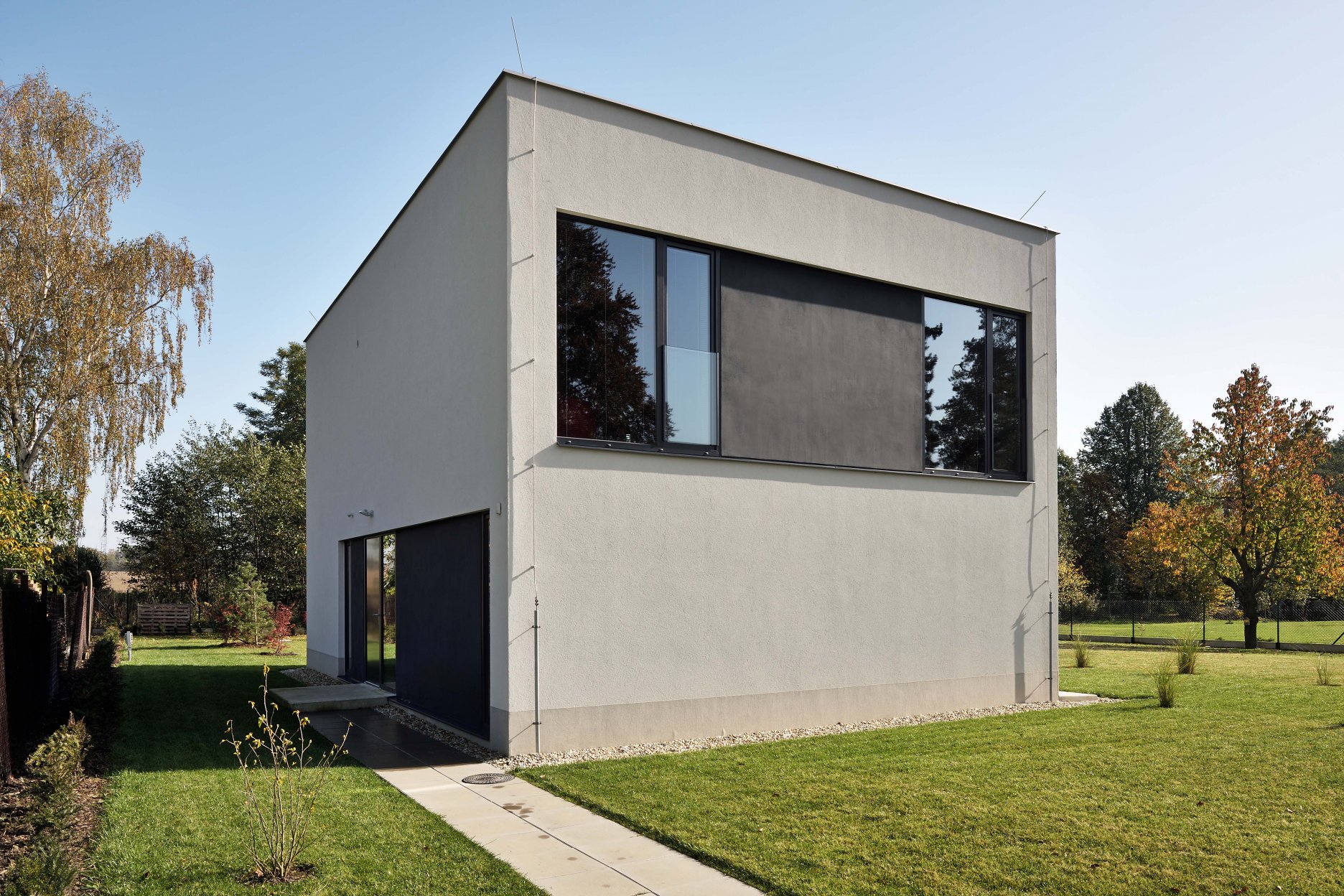 Monochromatická fasáda je rozčlenená štyrmi tmavými obdĺžnikmi so zasklenými plochami. Kompaktný dom sa stáva pevným bodom na rozsiahlom pozemku. Keďže je parkovanie zabezpečené na úzkom prístupovom páse, sú v okolí domu spevnené plochy zredukované na nevyhnutné minimum. Na takmer celom pozemku je udržiavaný trávnik. Ako pobytový priestor slúži drevená palubová terasa, plynulo nadväzujúca na bazén.