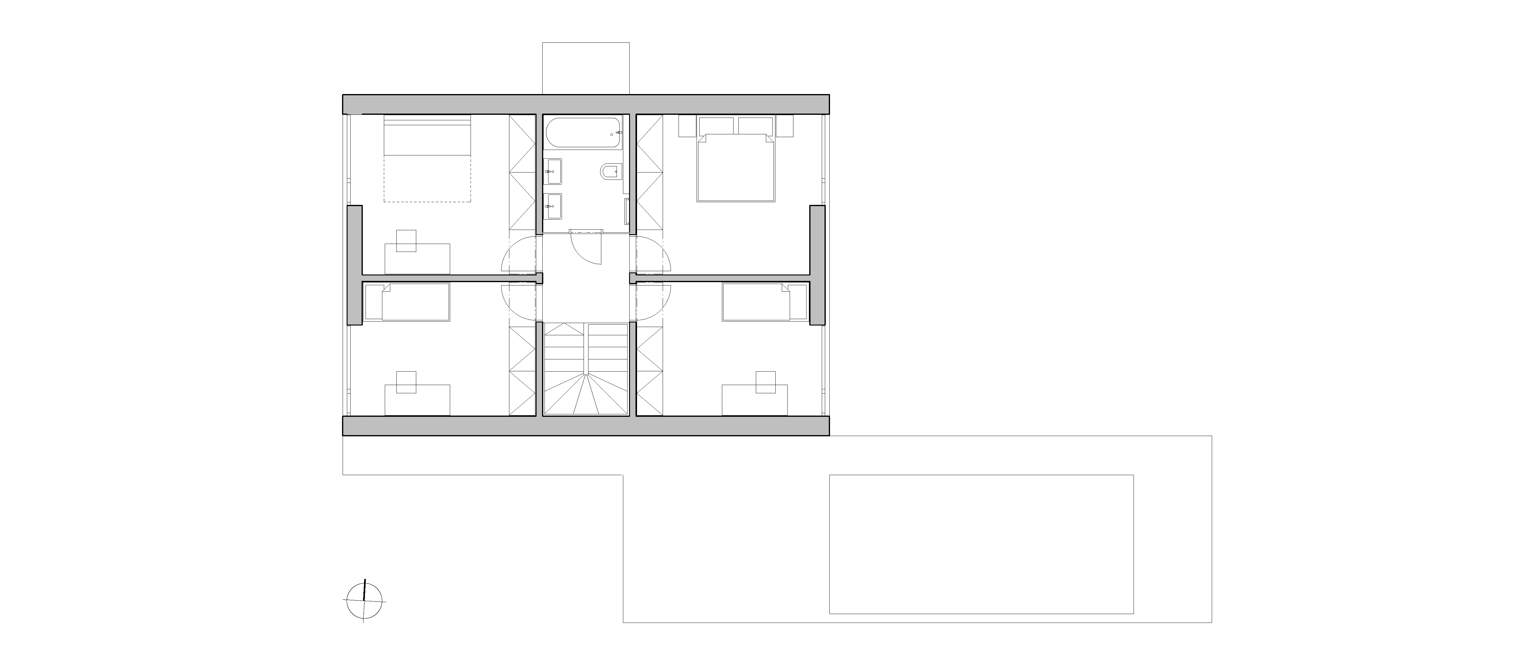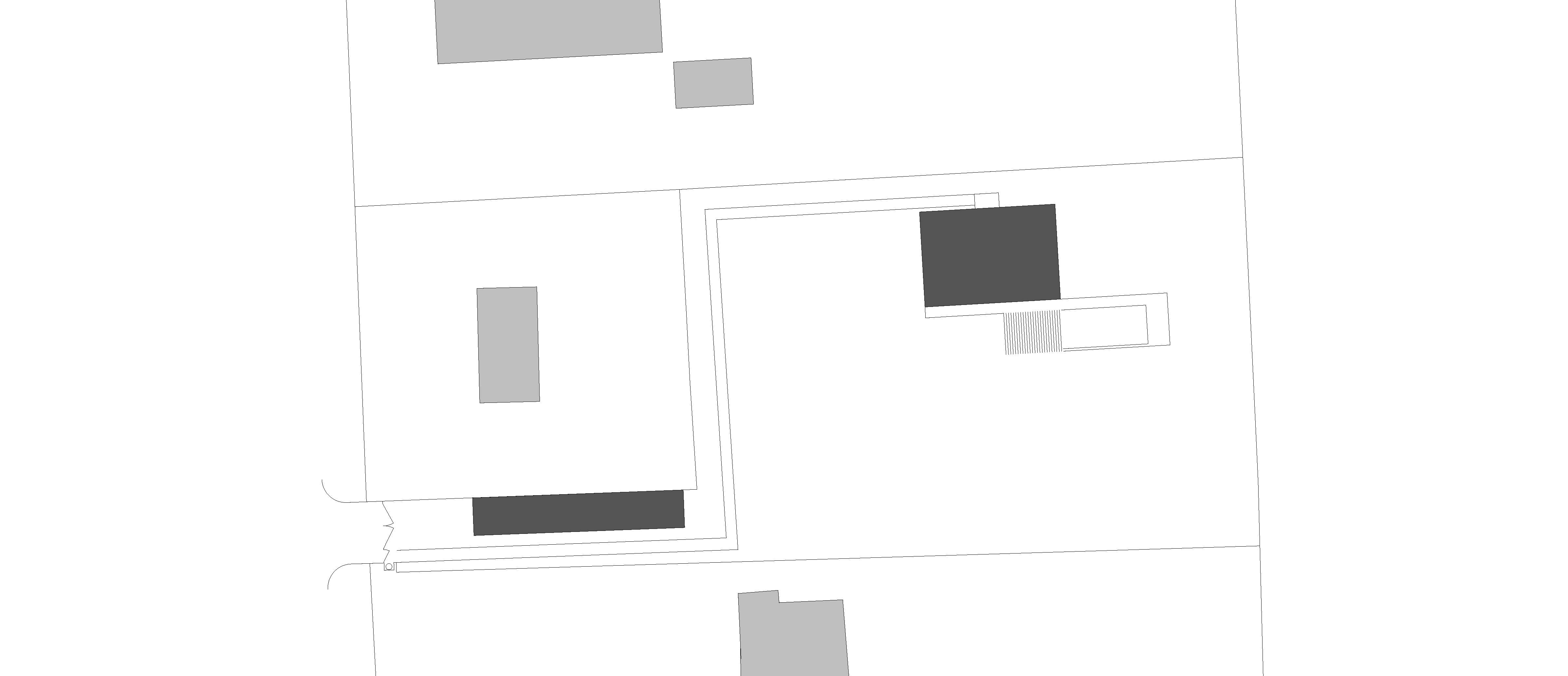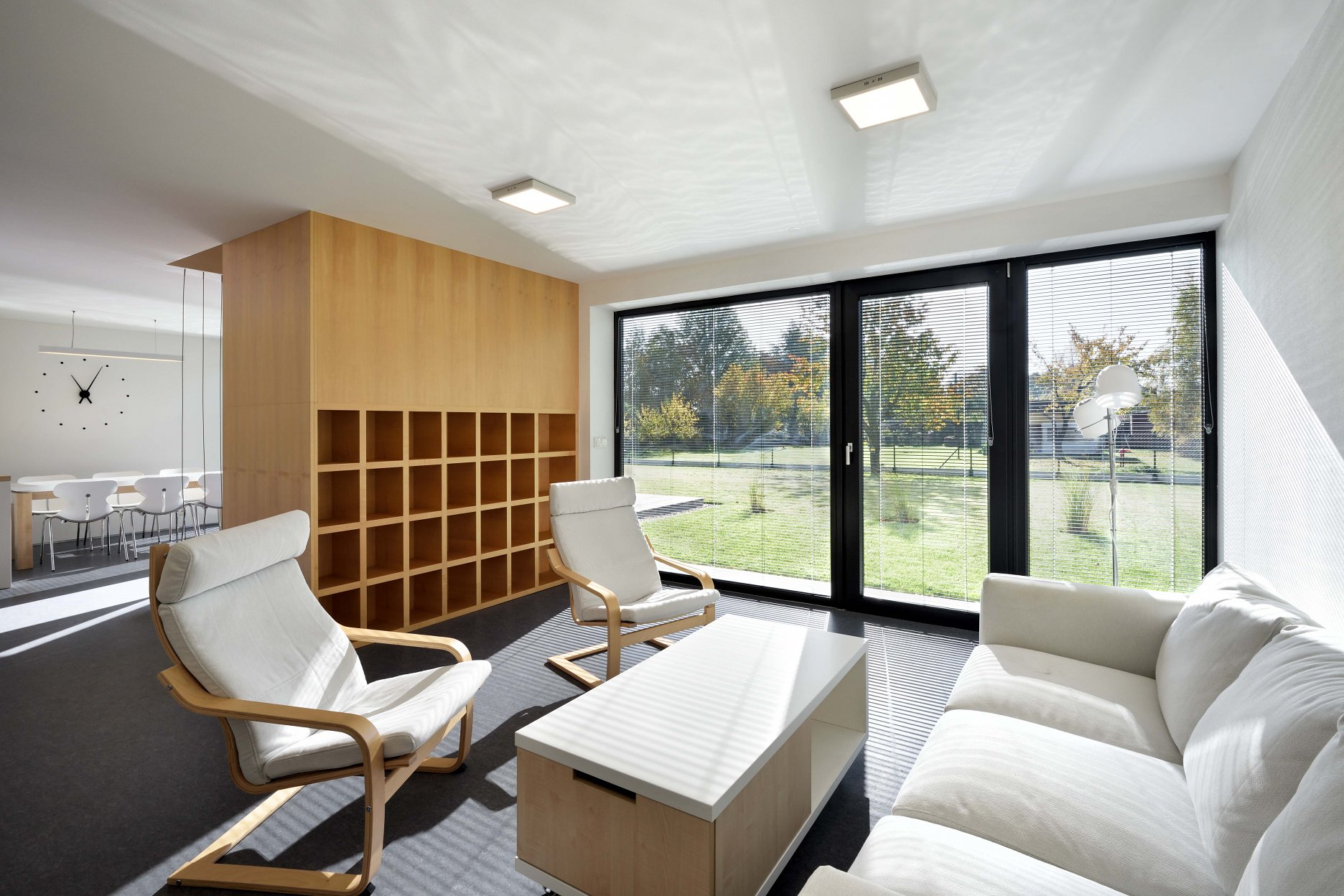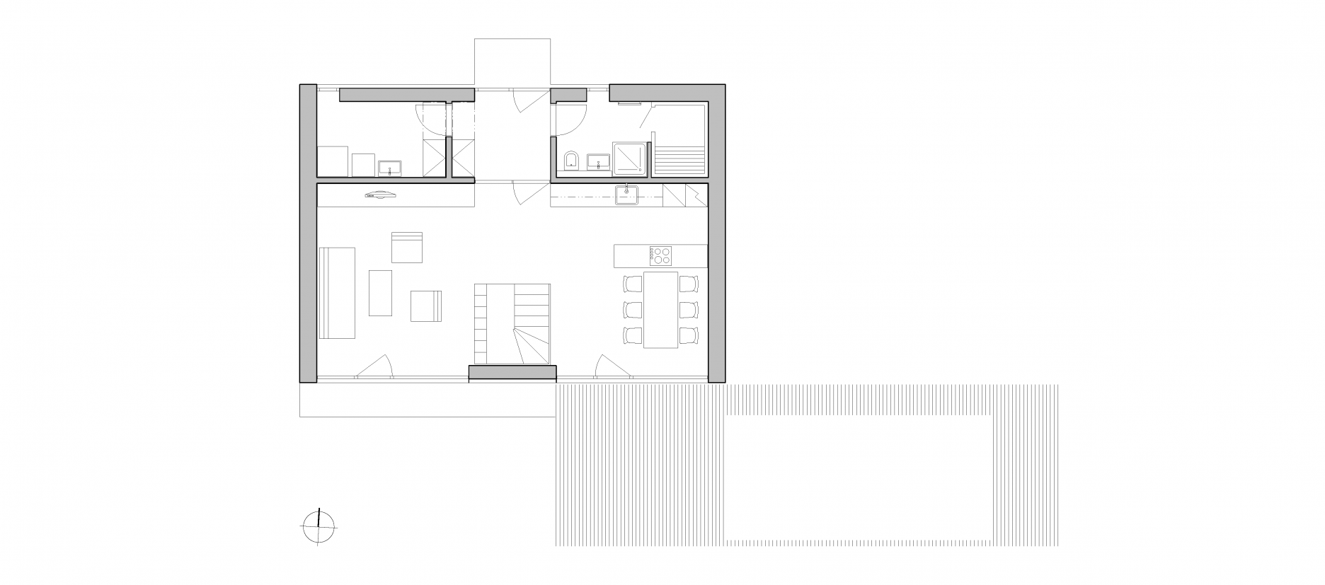 Monochromatická fasáda je rozčlenená štyrmi tmavými obdĺžnikmi so zasklenými plochami. Kompaktný dom sa stáva pevným bodom na rozsiahlom pozemku. Keďže je parkovanie zabezpečené na úzkom prístupovom páse, sú v okolí domu spevnené plochy zredukované na nevyhnutné minimum. Na takmer celom pozemku je udržiavaný trávnik. Ako pobytový priestor slúži drevená palubová terasa, plynulo nadväzujúca na bazén.