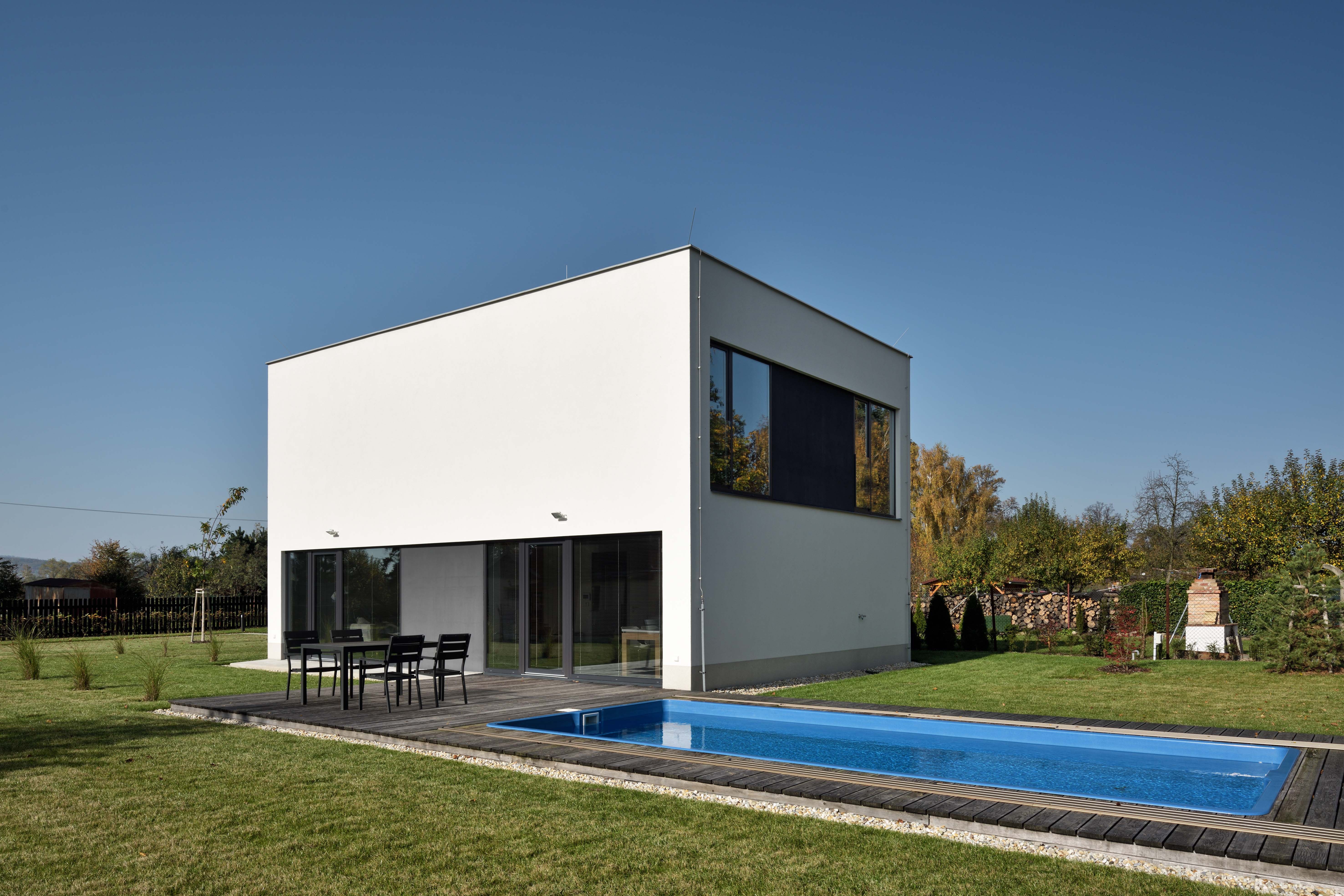 Dom sa svojou strohou formou vyčleňuje z nesúrodej zástavby okolia, necháva značnú časť rozsiahleho pozemku otvorenú. Dvojpodlažný biely kváder so zastavanou plochou 86 metrov štvorcových spĺňa pri zachovaní minimálnych nákladov všetky požiadavky klienta na kvalitu bývania.