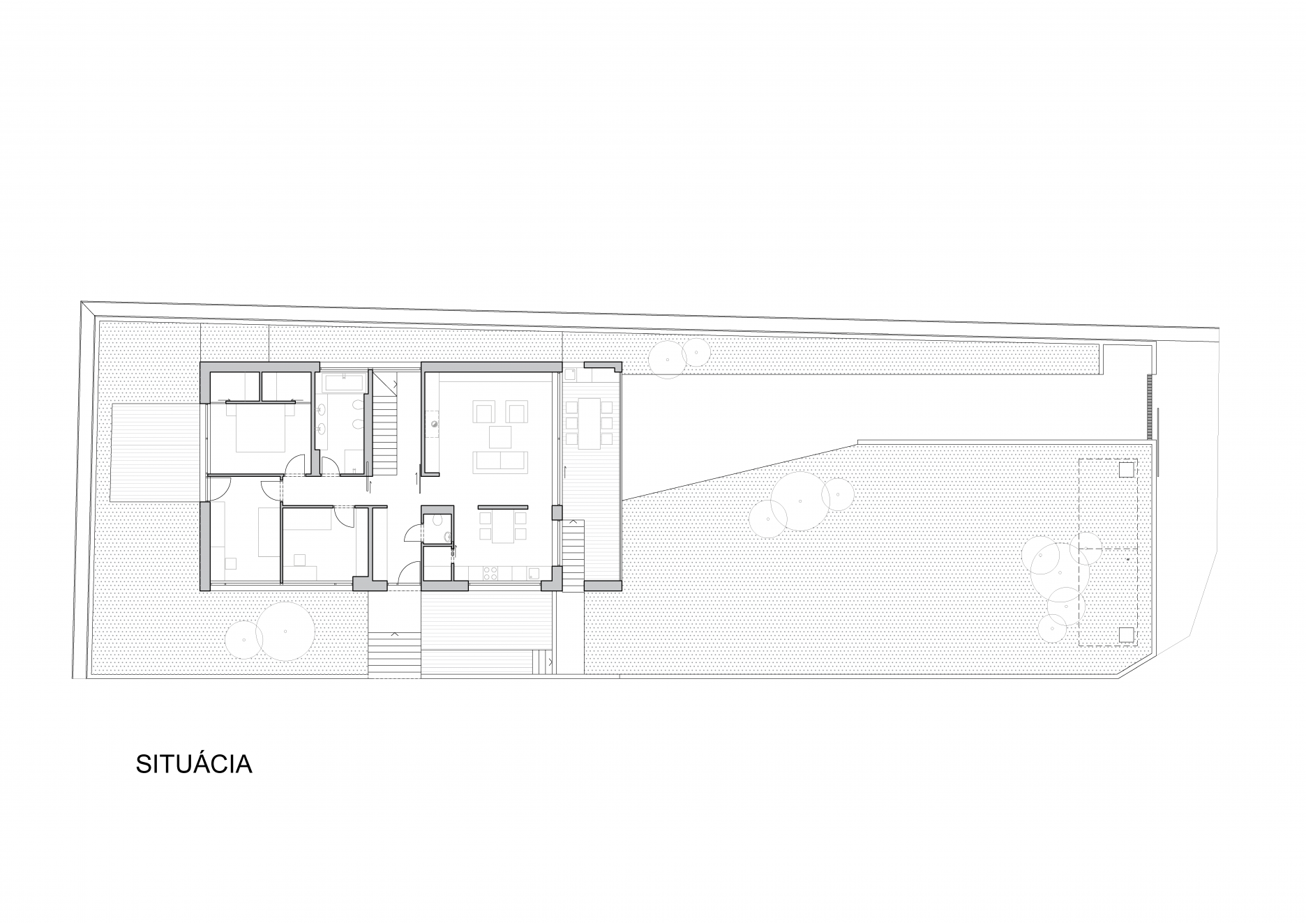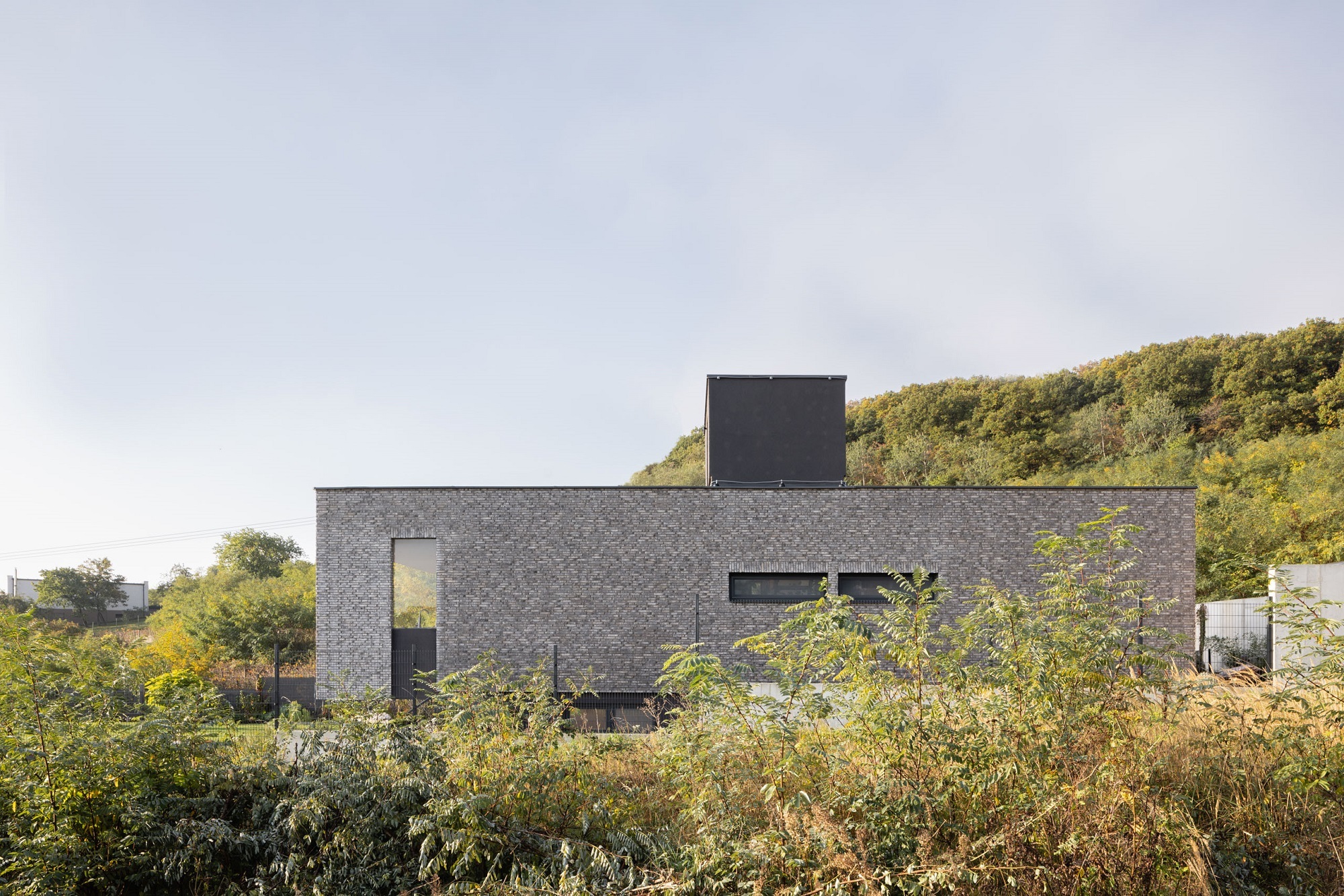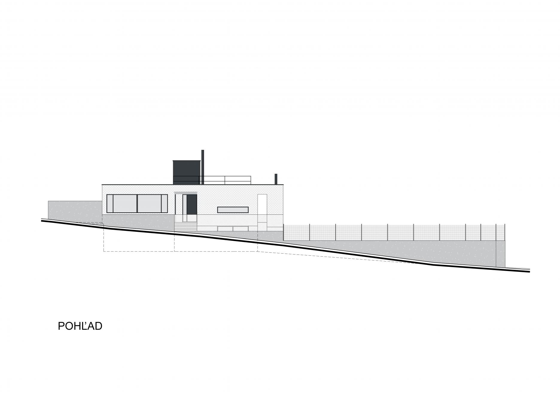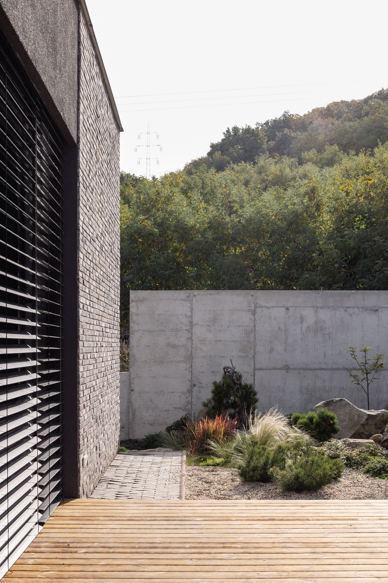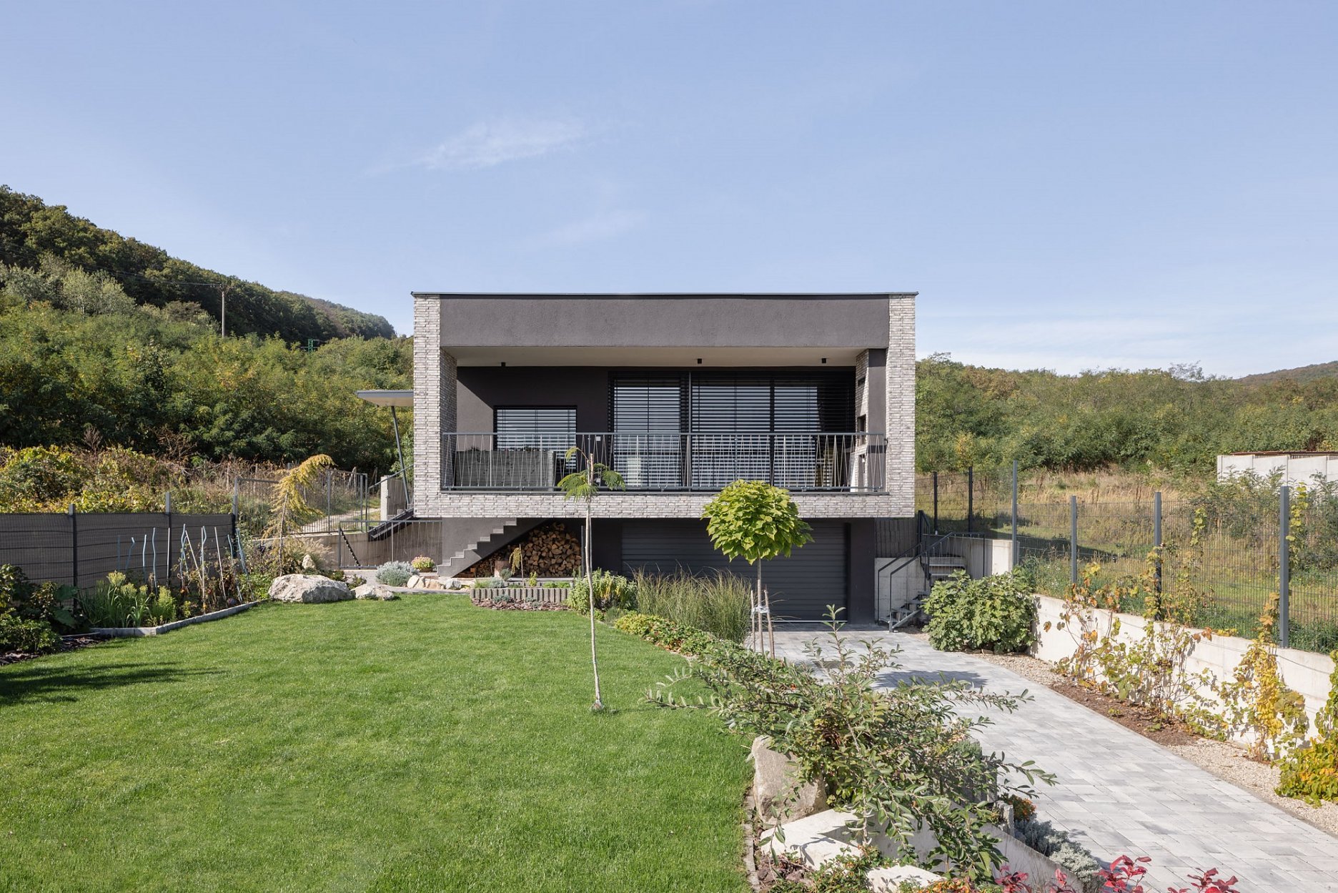 Za chrbtom karpatský les, po stranách riadky vinohradov a vpredu, kdesi v diaľke, Bratislava. Bola by škoda narušiť stíšenú víkendovú atmosféru tohto miesta. Dom sme preto navrhli tak, aby svojou jednoduchou figúrou, komornou mierkou a tlmenou farebnosťou časom úplne splynul s prostredím. Akoby tu stál odjakživa. Priestorový program je vecný, no nie nudný. Obohacujú ho viaceré exteriérové scenérie na rôznych terénnych úrovniach - záhrada pred domom, skrytá terasa na zníženom podlaží a úplne tajné zákutie celkom vzadu. Hlavná obytná časť je vďaka priaznivej juhovýchodnej orientácií plná slnka, veľké presklenie ju prepája s krytou terasou a s výhľadmi do záhrady a okolia. Na opačnej strane sa interiér otvára do centrálnej haly so schodiskom, na ktorú nadväzuje nočná zóna. Ničoho nie je veľa, ale ani málo. Tak akurát pre spokojný rodinný život.