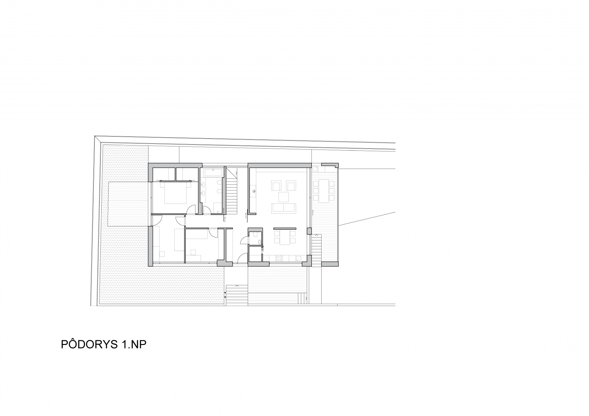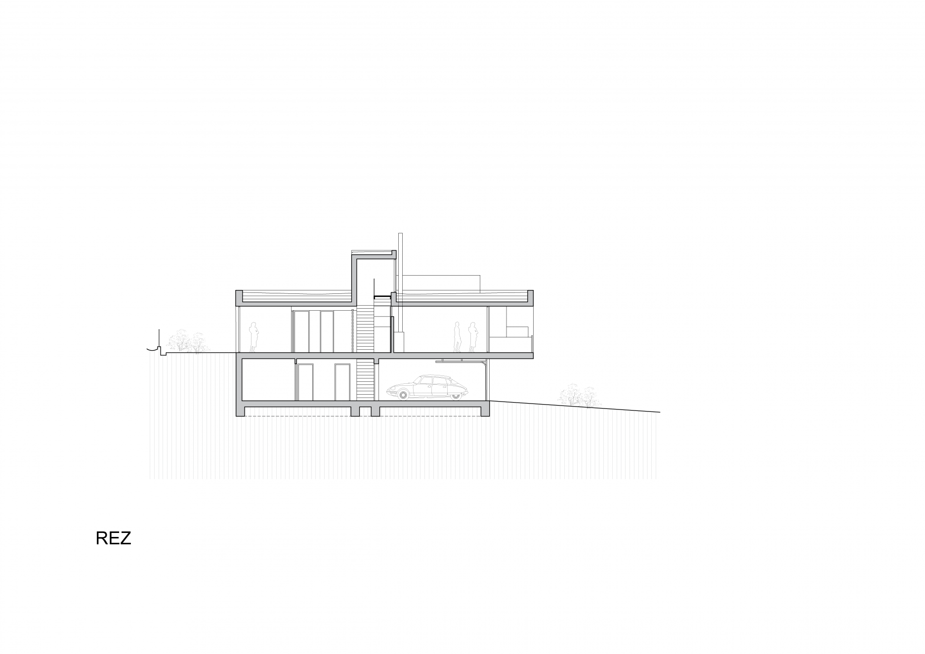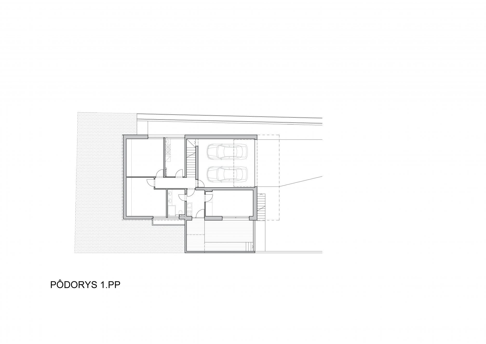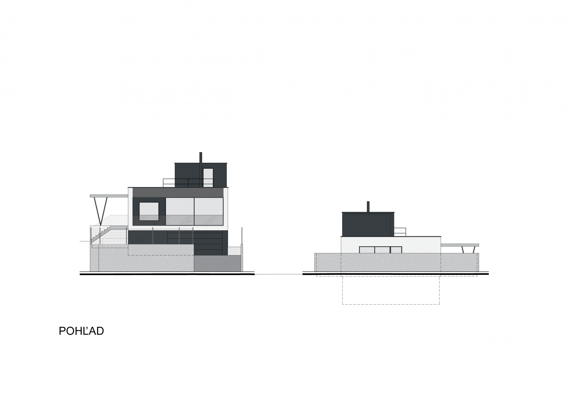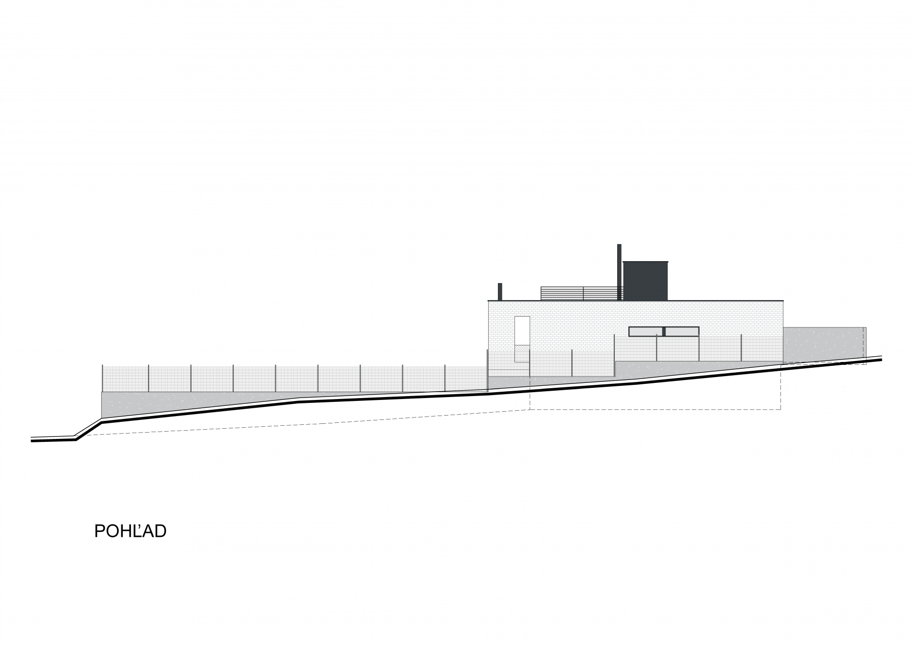 Za chrbtom karpatský les, po stranách riadky vinohradov a vpredu, kdesi v diaľke, Bratislava. Bola by škoda narušiť stíšenú víkendovú atmosféru tohto miesta. Dom sme preto navrhli tak, aby svojou jednoduchou figúrou, komornou mierkou a tlmenou farebnosťou časom úplne splynul s prostredím. Akoby tu stál odjakživa. Priestorový program je vecný, no nie nudný. Obohacujú ho viaceré exteriérové scenérie na rôznych terénnych úrovniach - záhrada pred domom, skrytá terasa na zníženom podlaží a úplne tajné zákutie celkom vzadu. Hlavná obytná časť je vďaka priaznivej juhovýchodnej orientácií plná slnka, veľké presklenie ju prepája s krytou terasou a s výhľadmi do záhrady a okolia. Na opačnej strane sa interiér otvára do centrálnej haly so schodiskom, na ktorú nadväzuje nočná zóna. Ničoho nie je veľa, ale ani málo. Tak akurát pre spokojný rodinný život.