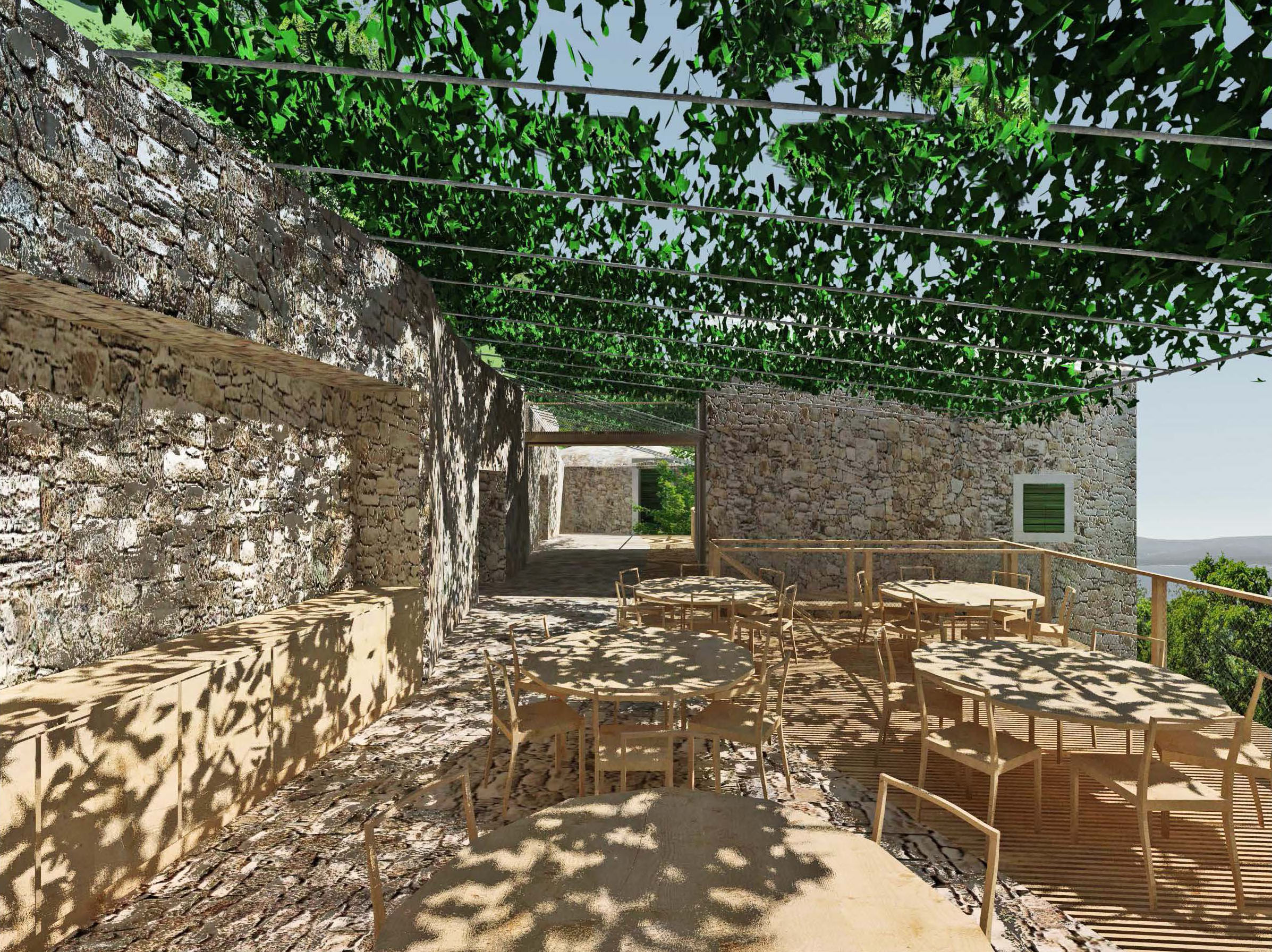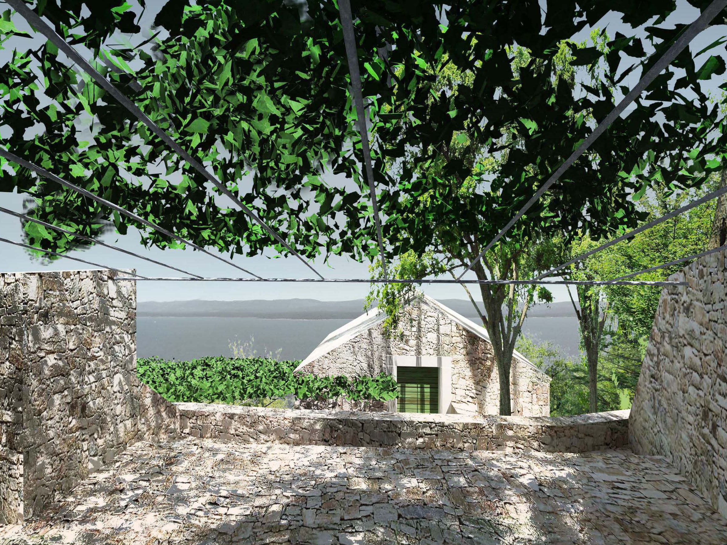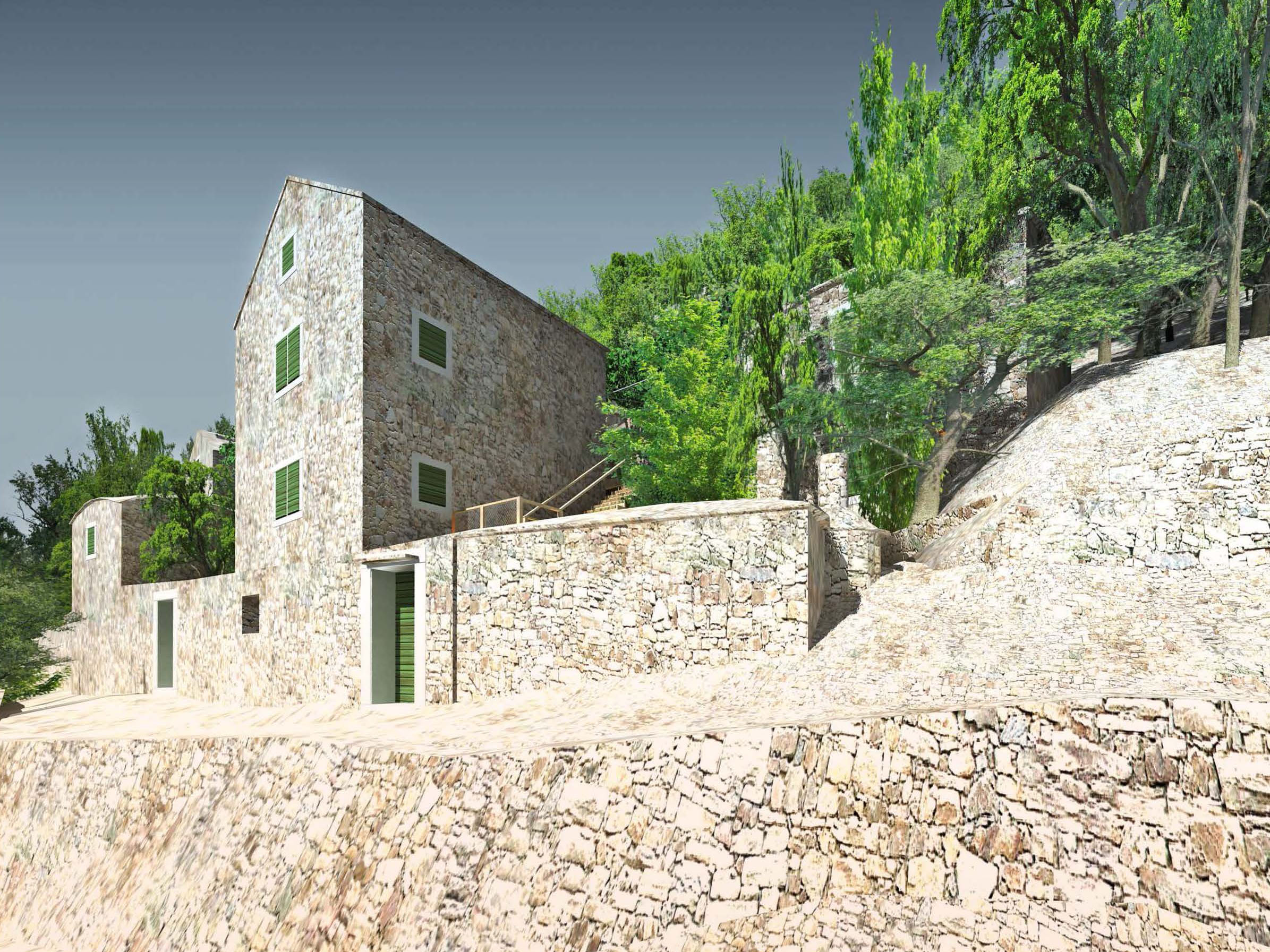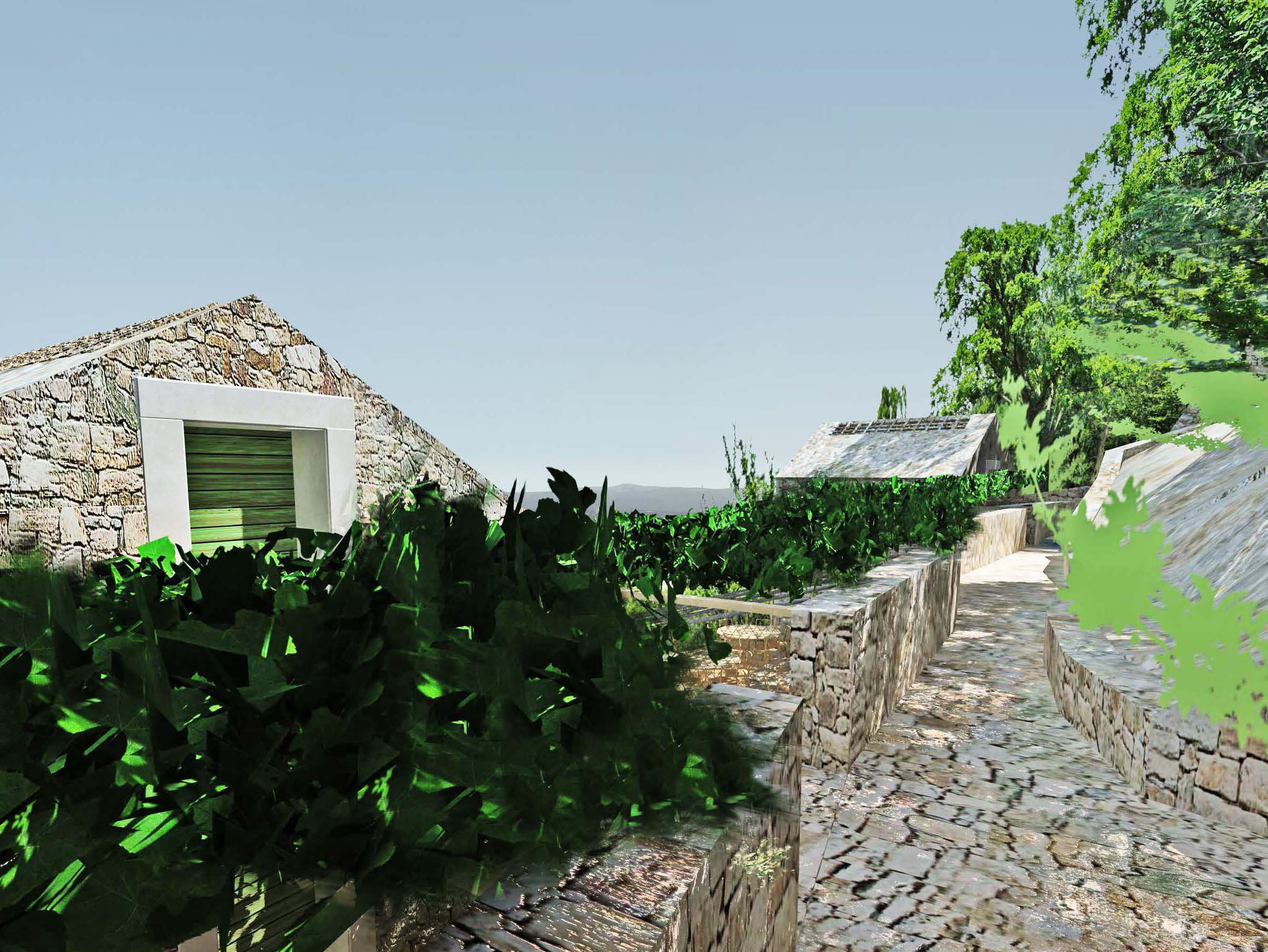 Projekt je o kontrastu a harmonii dvou témat. Jednak nově postavených nebo opravených tradičních kamenných domů - kuč. Jsou to věže ve svahu, kde můžete do každého patra vejít z terénu. Bílý vápenec, malá okna s kamenným ostěním, zelené okenice, kamenné střechy. Je v nich v létě chládek i bez klimatizace.