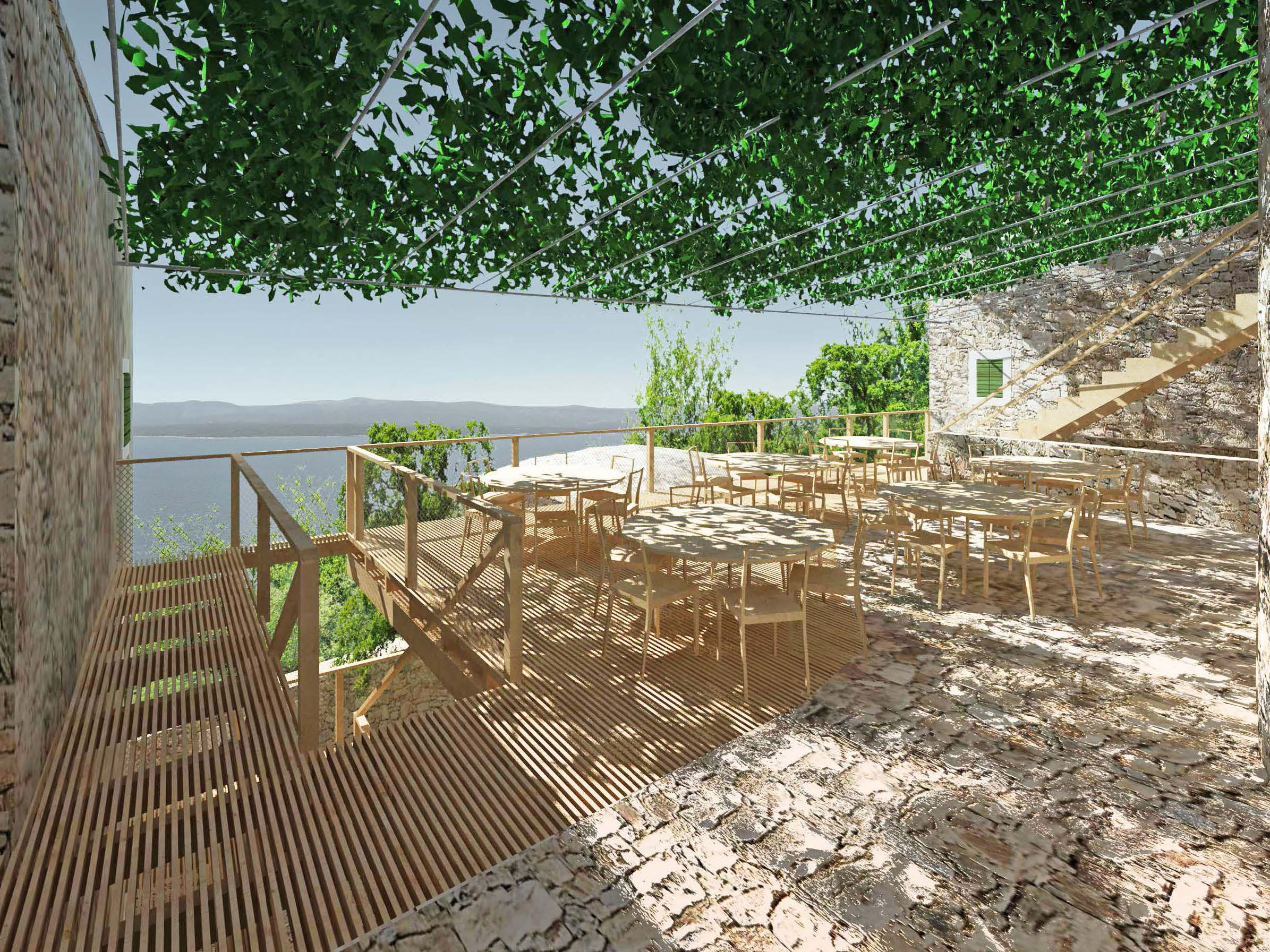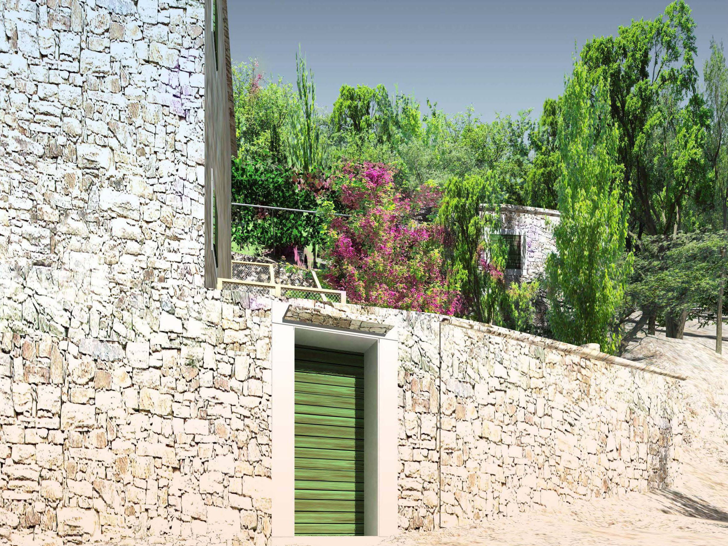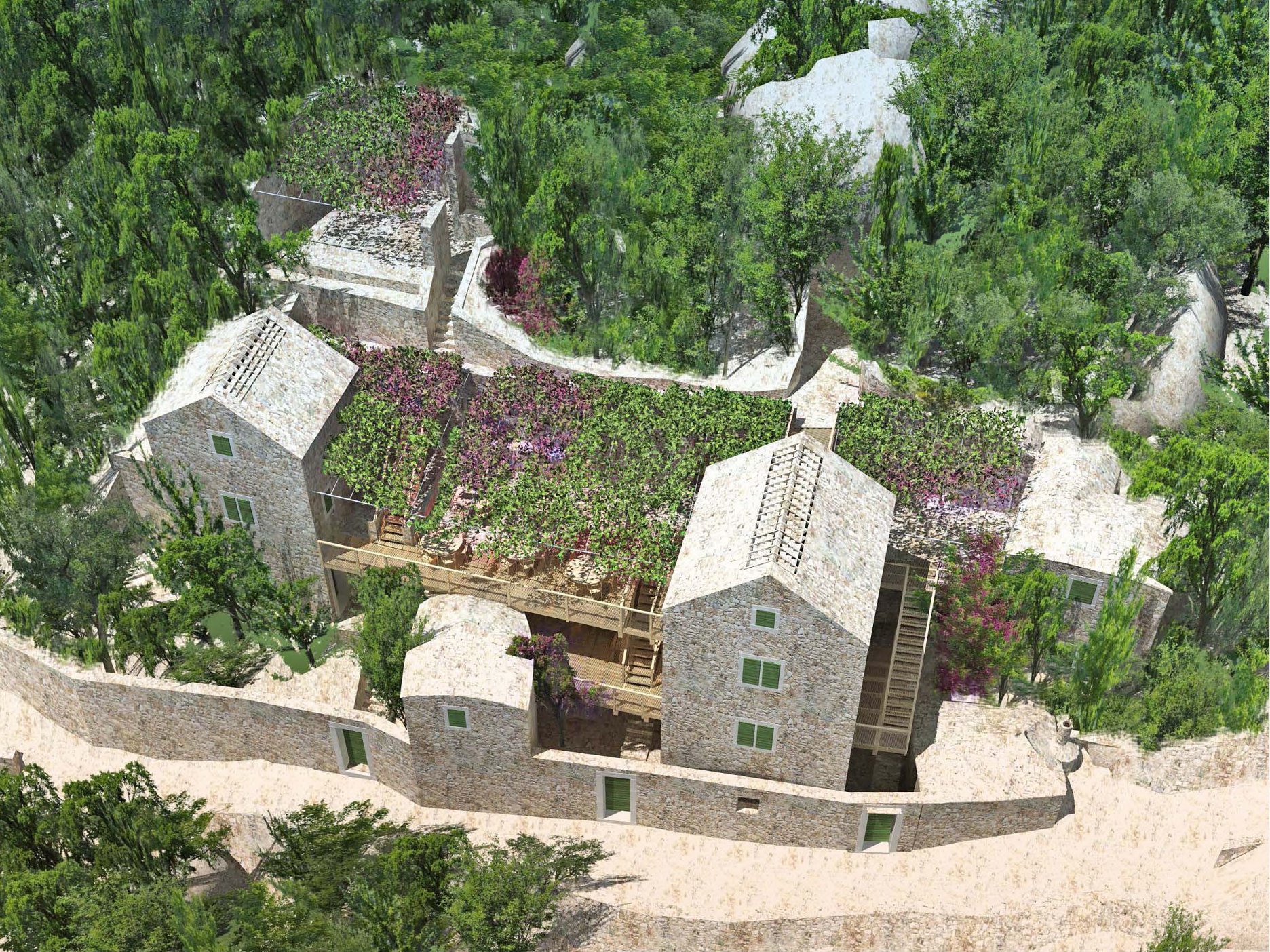 Projekt je o kontrastu a harmonii dvou témat. Jednak nově postavených nebo opravených tradičních kamenných domů - kuč. Jsou to věže ve svahu, kde můžete do každého patra vejít z terénu. Bílý vápenec, malá okna s kamenným ostěním, zelené okenice, kamenné střechy. Je v nich v létě chládek i bez klimatizace.