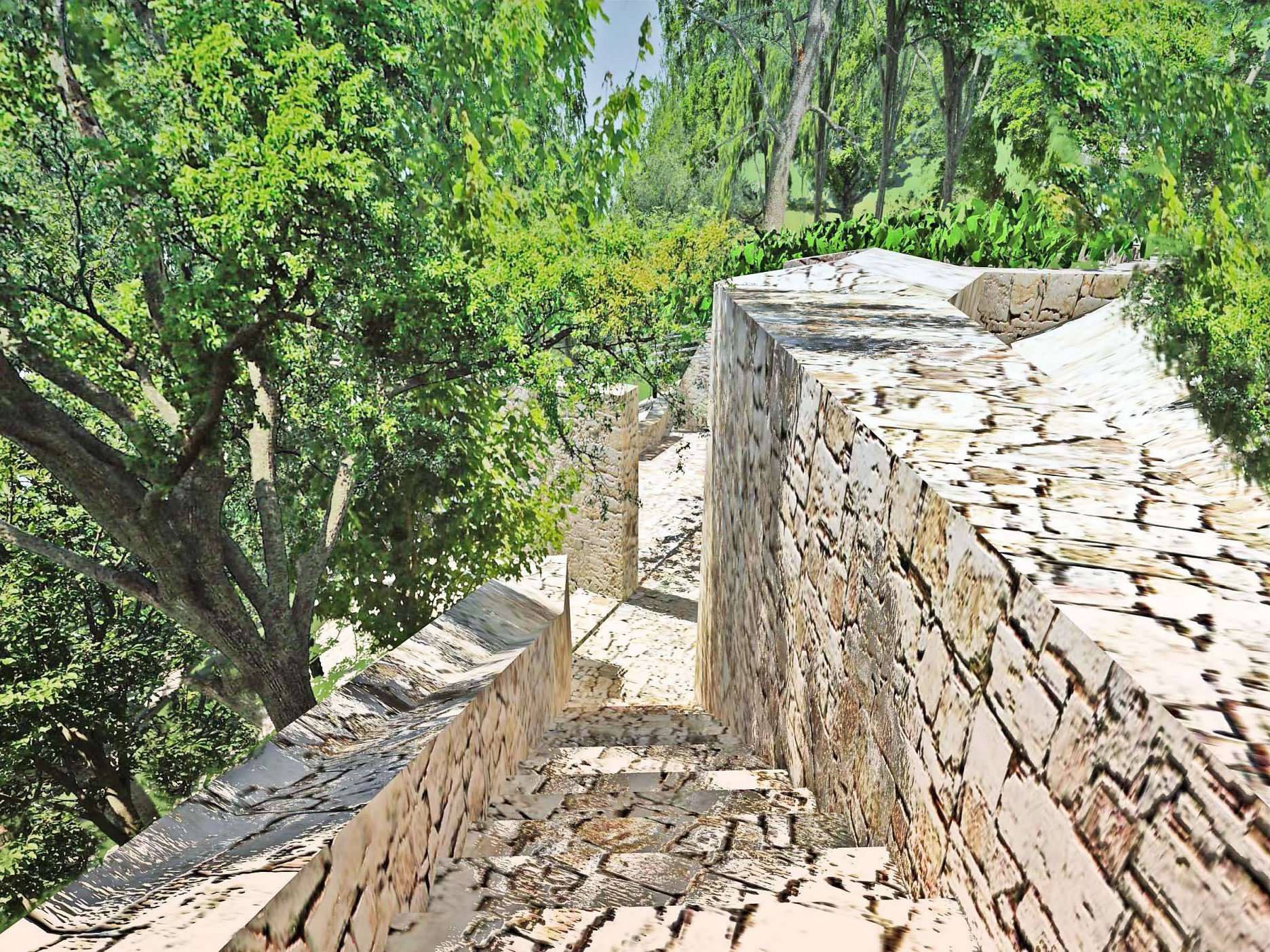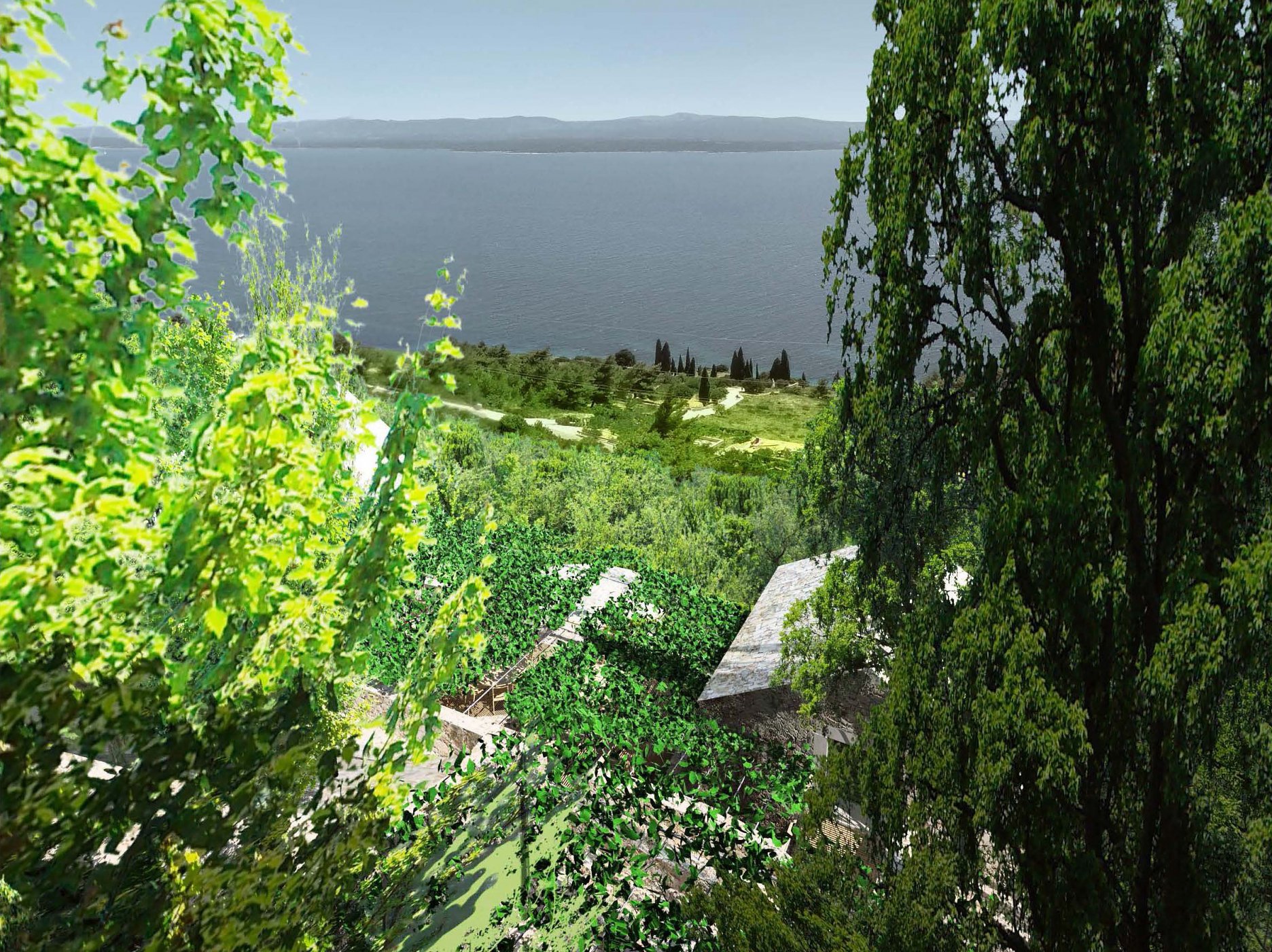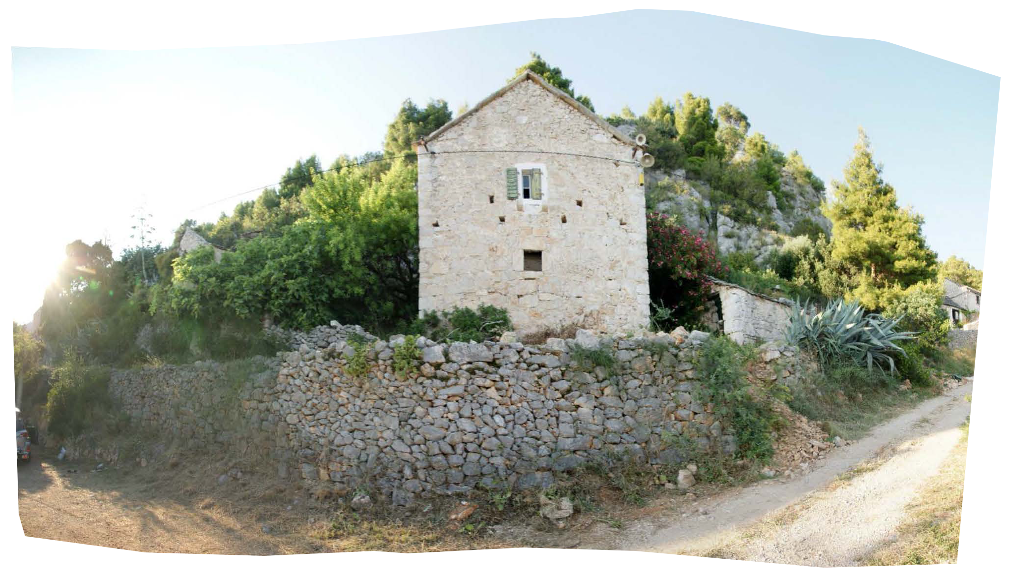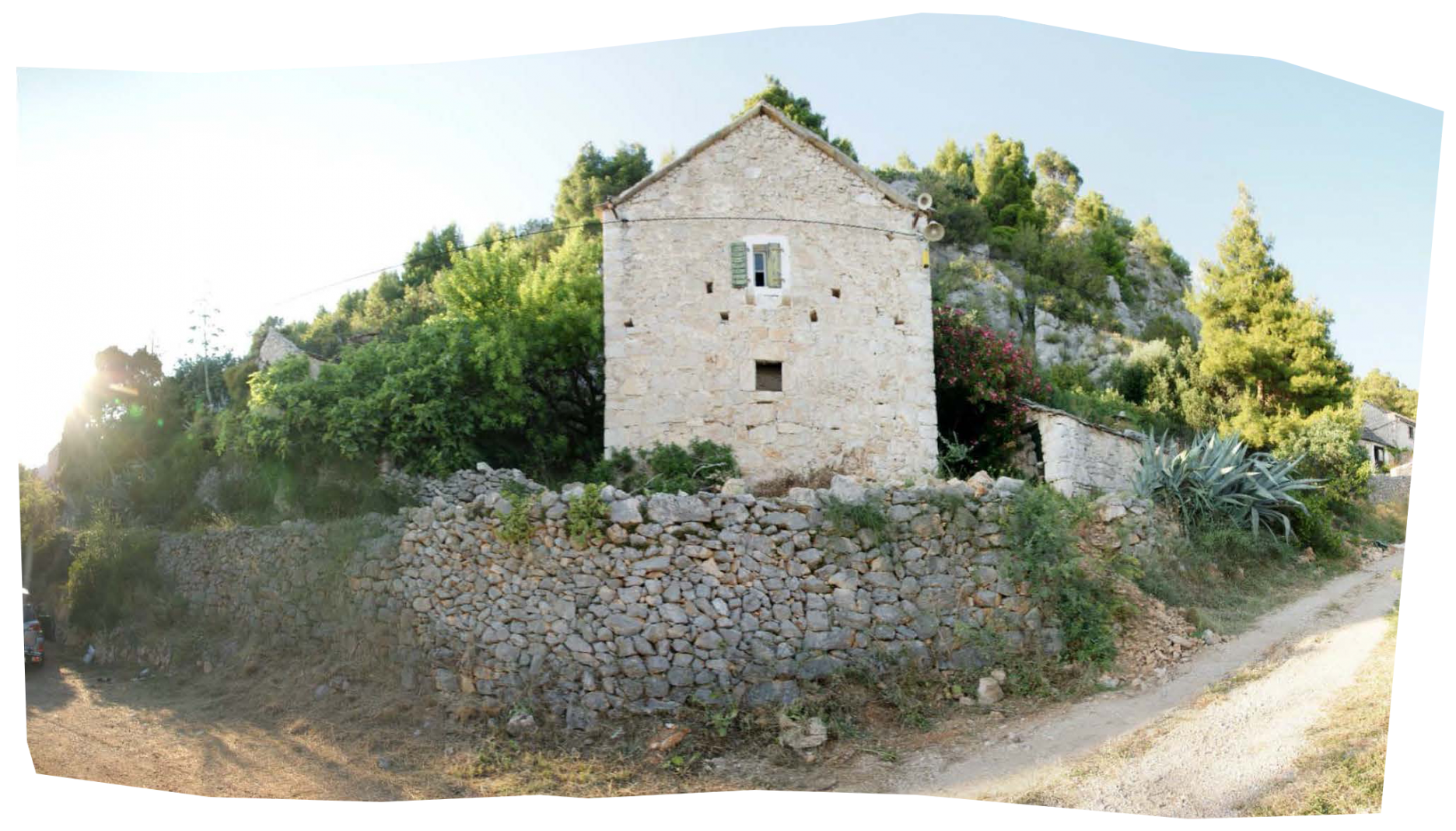 Projekt je o kontrastu a harmonii dvou témat. Jednak nově postavených nebo opravených tradičních kamenných domů - kuč. Jsou to věže ve svahu, kde můžete do každého patra vejít z terénu. Bílý vápenec, malá okna s kamenným ostěním, zelené okenice, kamenné střechy. Je v nich v létě chládek i bez klimatizace.