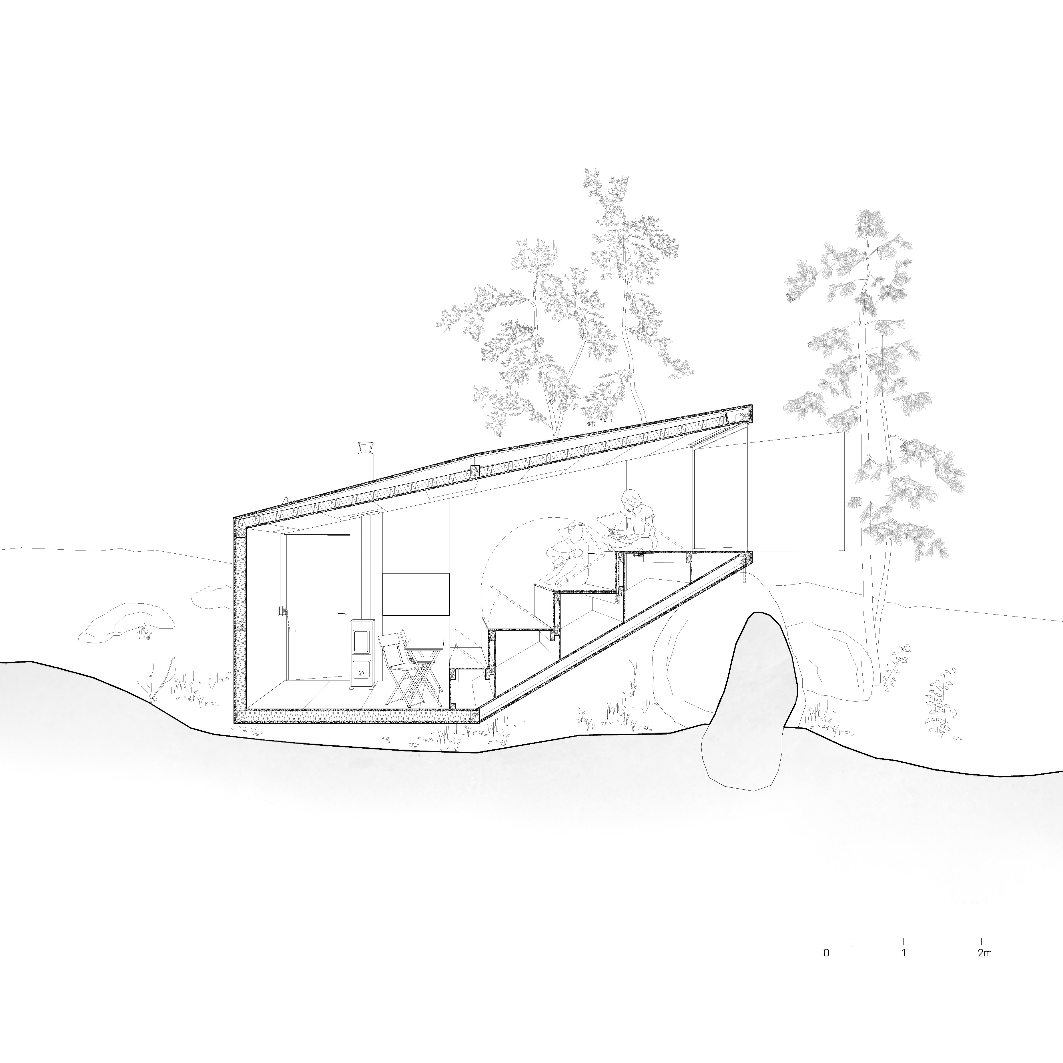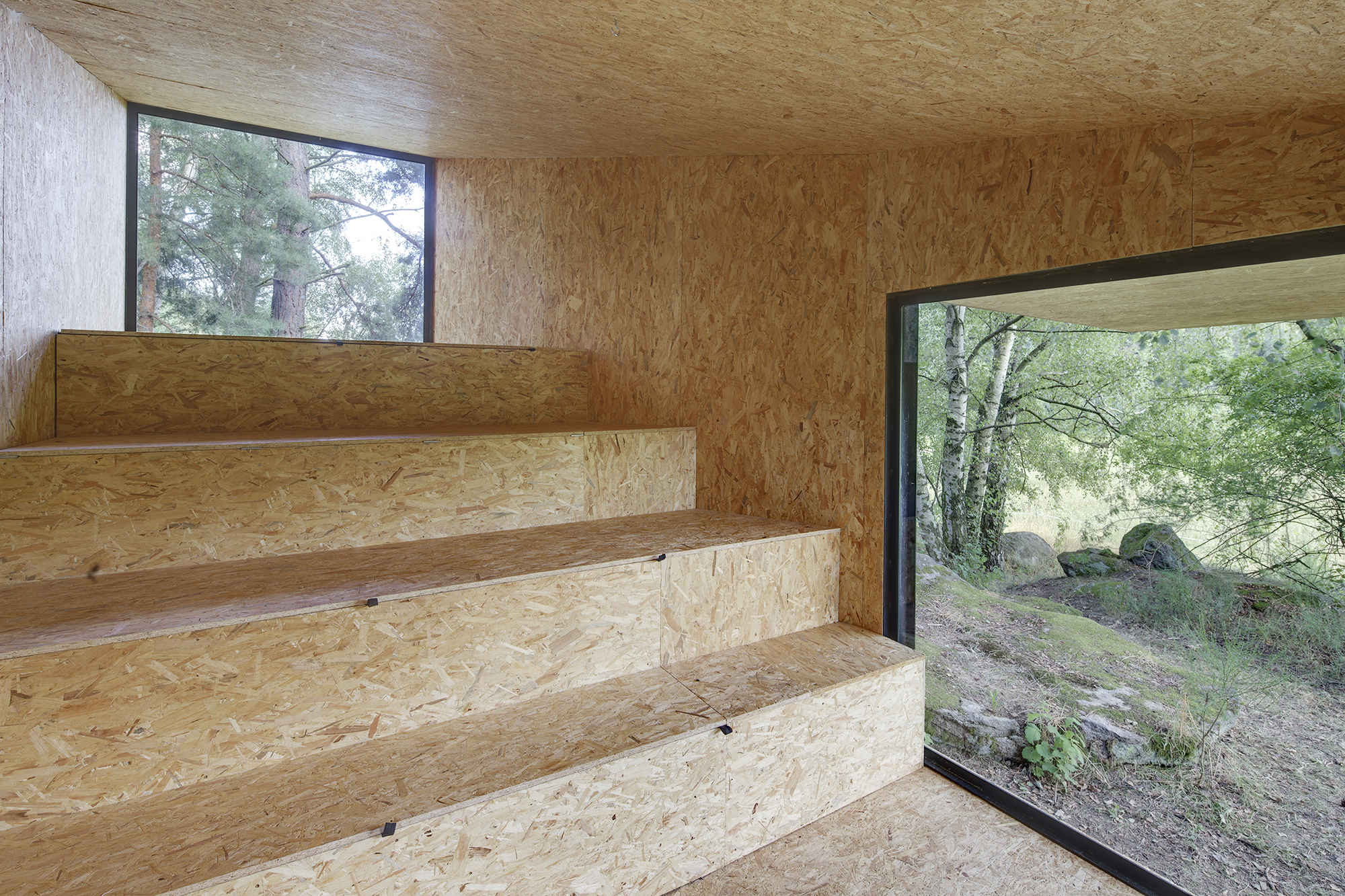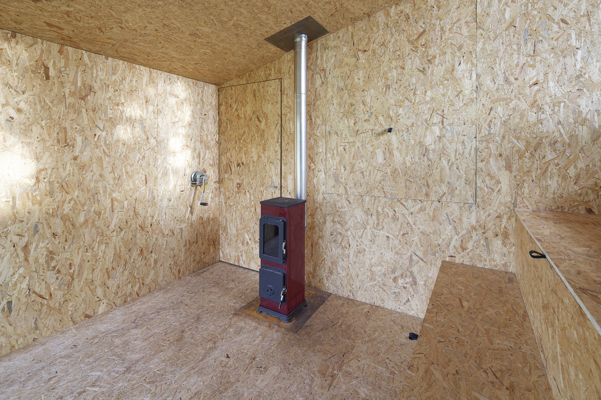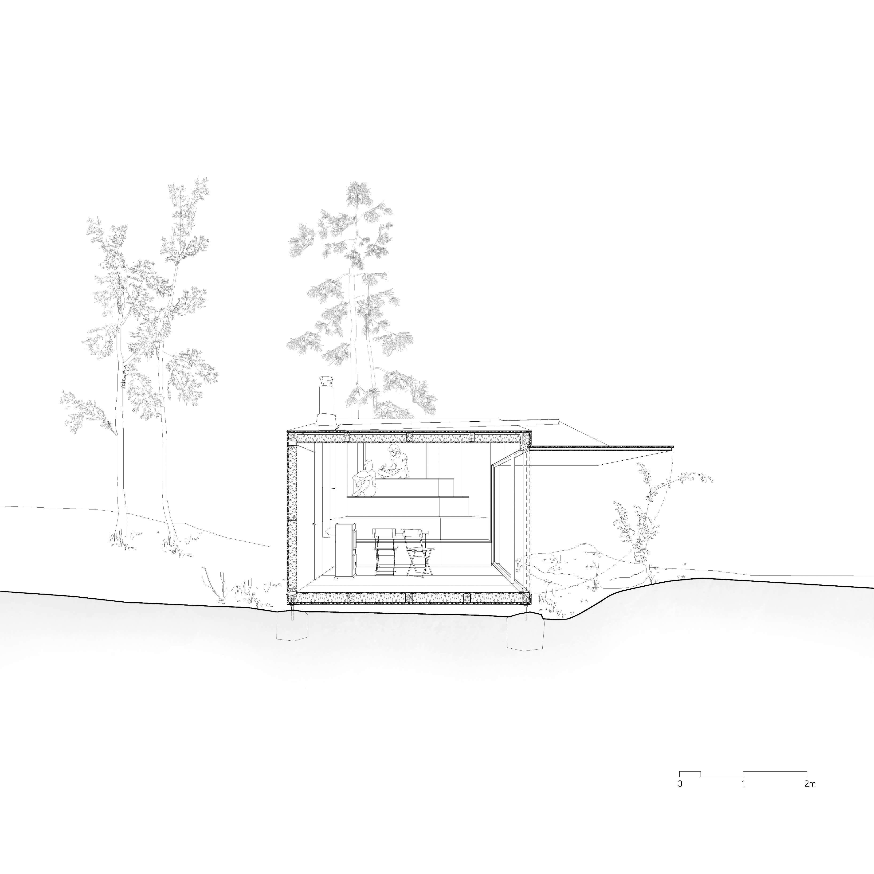 Architekti navrhli kompaktný uzavretý objem, voľne stojaci objekt na balvanoch so zdvihnutou zadnou časťou, položenou na veľkom balvane. Uzavretý čierny objekt z opáleného dreva vo vnútri skrýva jeden spojitý vnútorný priestor s rozmermi 3,1x 5,8m. Rovná plocha vo vstupnej časti je dlhá 2,3m s výškou tak akurát pre stojaceho človeka. Je otvorená okoliu veľkou presklenou plochou. Zvyšok dĺžky objektu je stupňovito zdvihnutý k otvoru smerom do korún stromov a je zakončený plochou na ležanie. Multifunkčný priestor slúži nielen na prebývanie, ale aj na menšie akcie, predstavenia, rozjímanie atď. Pod jednotlivými stupňami je úložný priestor, preklopením jednej z lavíc vzniká druhé dvojlôžko. Oba presklenné otvory sa zatvárajú veľkými okenicami, ten väčší pomocou kladky a navijaka s kľukou. Pre chladnejšie obdobie je stavba vybavená malými kachľami zaústenými do plechového komína. Piecka môže slúžiť aj ako jednoduchý sporák na prípravu jednoduchého jedla alebo čaju.