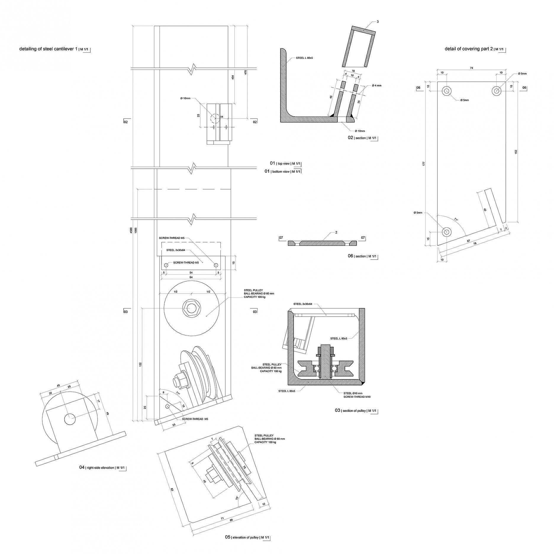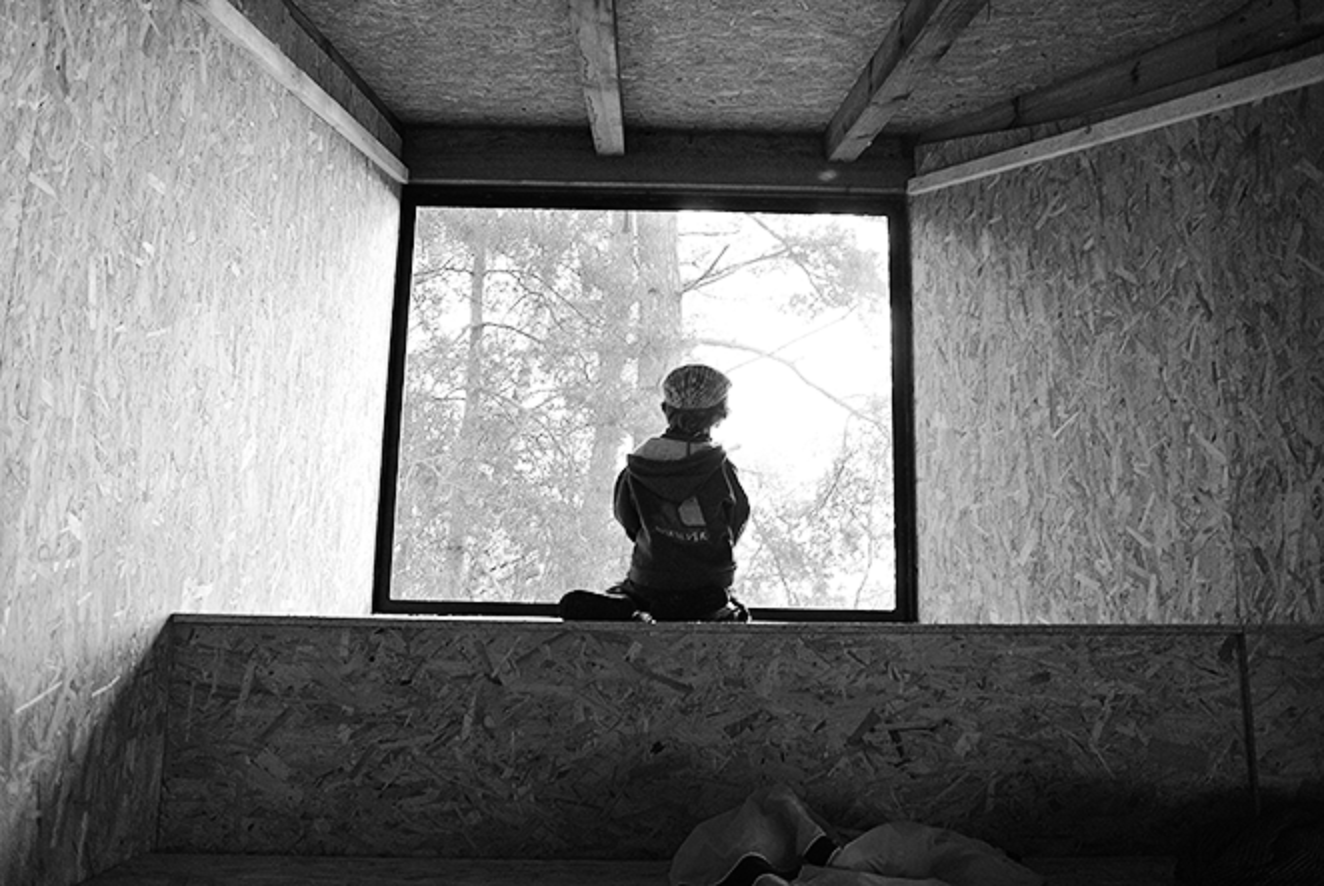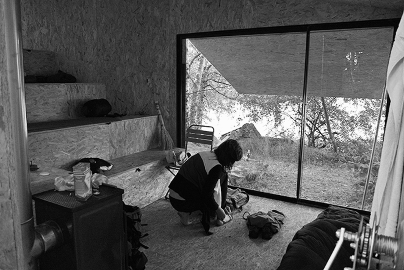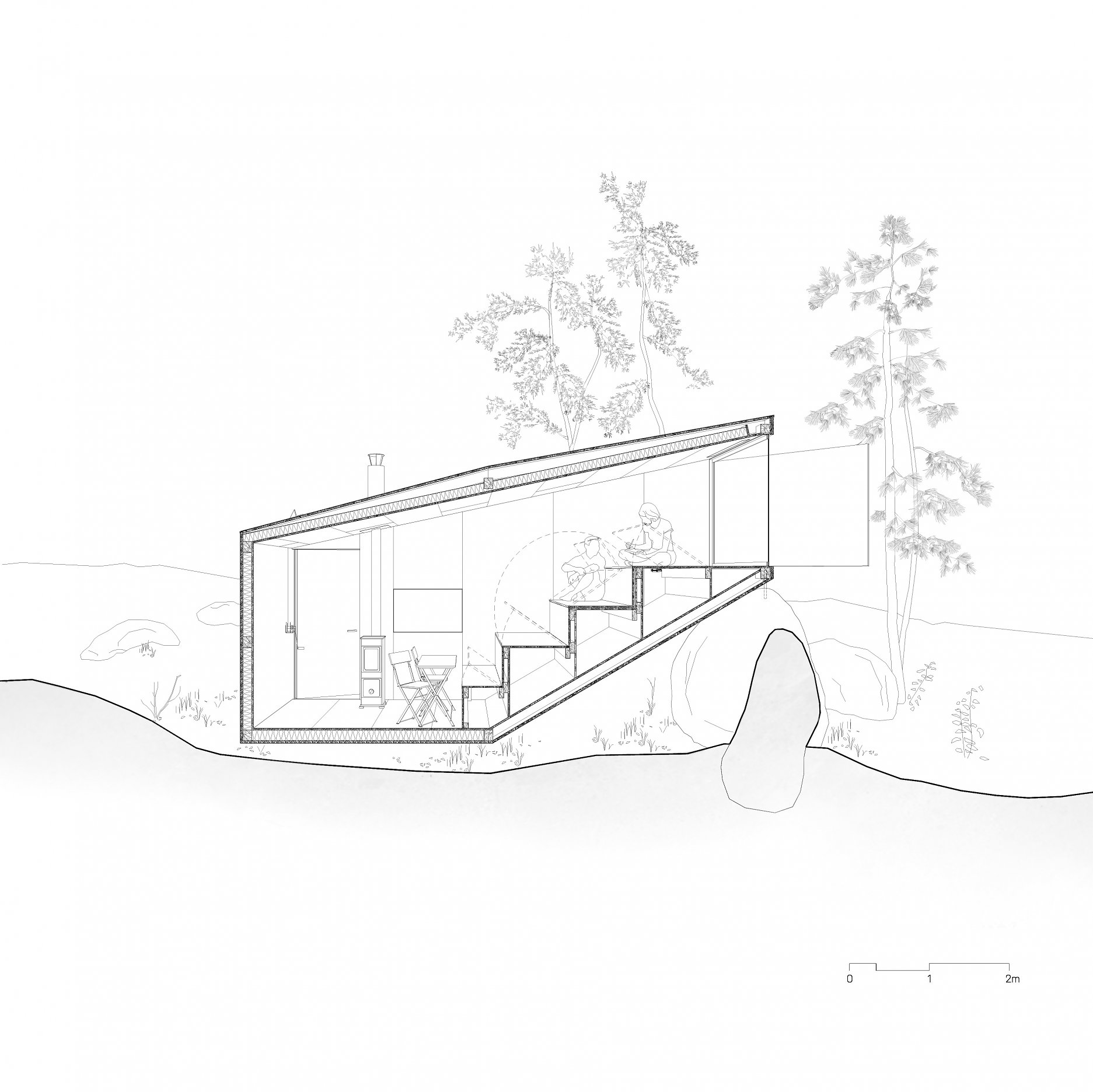 Architekti navrhli kompaktný uzavretý objem, voľne stojaci objekt na balvanoch so zdvihnutou zadnou časťou, položenou na veľkom balvane. Uzavretý čierny objekt z opáleného dreva vo vnútri skrýva jeden spojitý vnútorný priestor s rozmermi 3,1x 5,8m. Rovná plocha vo vstupnej časti je dlhá 2,3m s výškou tak akurát pre stojaceho človeka. Je otvorená okoliu veľkou presklenou plochou. Zvyšok dĺžky objektu je stupňovito zdvihnutý k otvoru smerom do korún stromov a je zakončený plochou na ležanie. Multifunkčný priestor slúži nielen na prebývanie, ale aj na menšie akcie, predstavenia, rozjímanie atď. Pod jednotlivými stupňami je úložný priestor, preklopením jednej z lavíc vzniká druhé dvojlôžko. Oba presklenné otvory sa zatvárajú veľkými okenicami, ten väčší pomocou kladky a navijaka s kľukou. Pre chladnejšie obdobie je stavba vybavená malými kachľami zaústenými do plechového komína. Piecka môže slúžiť aj ako jednoduchý sporák na prípravu jednoduchého jedla alebo čaju.