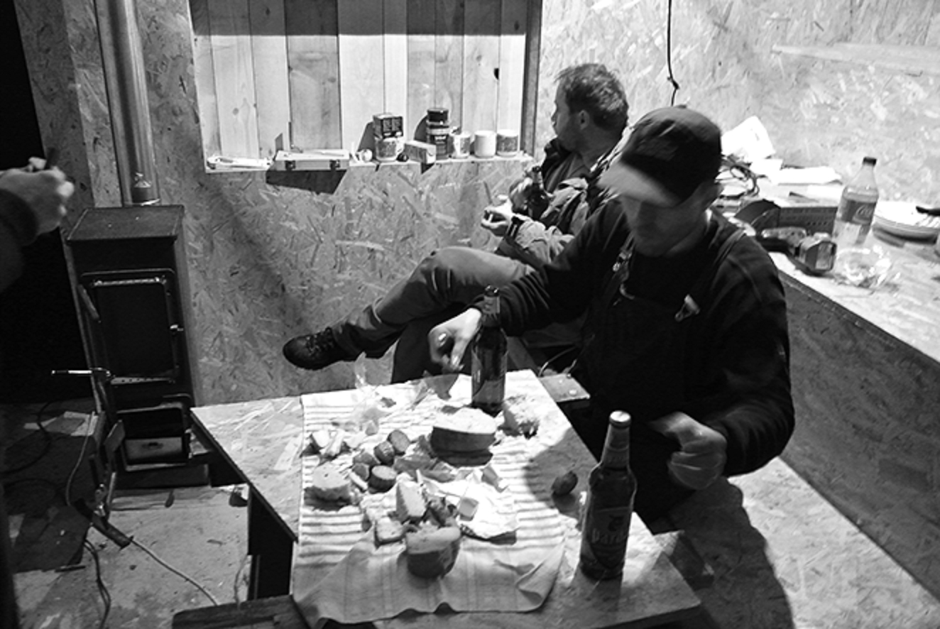 Základnou nosnou kostrou útulne je rámová konštrukcia, ktorá vznika v spolupráci s miestnymi tesármi. Zvonka je kostra obitá doskami s polodrážkou, ktoré boli následne opálené plynovým horákom. Materiál na dosky i trámiky pochádza z blízkeho polomu. Vnútorný priestor je úplne opláštený OSB doskami, ktoré zároveň konštrukciu spevňujú. Strecha je prekrytá dvoma vrstvami asfaltových pásov. Odvodnenie obstaráva našikmo uložený oceľový L profil, ktorý je zároveň v časti nad veľkým oknom konzolou pre osadenie vodiacich kolies kladky. Všetky oceľové prvky pripravil podľa vypracovanej dokumentácie zámočník s blízkej dediny.
