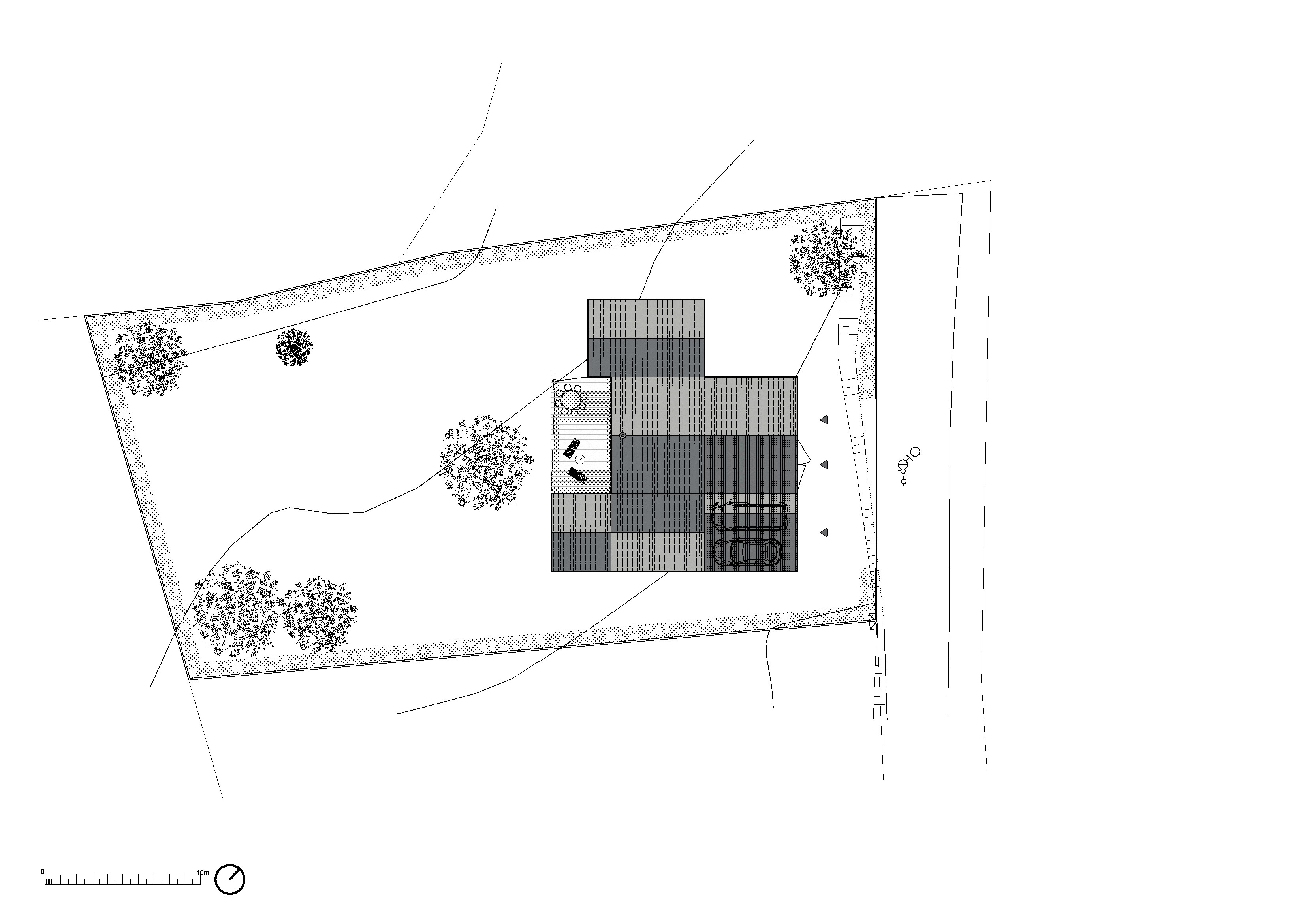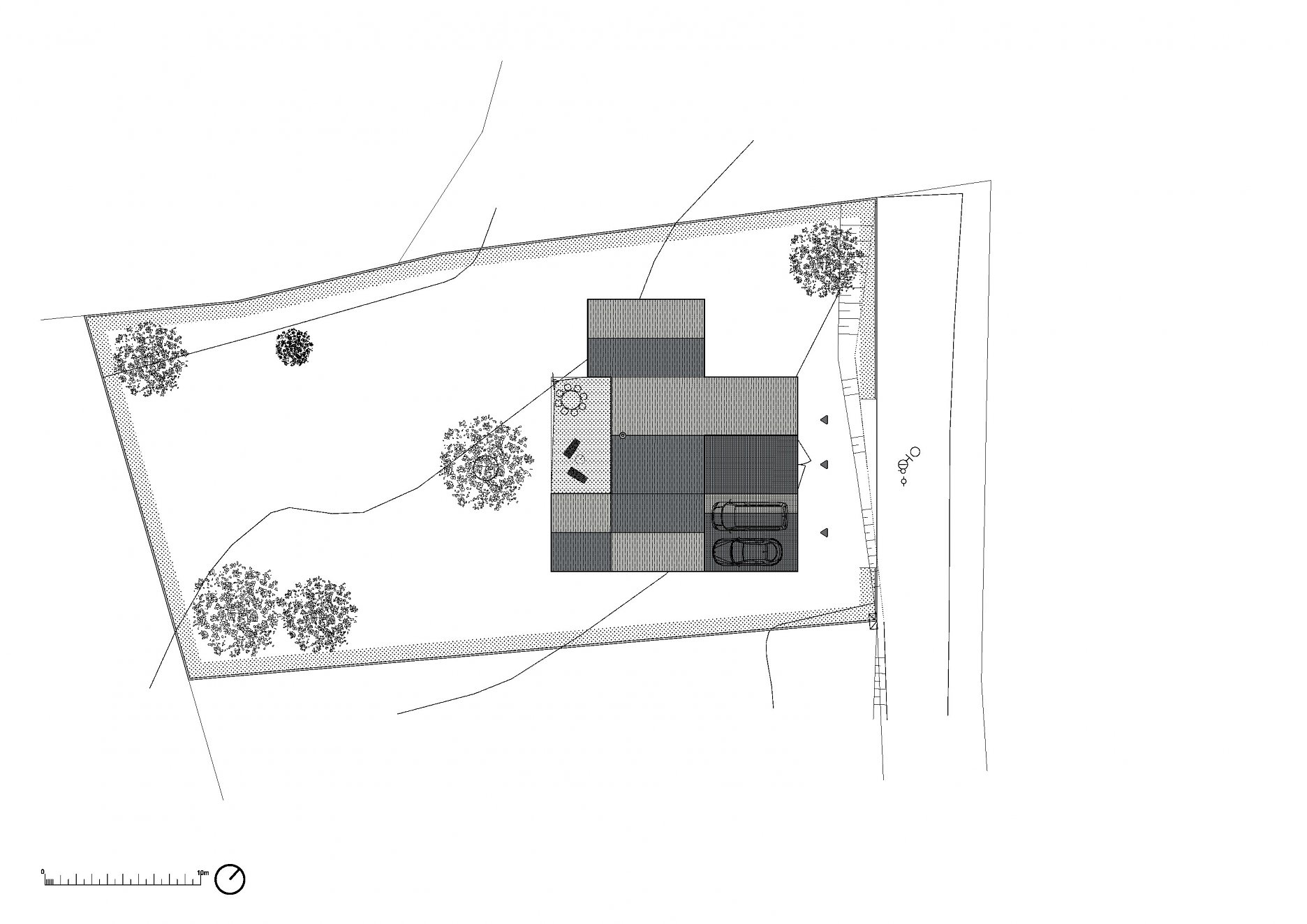 Na stavbu nadväzuje južná terasa, v rohu ktorej je situovaný stĺp. Slúži ako kotviaci bod pre pletivo zelenej pergoly, je v ňom integrovaná záhradná sprcha a na špičke sa otáča vrtuľa malej veternej elektrárne.