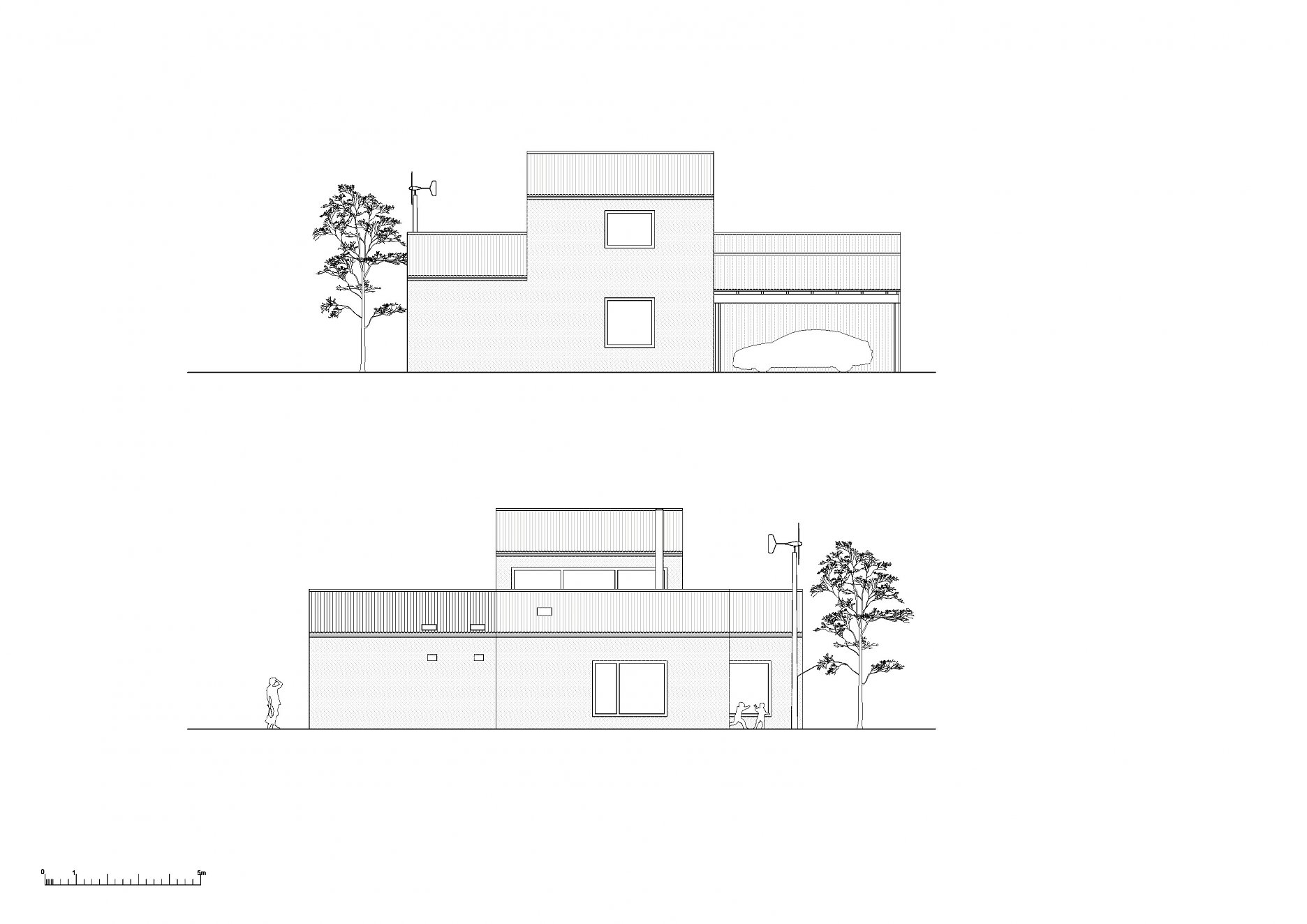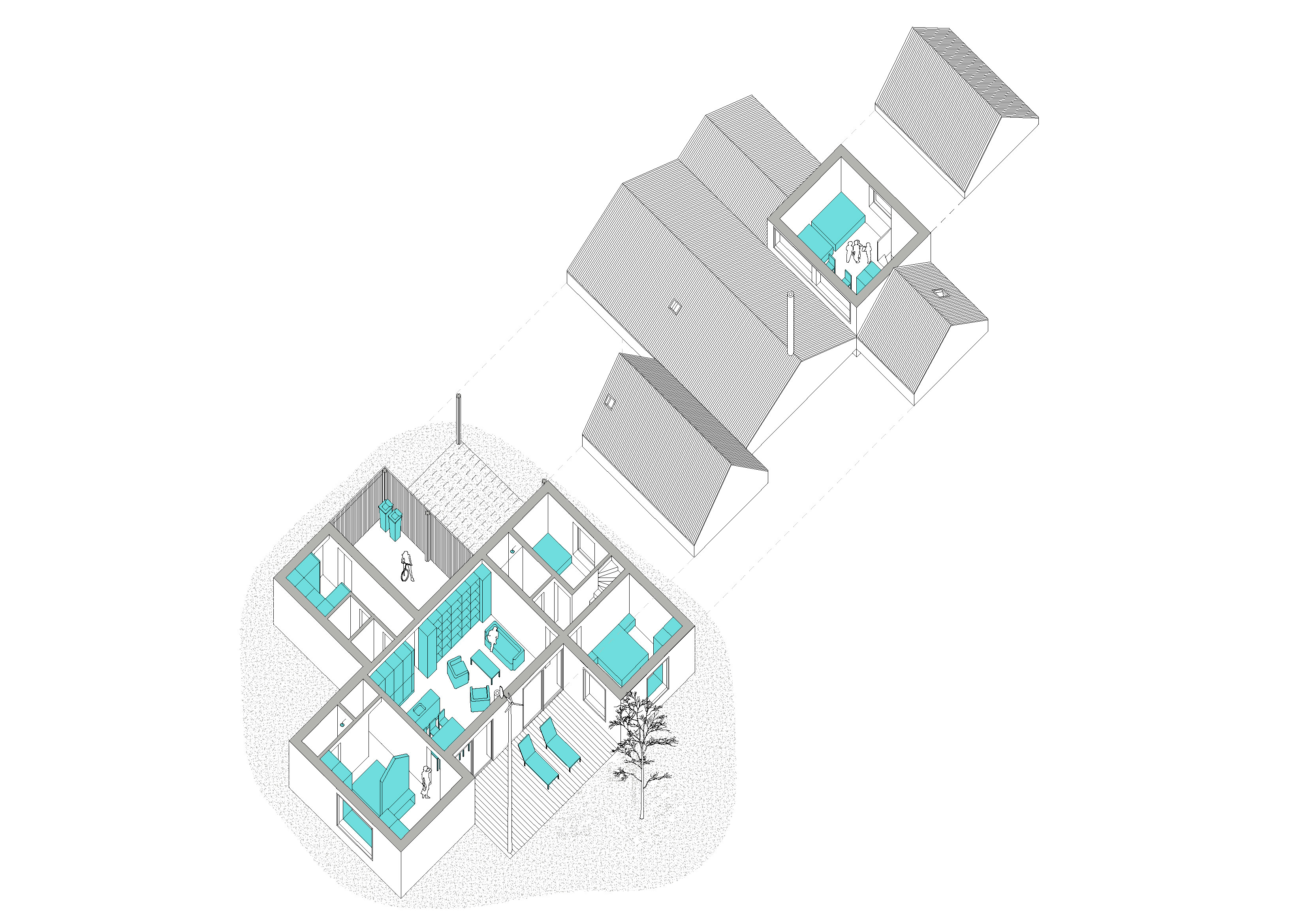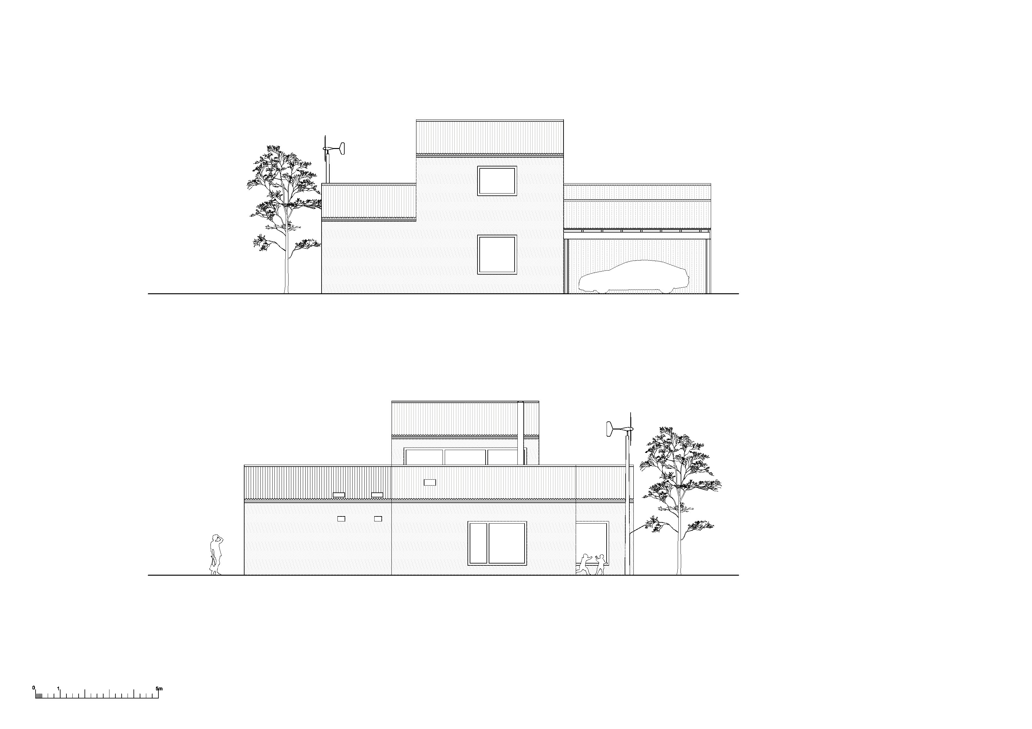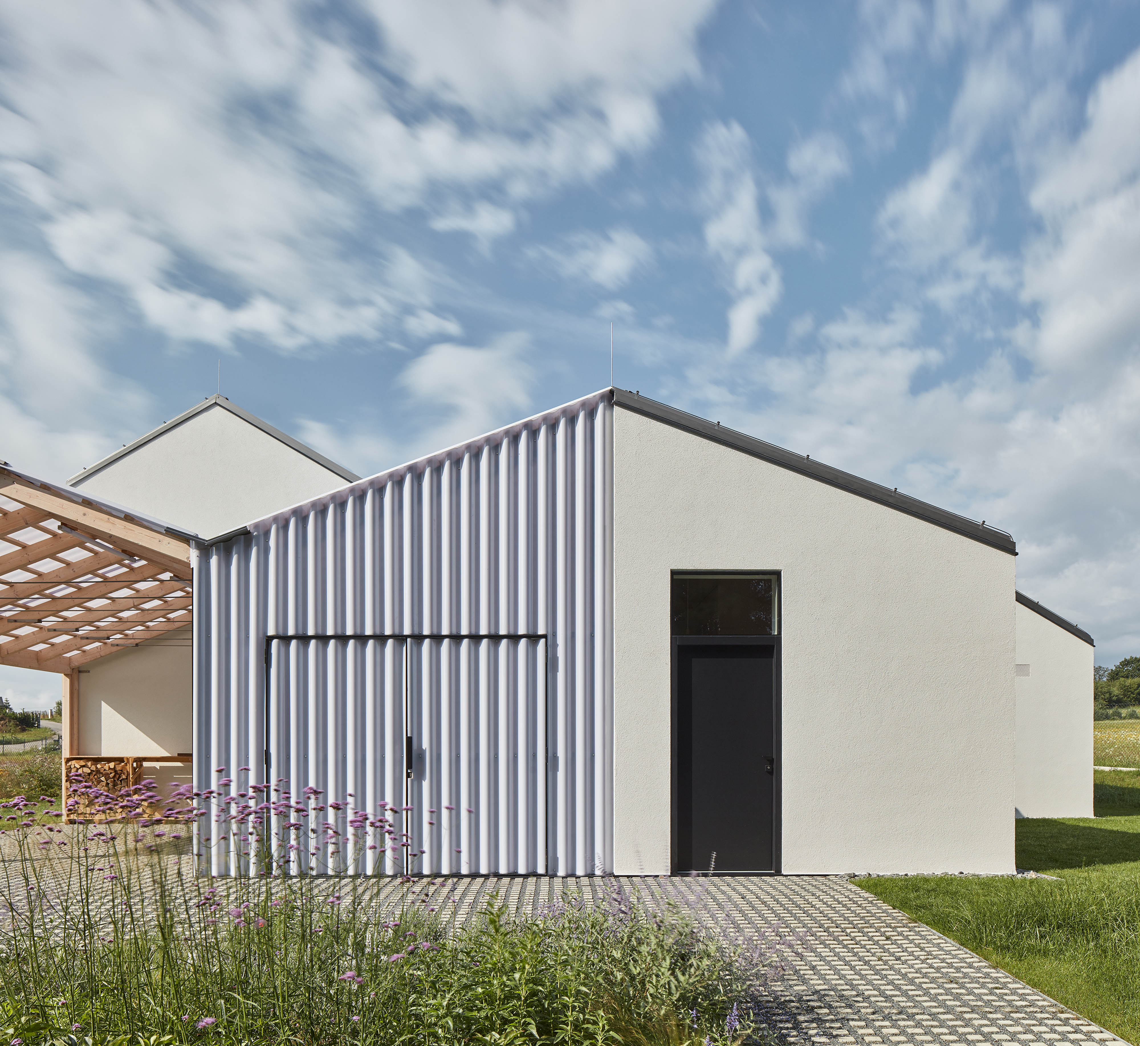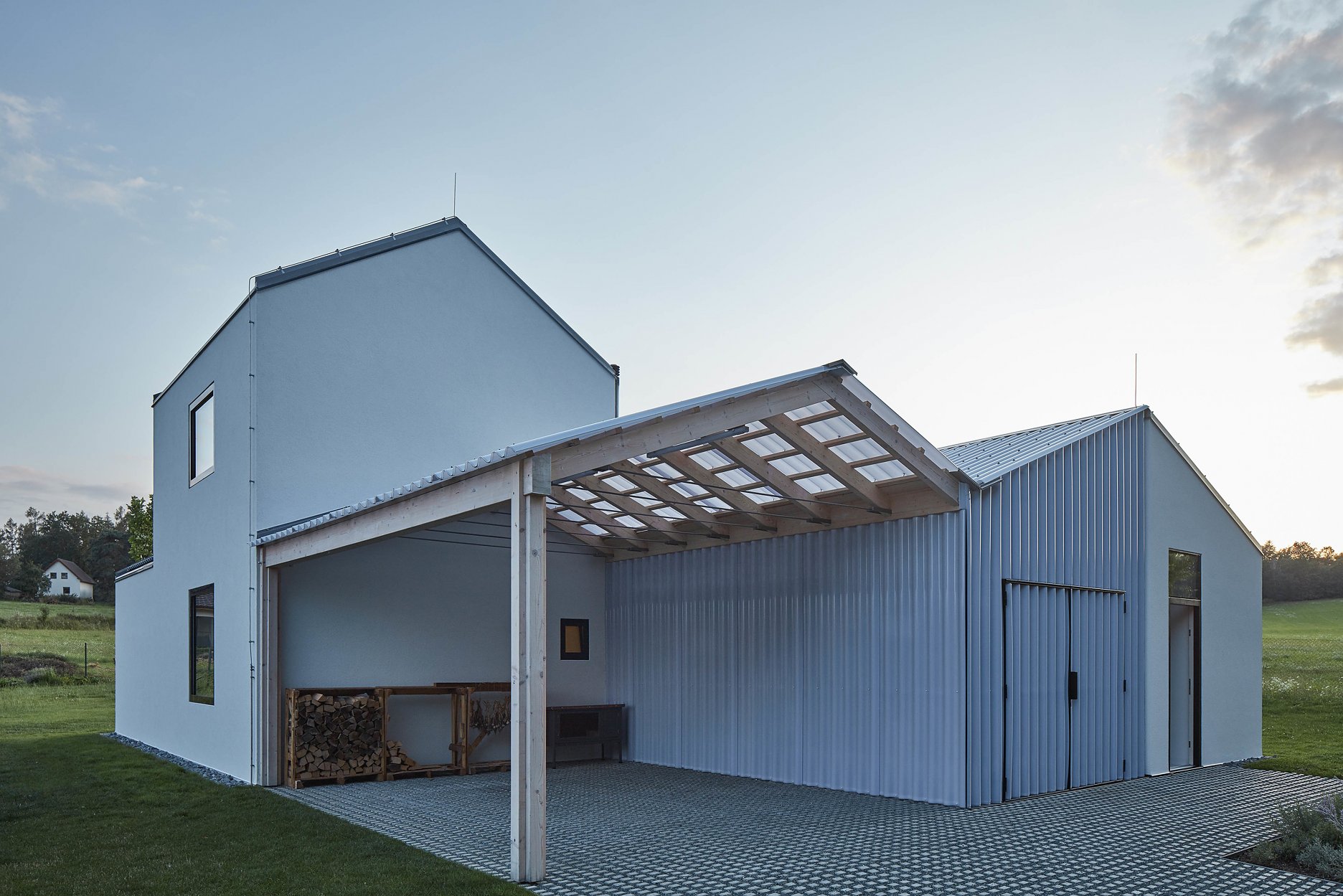 Hmoty obytných častí dopĺňajú vstupné priestory so zázemím, kôlňa s dielňou a kryté parkovacie státie.