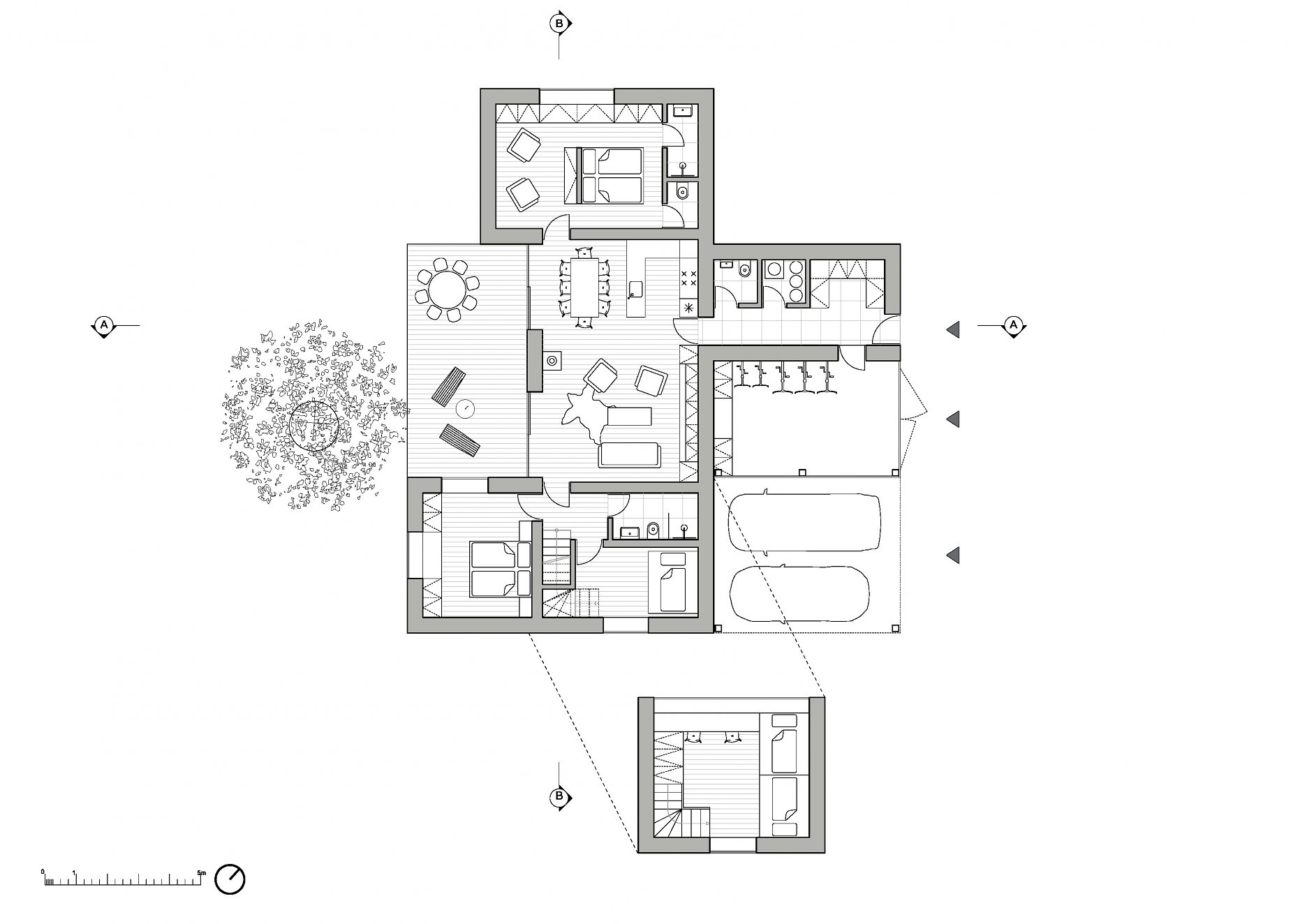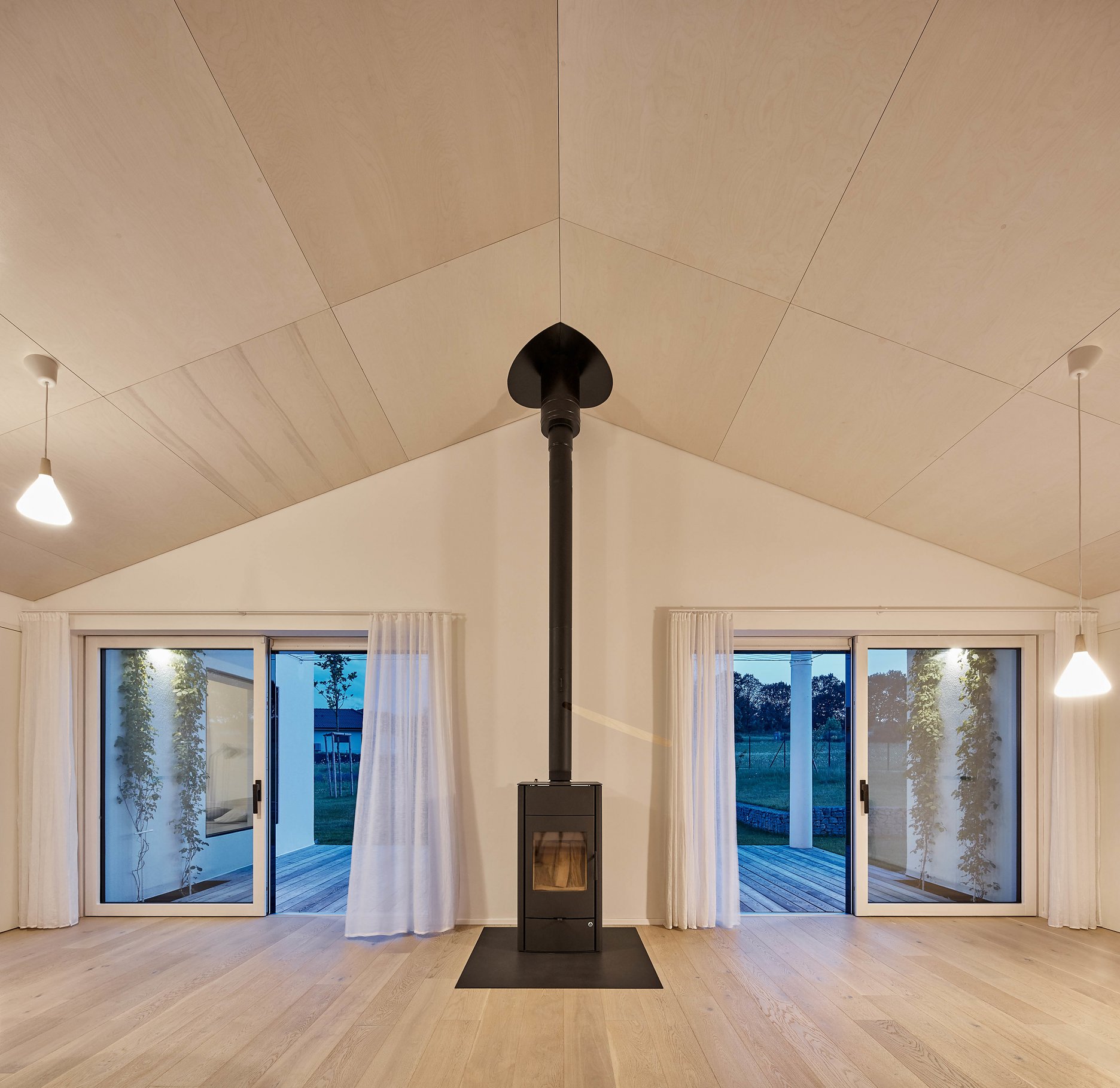 Dispozícia sa odvíja od centrálnej časti domu, ktorá zahŕňa obývaciu izbu s krbom, jedáleň a kuchyňu. Priestor sa prostredníctvom rozmerného posuvného zasklenia otvára do záhrady.