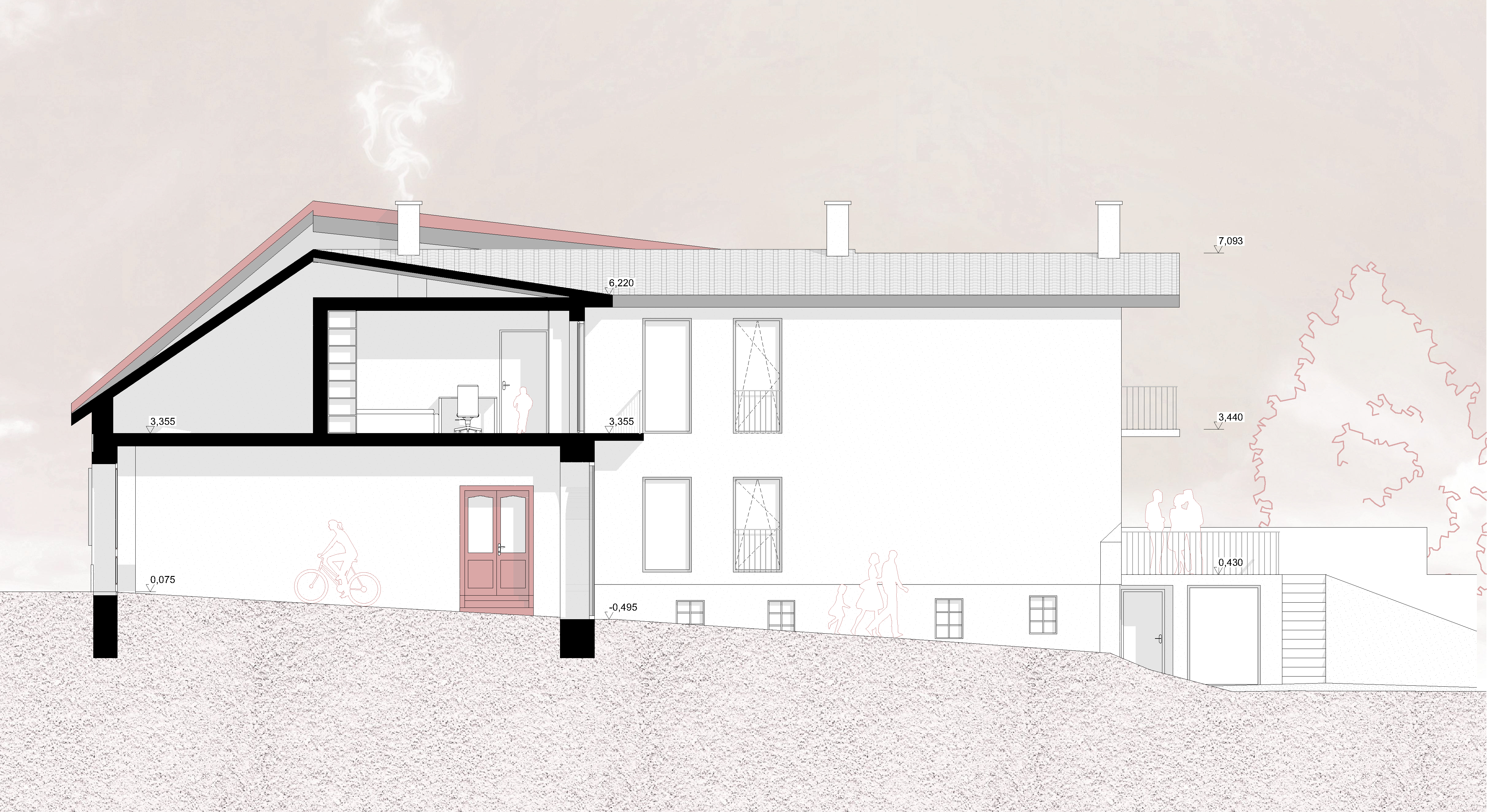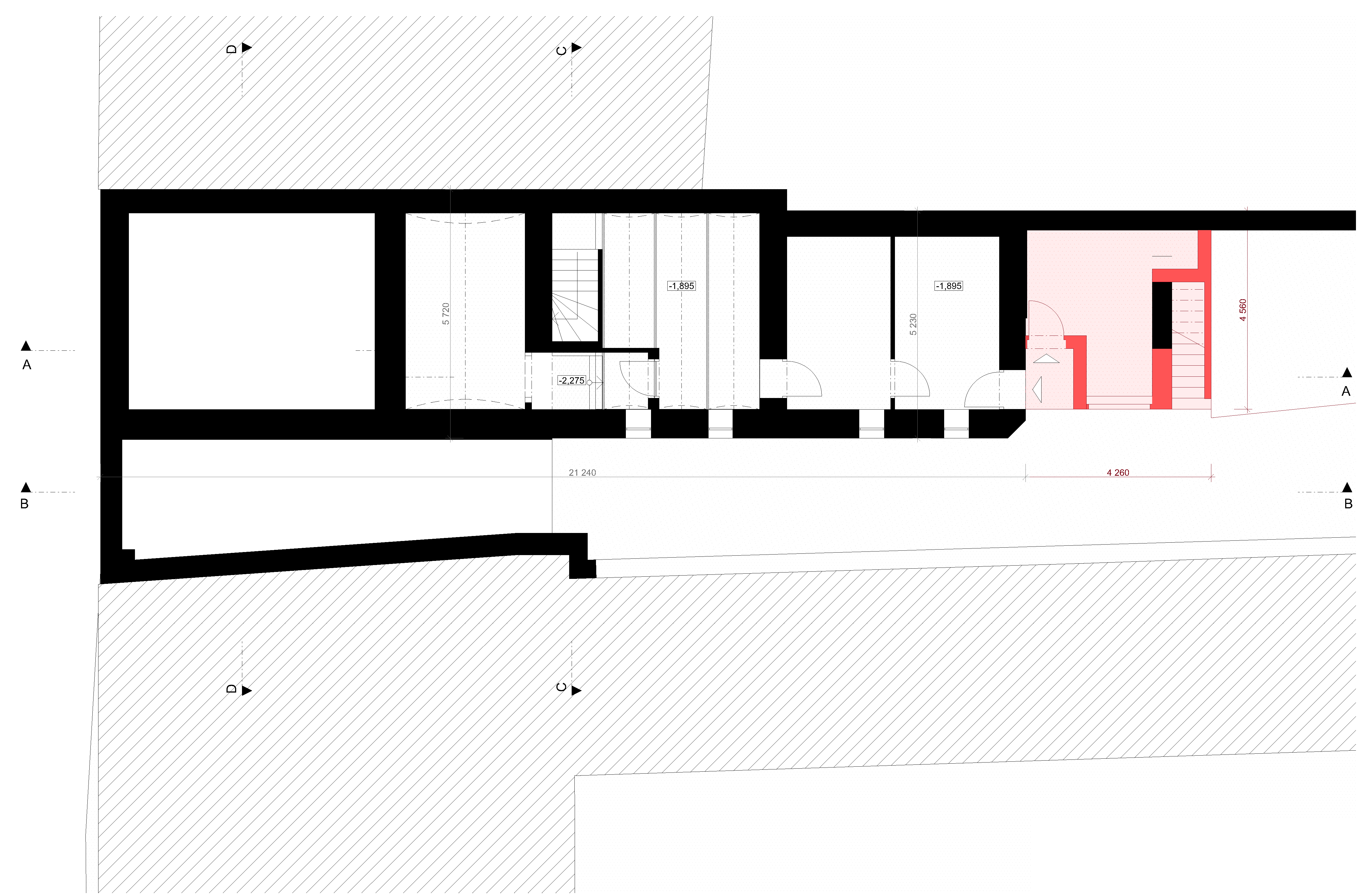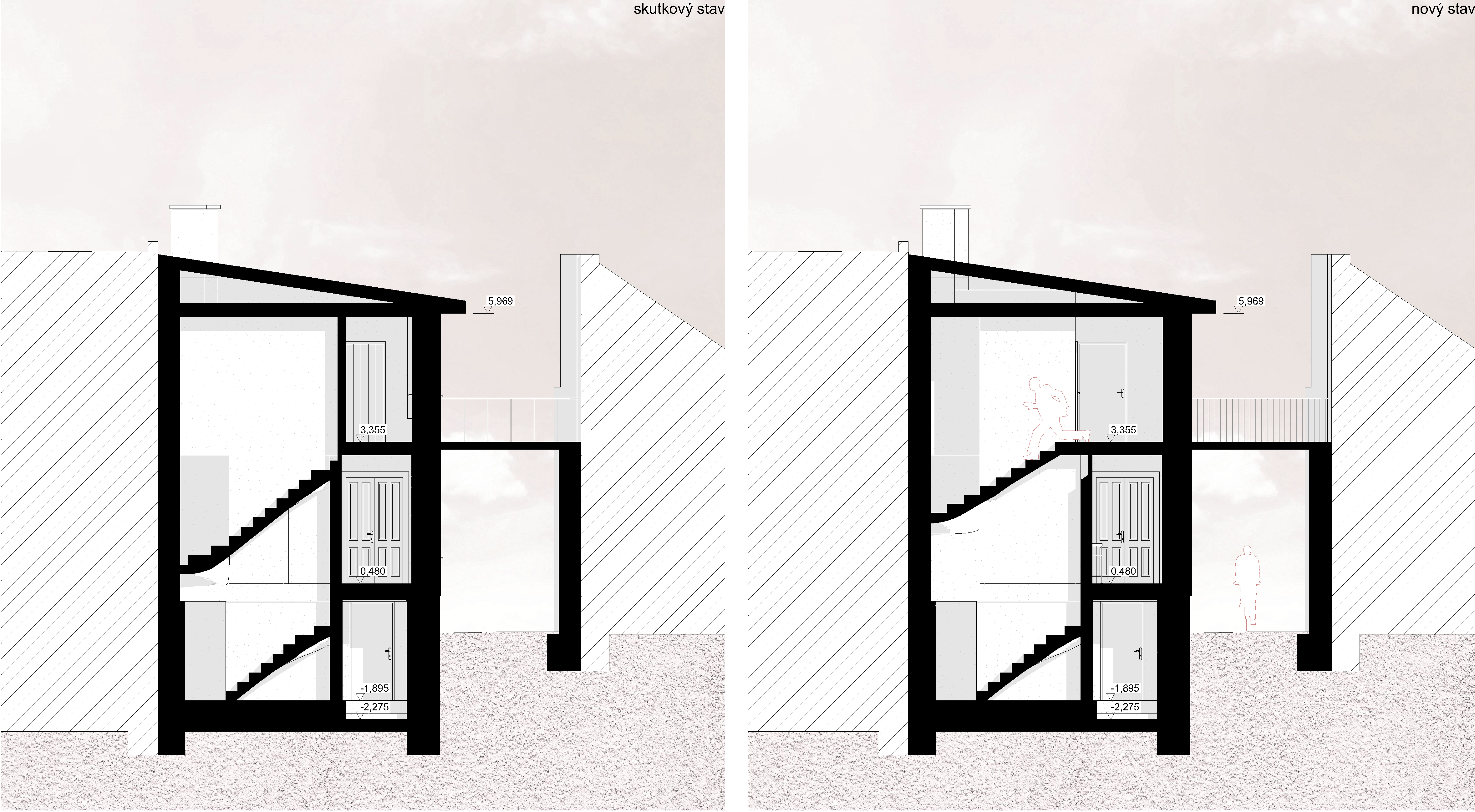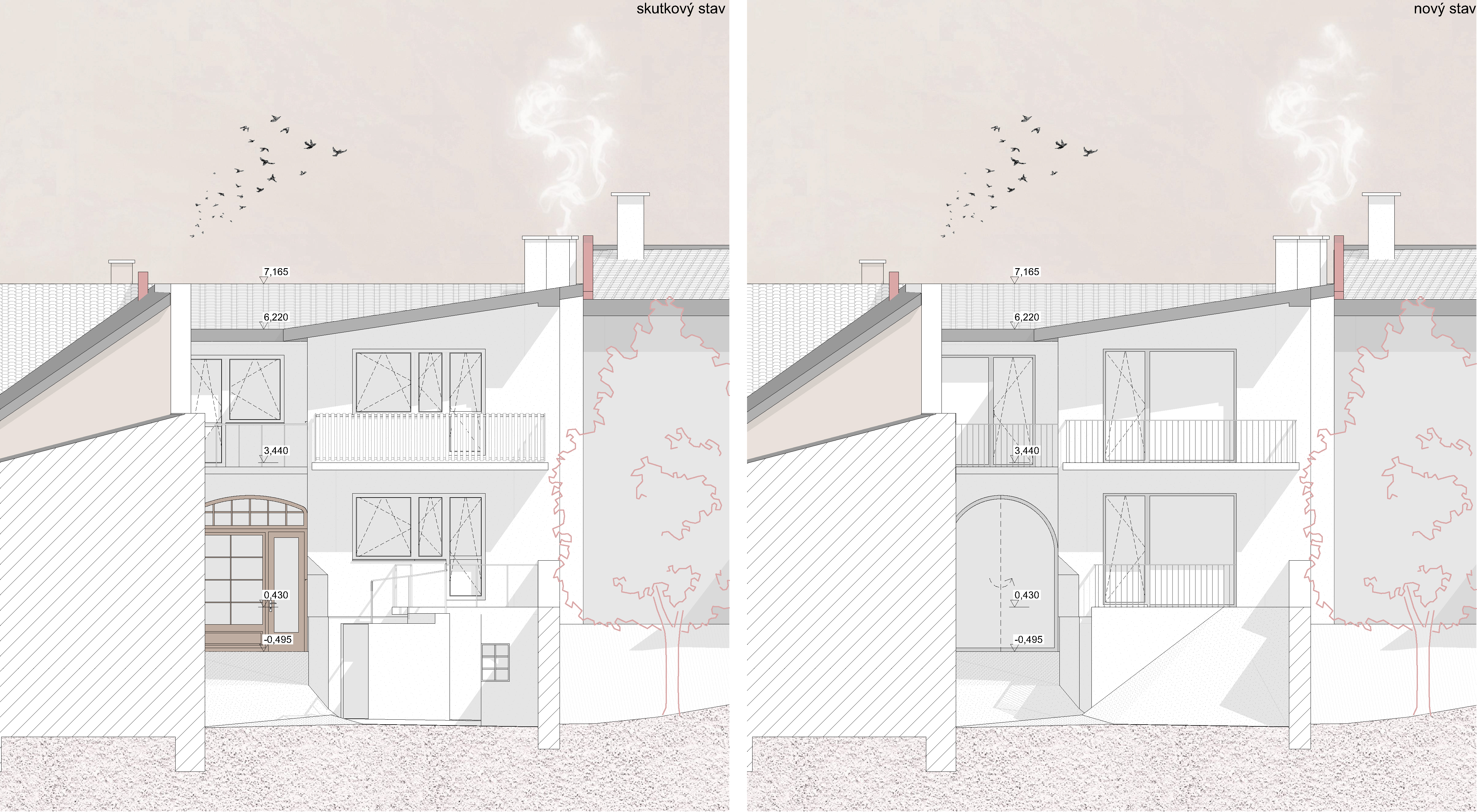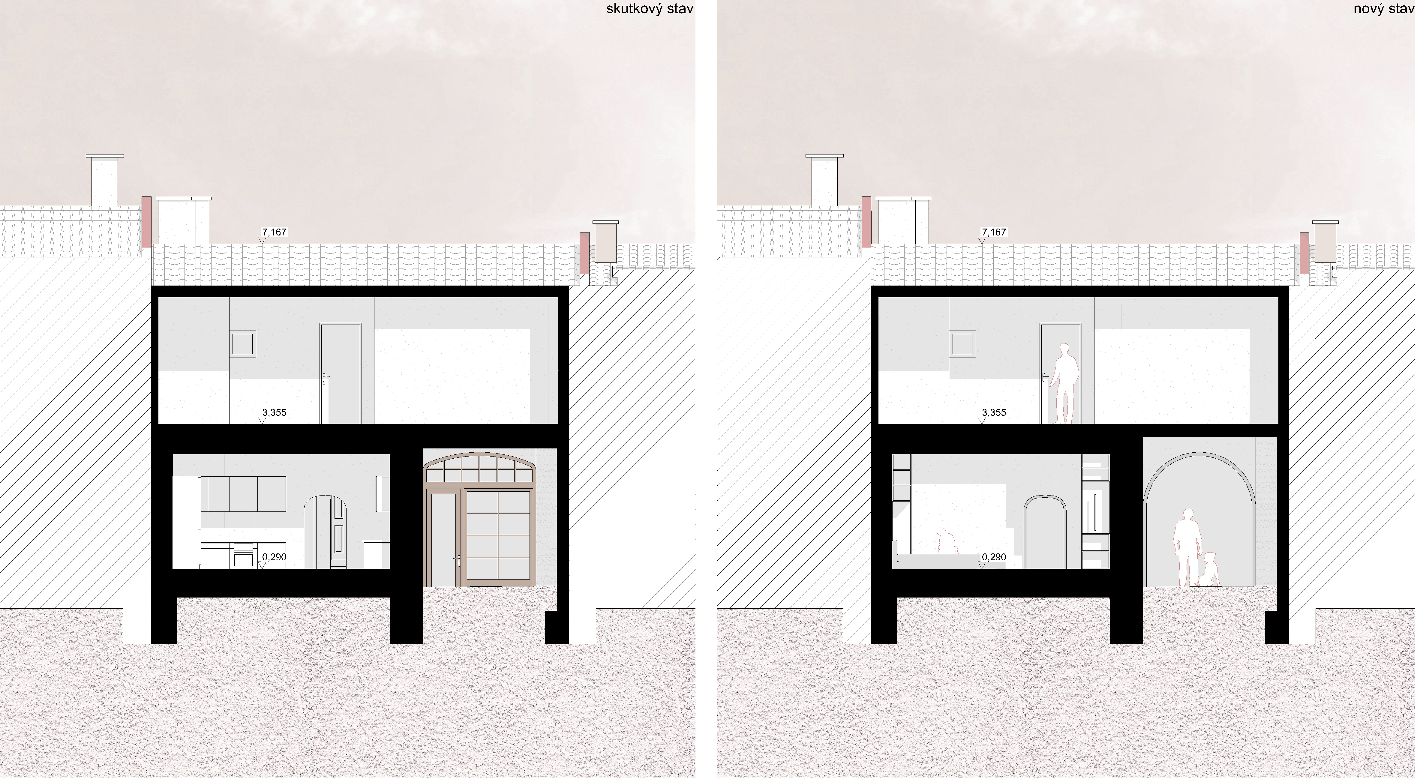Suterénna časť pri záhrade (tvoriaca terasu domu) je v havarijnom stave. Predmetná časť bude odstránená a nahradená novou substanciou. K novej prístavbe v úrovni suterénu sú navrhnuté zo strany záhrady aj nové terénne úpravy. Vďaka týmto úpravám je zabezpečený plynulý prechod z terasy do záhrady bez požitia schodiska. Z bočnej strany násypu je navrhnuté exteriérové schodisko, ktoré zabezpečuje plynulejší prechod z existujúceho terénu na terasu, ako je tomu v skutkovom stave. K schodisku navrhujeme prihrnúť zeminu, ktorá bude zatrávnená a bude tvoriť plynulý prechod z terasy do záhrady. V zimnom období môže zvýšený terén slúžiť na sánkovanie pre deti