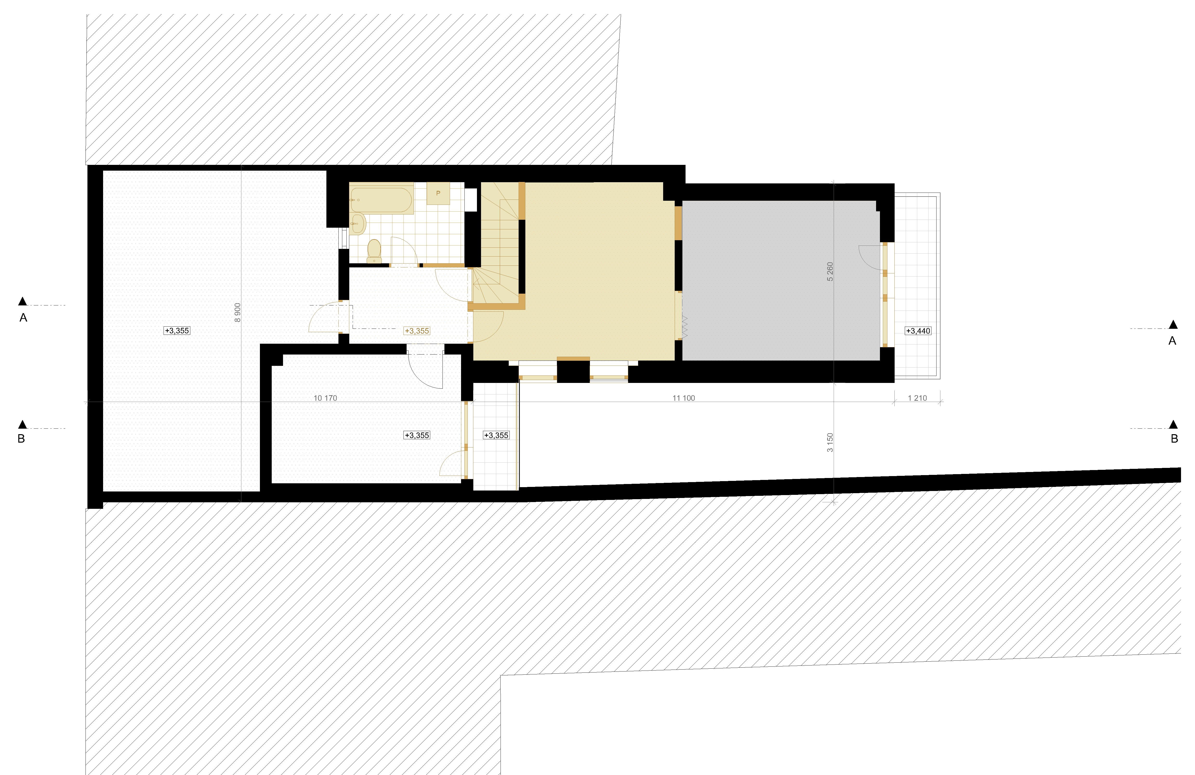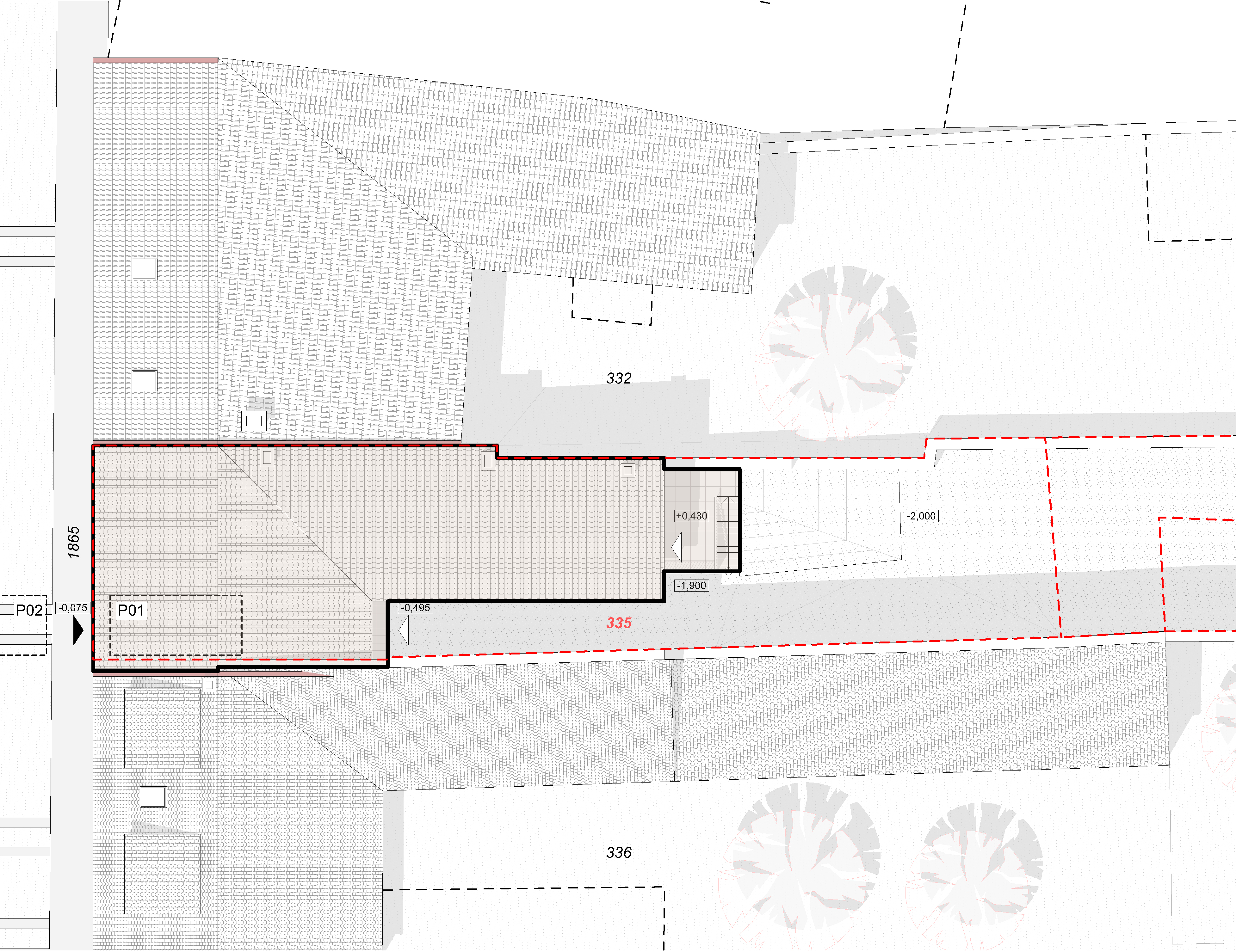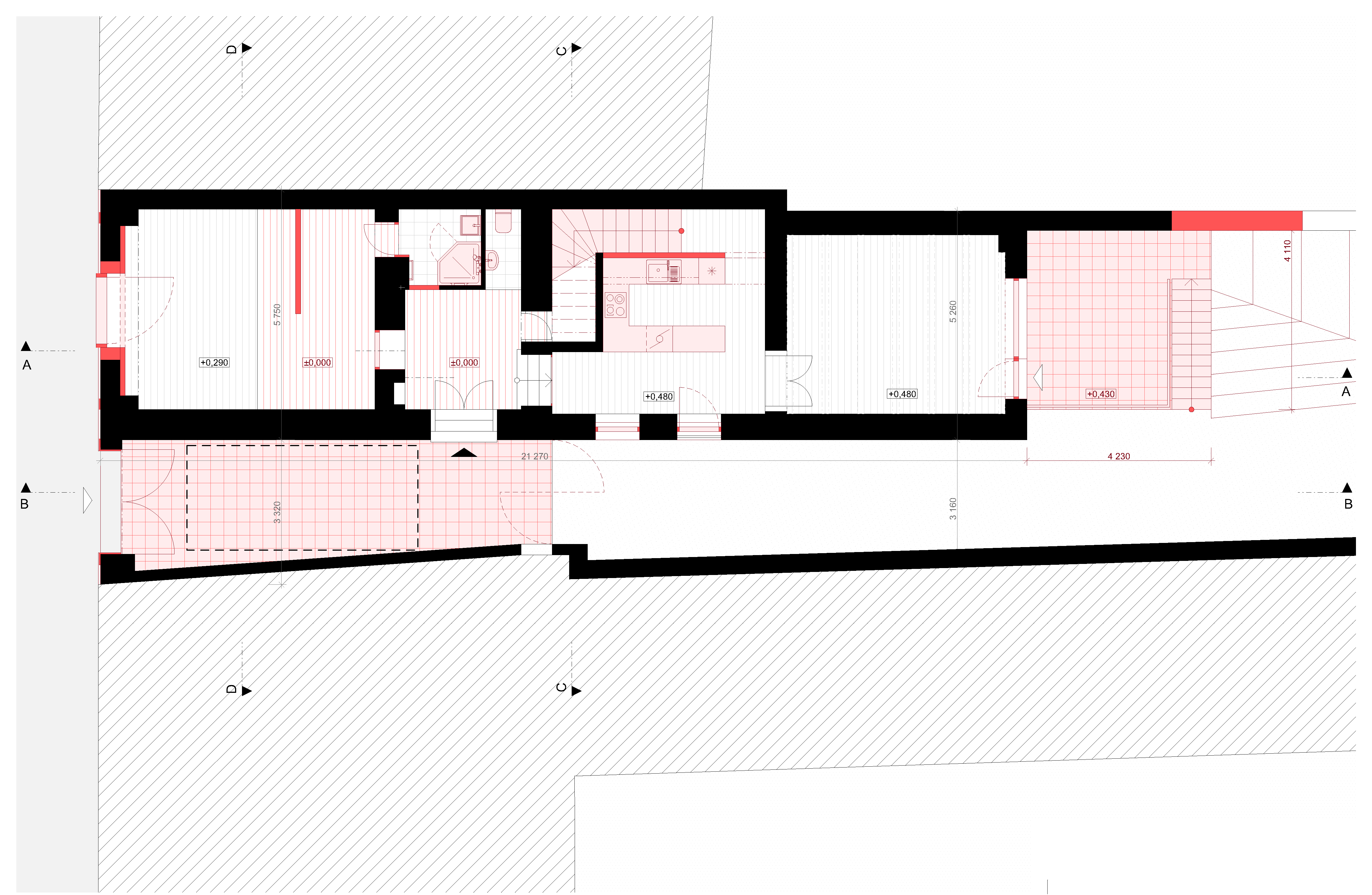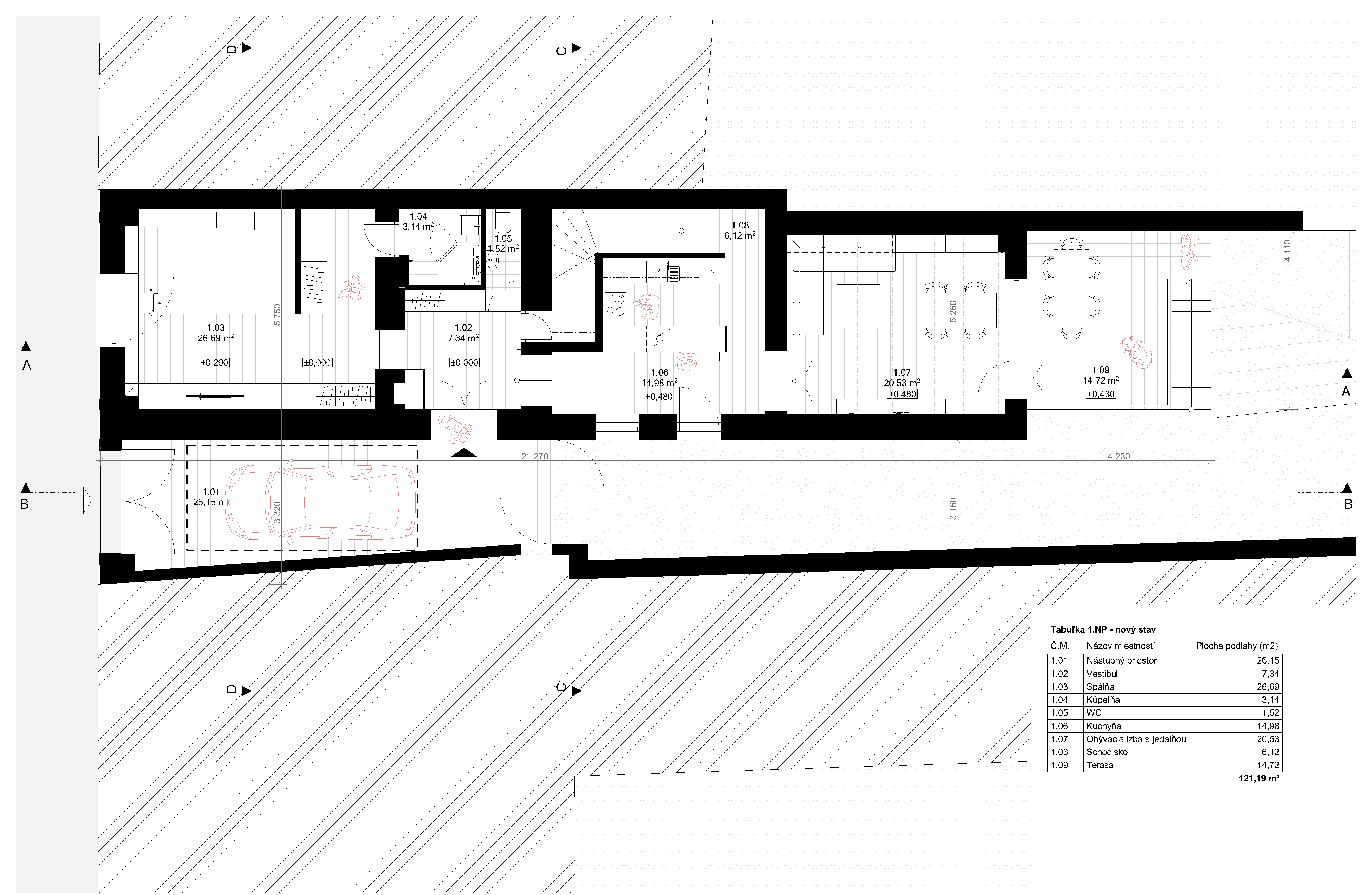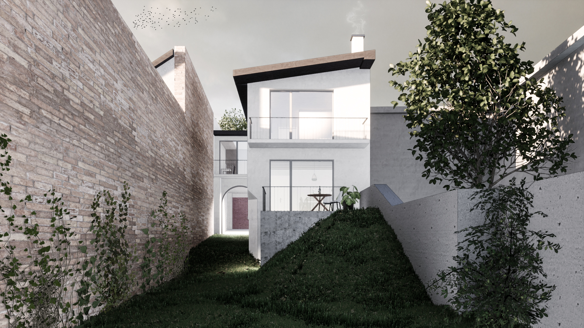 Suterénna časť pri záhrade (tvoriaca terasu domu) je v havarijnom stave. Predmetná časť bude odstránená a nahradená novou substanciou. K novej prístavbe v úrovni suterénu sú navrhnuté zo strany záhrady aj nové terénne úpravy. Vďaka týmto úpravám je zabezpečený plynulý prechod z terasy do záhrady bez požitia schodiska. Z bočnej strany násypu je navrhnuté exteriérové schodisko, ktoré zabezpečuje plynulejší prechod z existujúceho terénu na terasu, ako je tomu v skutkovom stave. K schodisku navrhujeme prihrnúť zeminu, ktorá bude zatrávnená a bude tvoriť plynulý prechod z terasy do záhrady. V zimnom období môže zvýšený terén slúžiť na sánkovanie pre deti
