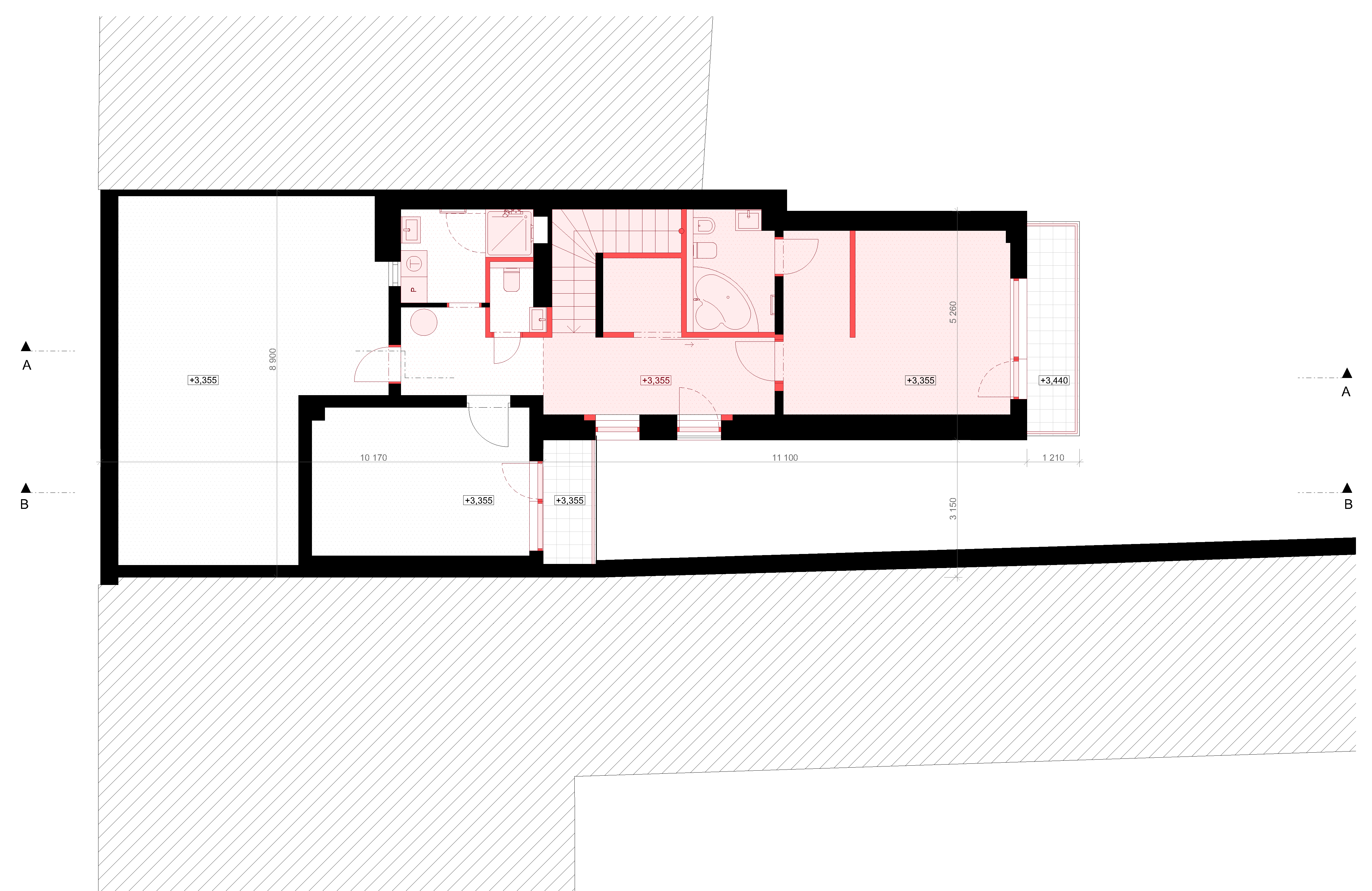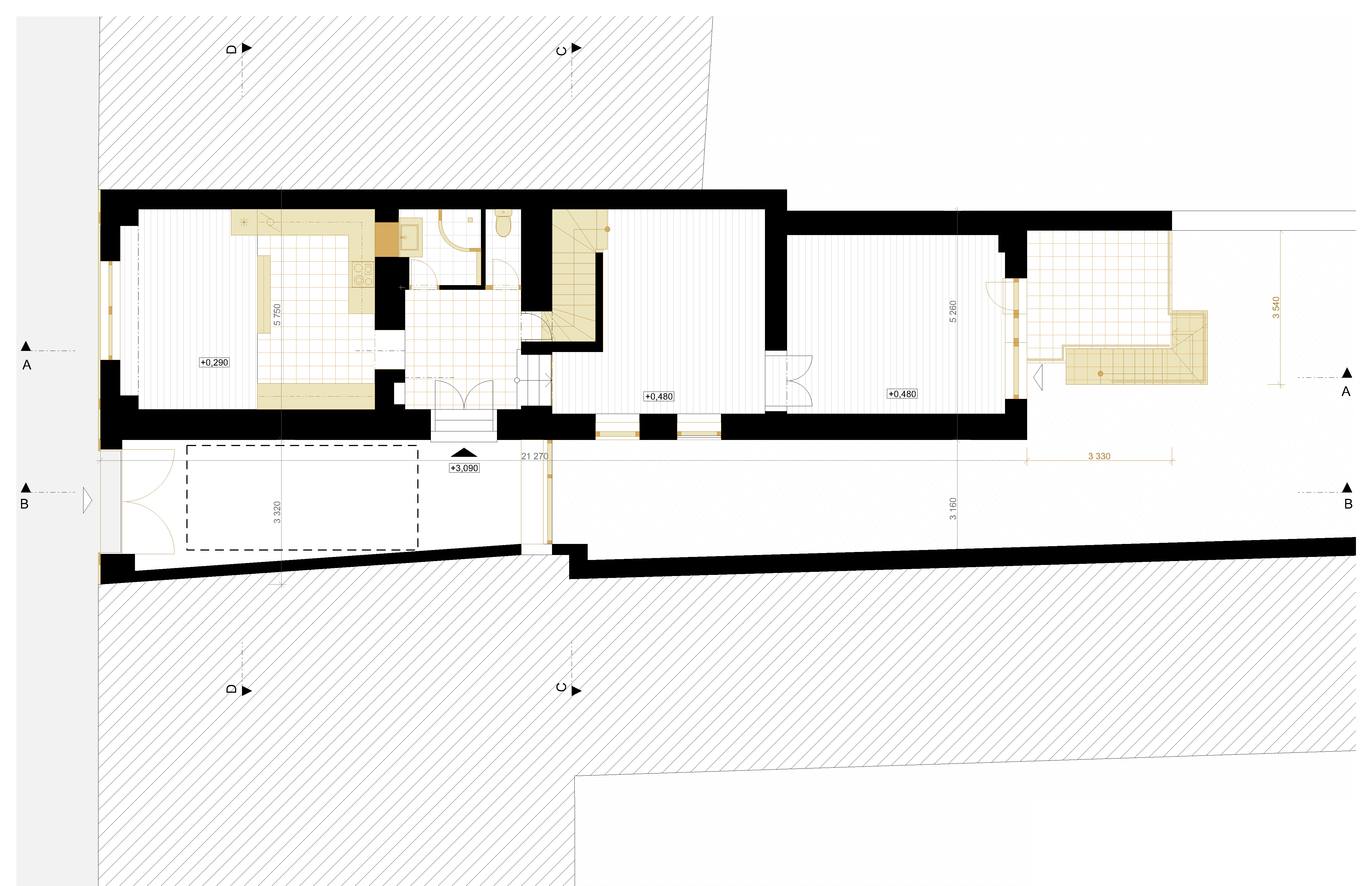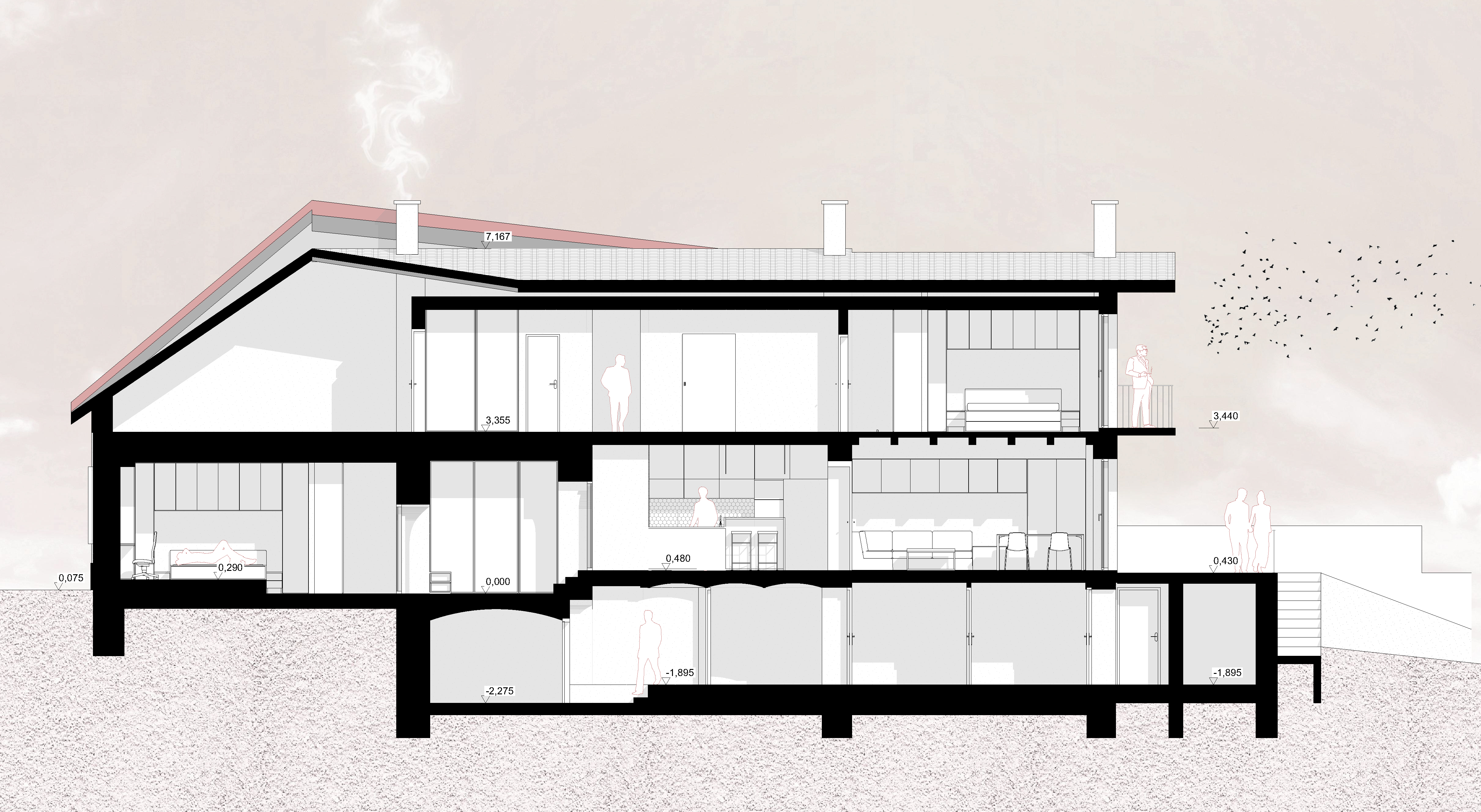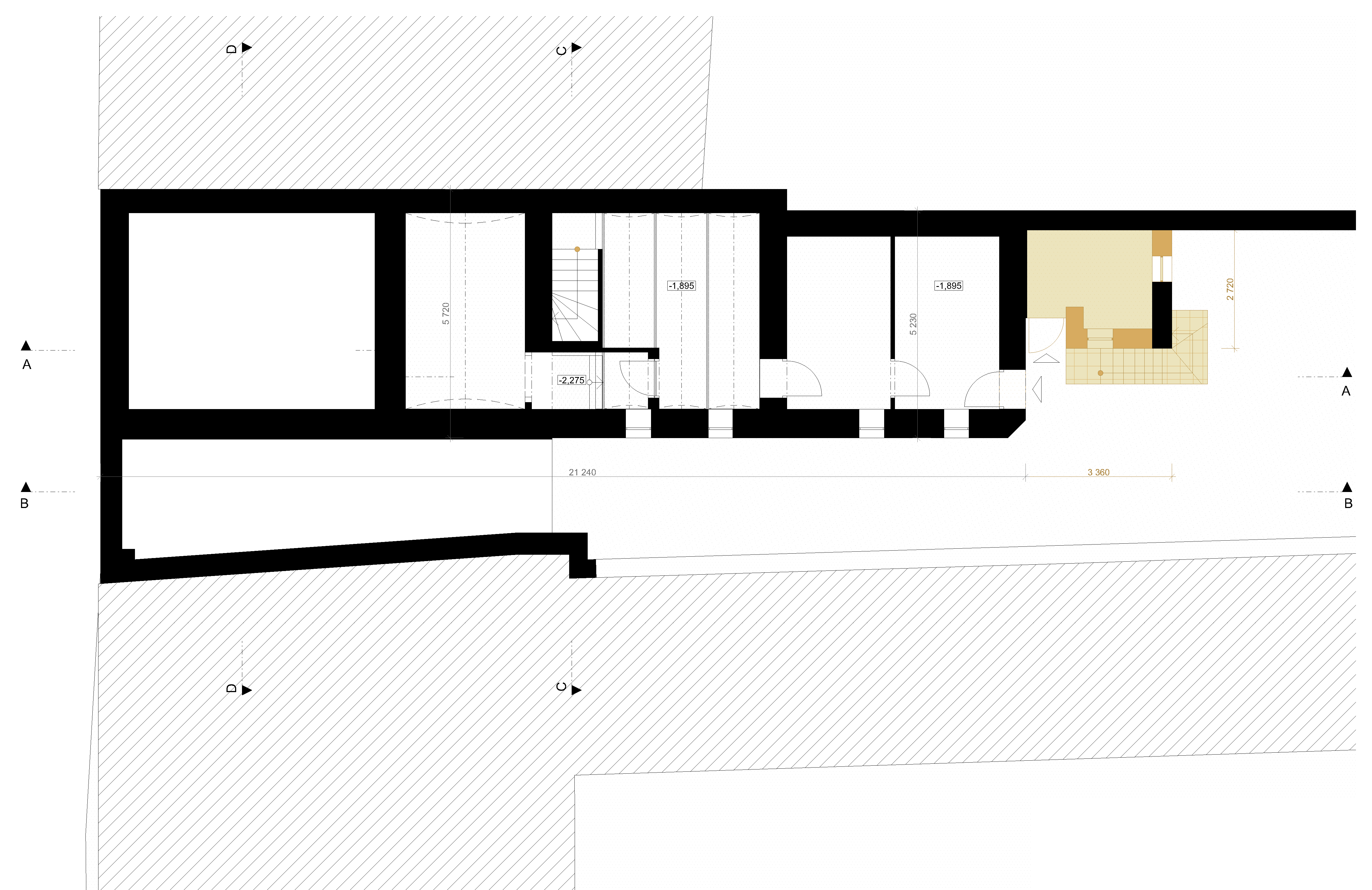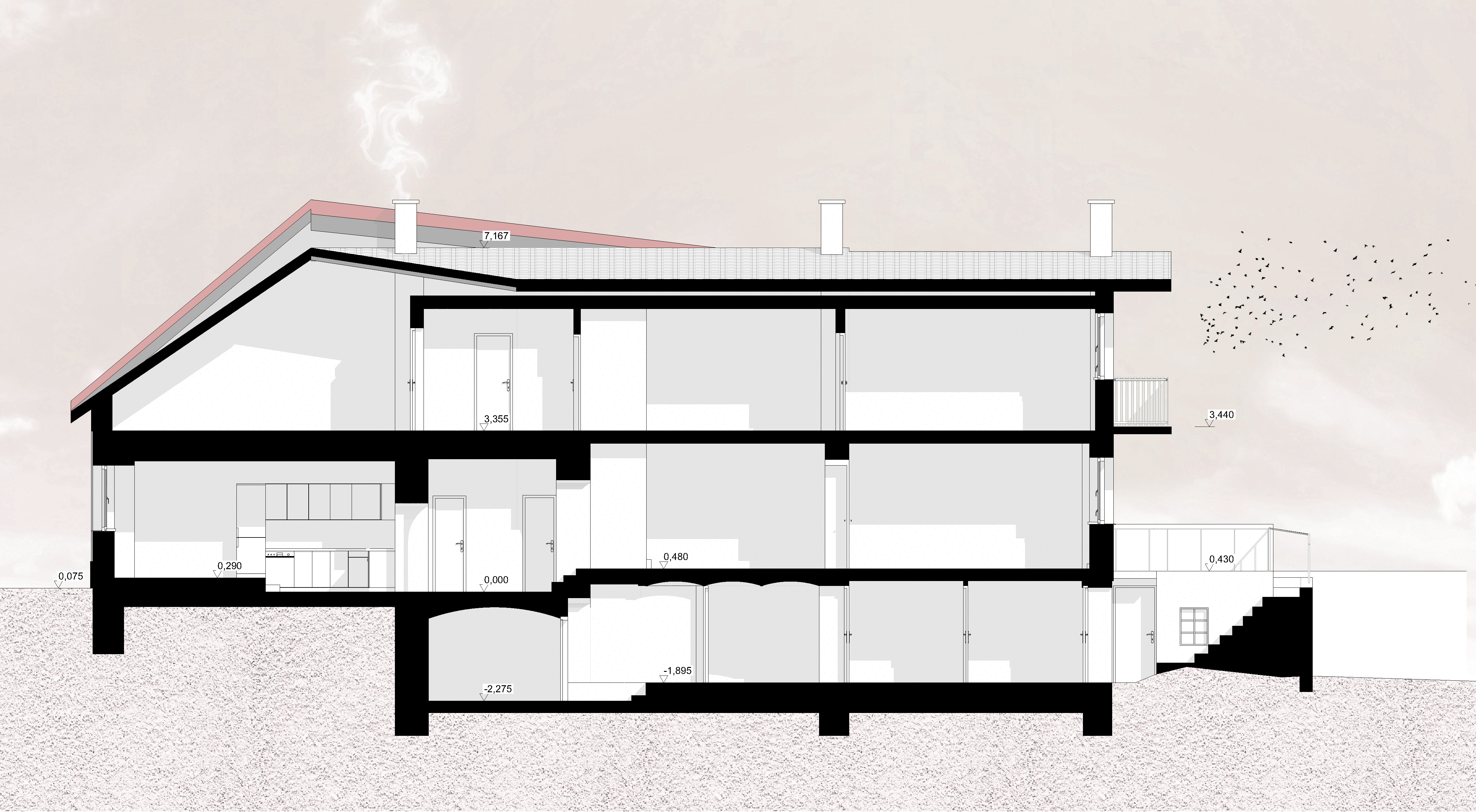 Suterénna časť pri záhrade (tvoriaca terasu domu) je v havarijnom stave. Predmetná časť bude odstránená a nahradená novou substanciou. K novej prístavbe v úrovni suterénu sú navrhnuté zo strany záhrady aj nové terénne úpravy. Vďaka týmto úpravám je zabezpečený plynulý prechod z terasy do záhrady bez požitia schodiska. Z bočnej strany násypu je navrhnuté exteriérové schodisko, ktoré zabezpečuje plynulejší prechod z existujúceho terénu na terasu, ako je tomu v skutkovom stave. K schodisku navrhujeme prihrnúť zeminu, ktorá bude zatrávnená a bude tvoriť plynulý prechod z terasy do záhrady. V zimnom období môže zvýšený terén slúžiť na sánkovanie pre deti