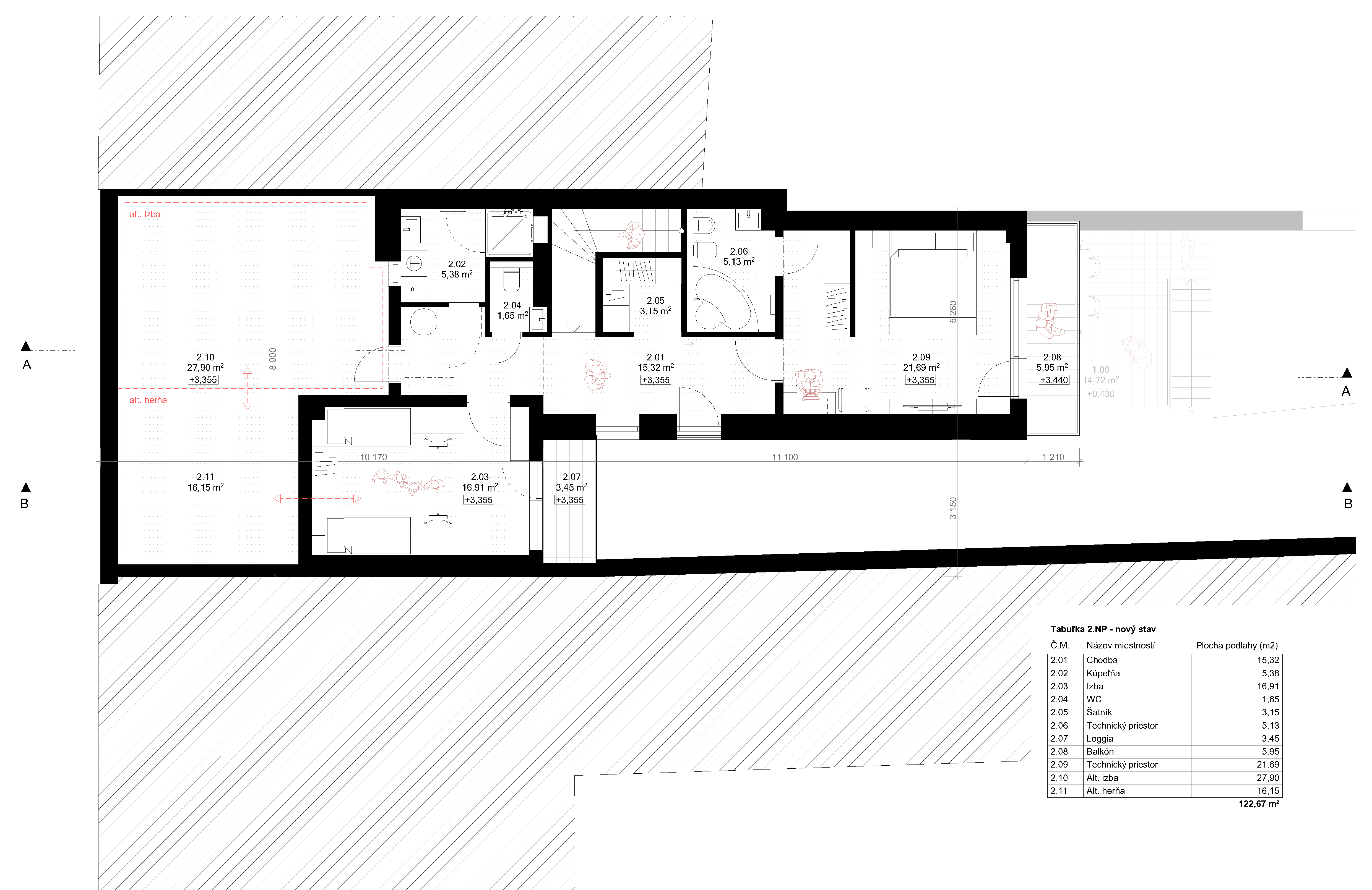 Hlavnou ideou dispozičného návrhu je eliminovať priechodné izby a situovať spoločenskú zónu smerom k záhrade, vďaka čomu sa zachová oddelenie súkromnej zóny od spoločenskej zóny. V súčasnosti sú v objekte 3 izby (spálňa, spálňa, detská izba), 1 obývacia izba s kuchyňou, 2 kúpeľne, 1 WC a 2 priechodné izby. V novom návrhu sa uvažuje s 3 izbami (spálňa, detská izba, hosťovská izba), obývacou izbou s jedálňou, samostatnou kuchyňou, 3 kúpeľňami, 2 toaletami a šatníkom. Nástupný priestor a zádverie na 1. nadzemnom podlaží ostávajú v pôvodnom stave. Obývacia izba s kuchyňou je nahradená hosťovskou izbou s vlastnou kúpeľňou. V zádverí ostáva pohotovostné WC. Priechodná izba obsahuje pohodlné schodisko (jednoramenné, krivočiare, jeden krát zalomené) a kuchyňu, cez ktorú sa dostávame do obývacej izby s jedálňou. Obývacia izba je priamo napojená cez novú terasu a schodisko do záhrady. Cez nové schodisko sa na druhé nadzemné podlažie dostávame do väčšieho chodbového priestoru. Poloha pôvodnej kúpeľne ostáva, avšak sa rozdelí na samostatné WC a kúpeľňu. V rámci chodby, pri kúpeľni je navrhnutá skriňa s možnosťou umiestnenia technického vybavenia (napr. kotol). Spálňa a detská izba ostávajú v pôvodnej polohe. Do priechodnej izby je navrhnuté spomenuté schodisko, šatník a kúpeľňa, ktorá je prístupná iba zo spálne. Nevyužité podkrovie je alternatívne navrhnuté ako ďalšia detská izba s herňou. Do herne by mohli mať prístup obidve detské izby.V