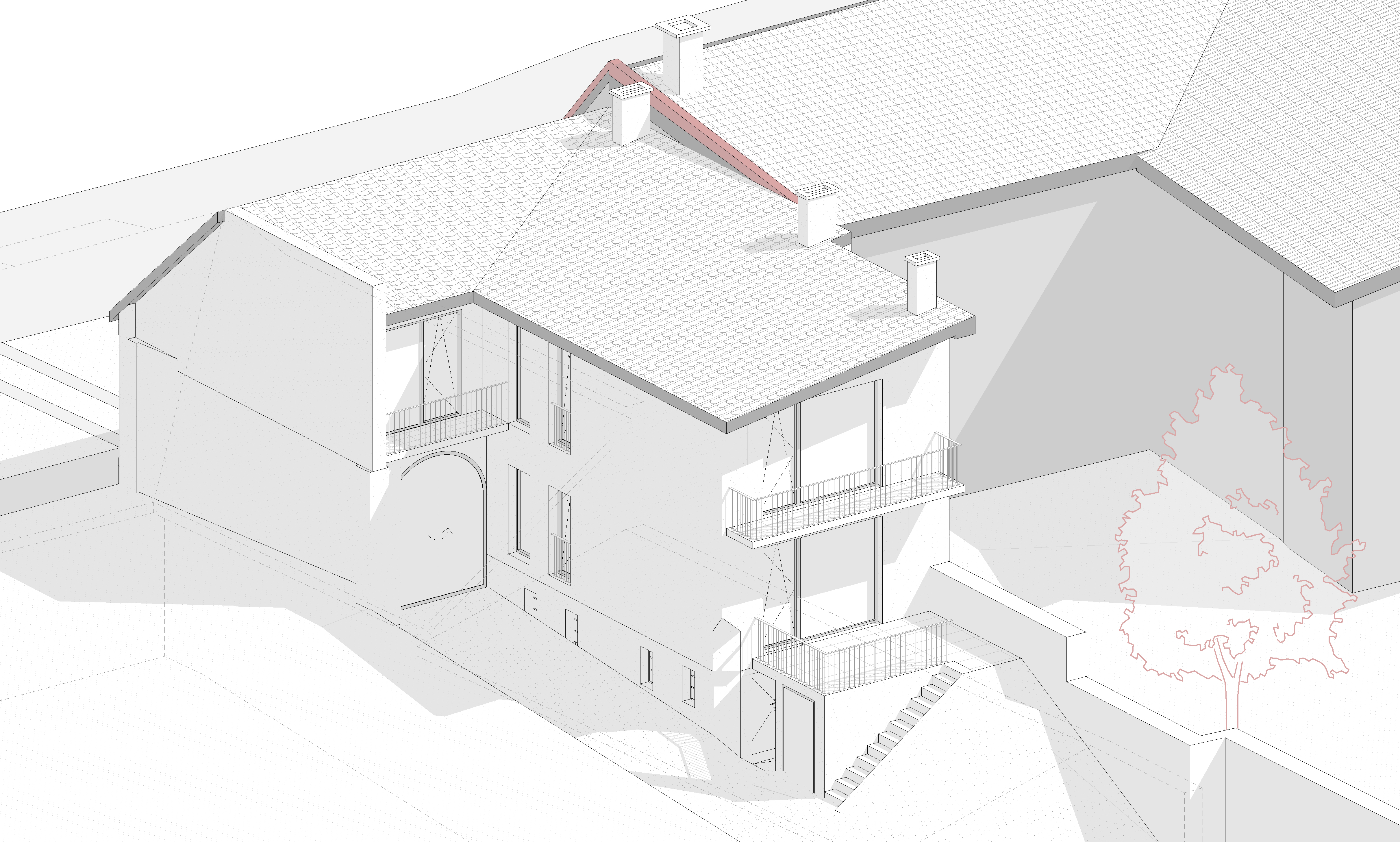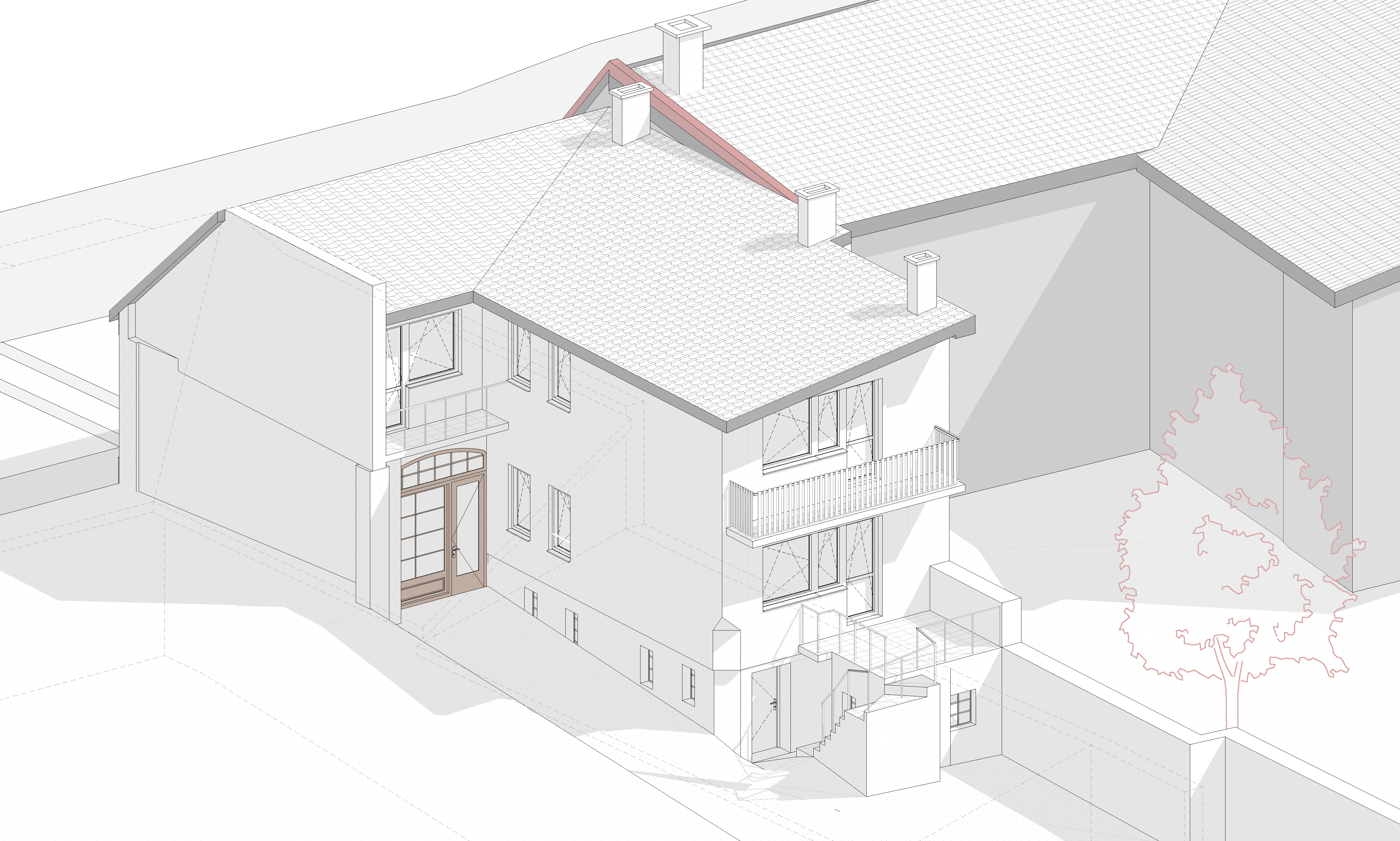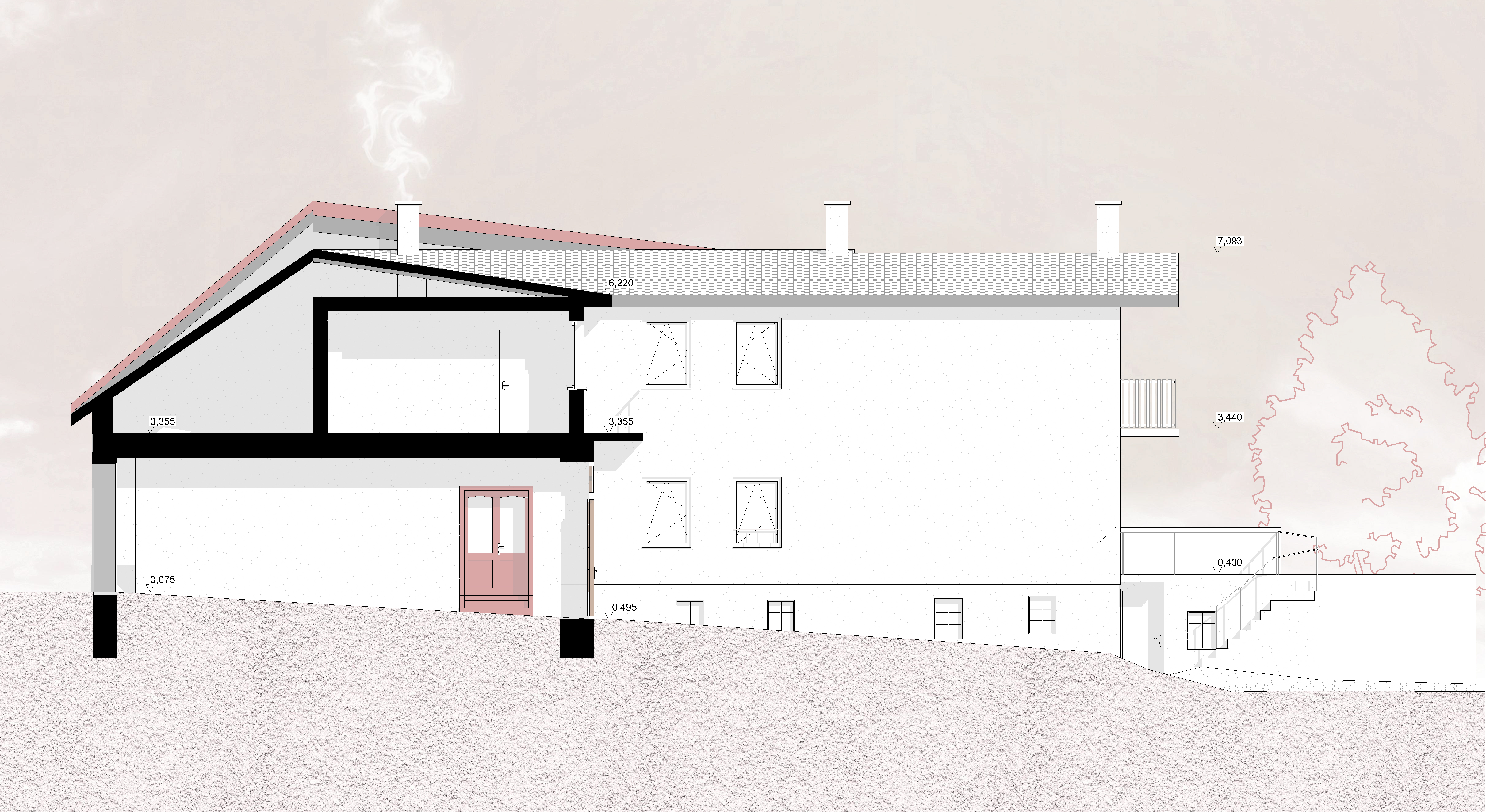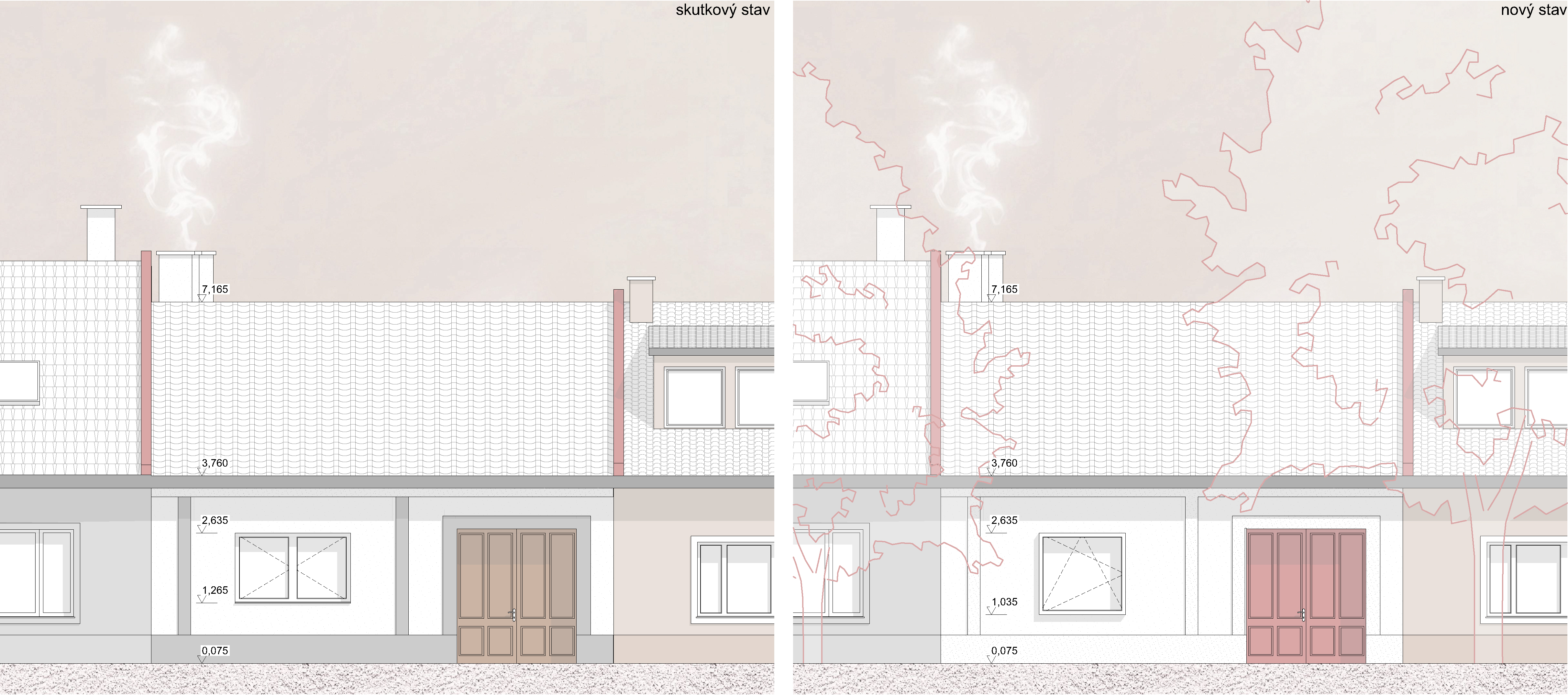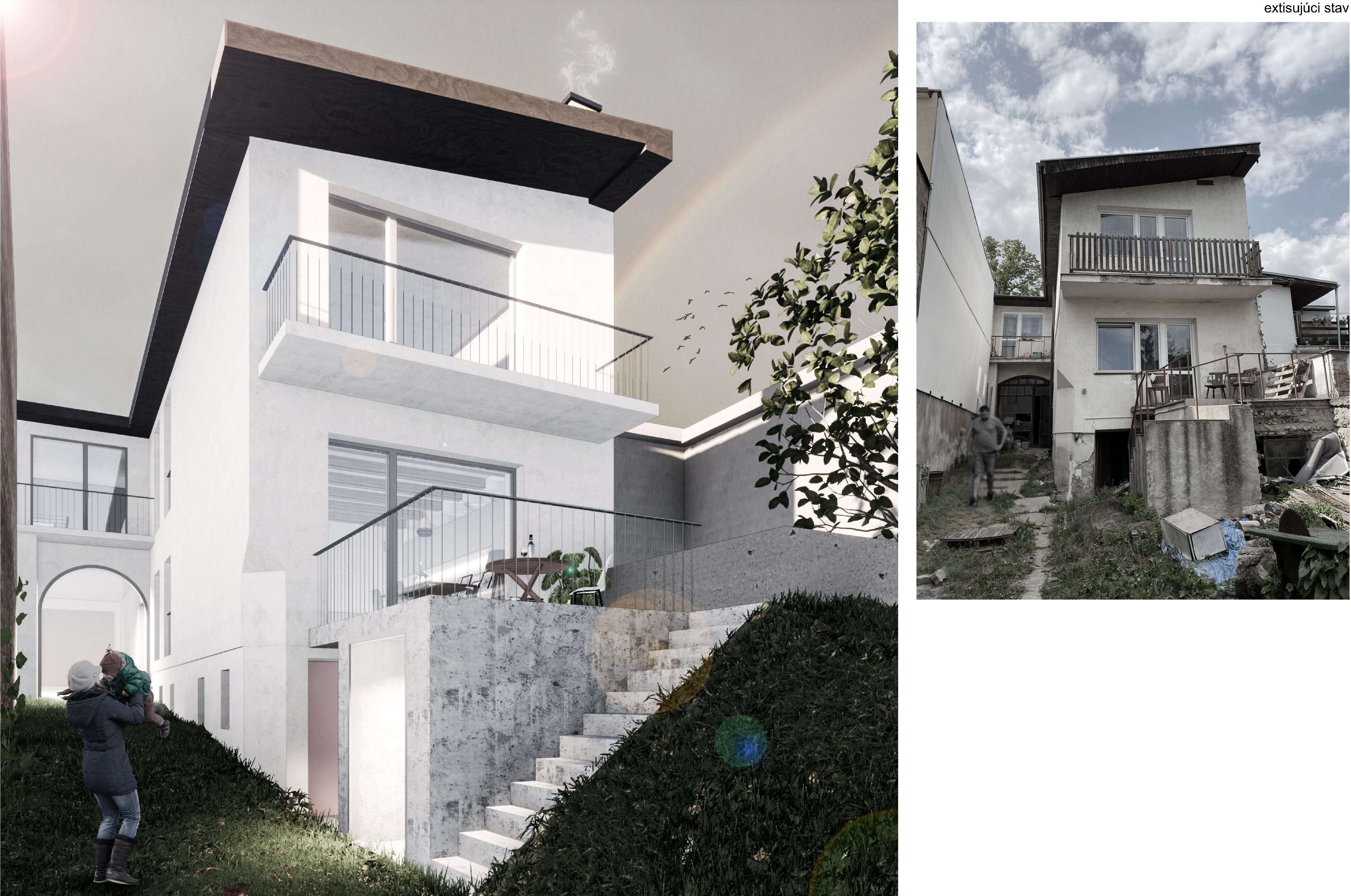 Pôvodný tvar objektu ostáva nezmenený. Projekt prioritne rieši zlepšenie kvality bývania z pohľadu dispozičného a hygienického (osvetlenie a preslnenie priestorov). Predmetný návrh reaguje na potreby investora, ktorými sú zefektívnenie funkčno-prevádzkovej schémy domu. Zároveň sa touto zmenou zvýši aj rentabilnosť nehnuteľnosti. Dispozičné zmeny však musia nastať v oboch nadzemných podlažiach. Hlavný a vedľajšie vchody do objektu ostávajú v pôvodnom umiestnení ako aj brána, cez ktorú je možný prístup na pozemok z hlavnej komunikácie a verejného chodníka. Okenné konštrukcie sú zväčšené o parapety a ich prevedenie má súčasnejší charakter vďaka veľkoformátovému preskleniu. Dvojkrídlové okno z ulice je nahradené jedným krídlom so štvorcovým priemetom a „šambránou“ tvorenou dreveným profilom, ktorý súčasným spôsobom cituje pôvodné šambrány okolitých domov v obci.
