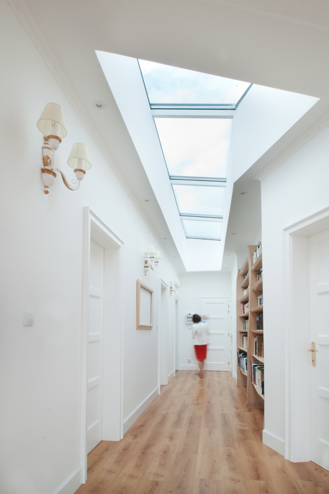 Na schodiskový trakt je napojená vertikála nového výťahu, ktorý obslúži všetky poschodia objektu. Na najvyššom poschodí je výstup z výťahu priamo do predsiene nového bytu. Zo schodiska vedú vstupné dvere do haly s knižnicou, ktorá je presvetlená strešným svetlíkom. Táto pozdĺžna hala prepája všetky ďalšie časti bytu. Na jej južnom konci je obývacia izba s panoramatickým francúzskym oknom s výhľadom na mesto. Z haly je prístupná kuchyňa a terasa, ktorá obopína celý pôdorys bytu po jeho obvode. Tri spálne a dve kúpeľne so zázemím dopĺňajú dispozícii bytu do funkčného celku. Nadstavba bola realizovaná ako oceľový skelet s železobetónovými stropmi. Technickou zaujímavosťou bytu je chladenie stropov nadstavby za pomoci tepelného čerpadla, čo spolu s vonkajšími žalúziami zabezpečuje príjemnú klímu aj v exponovanom juhozápadnom nároží na streche objektu.