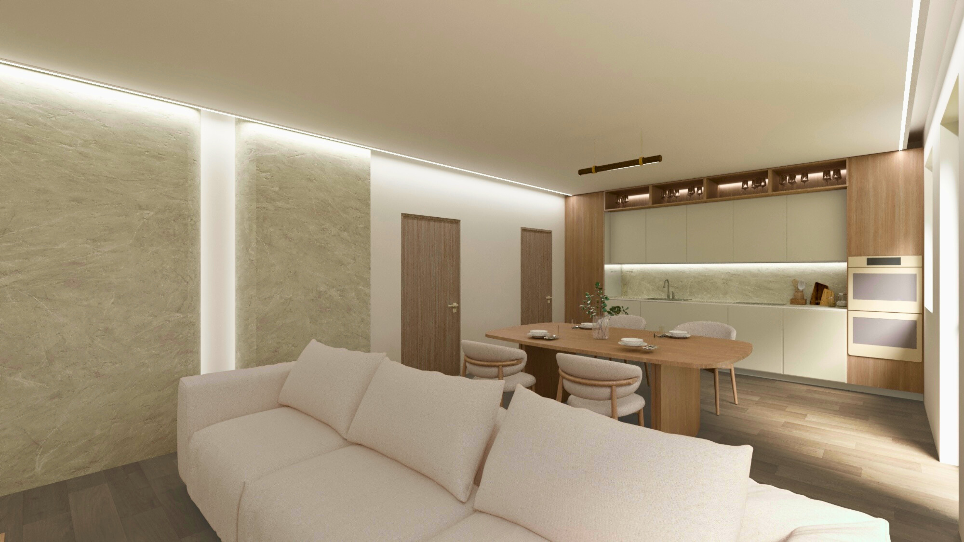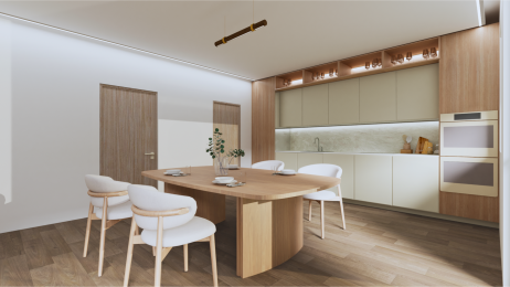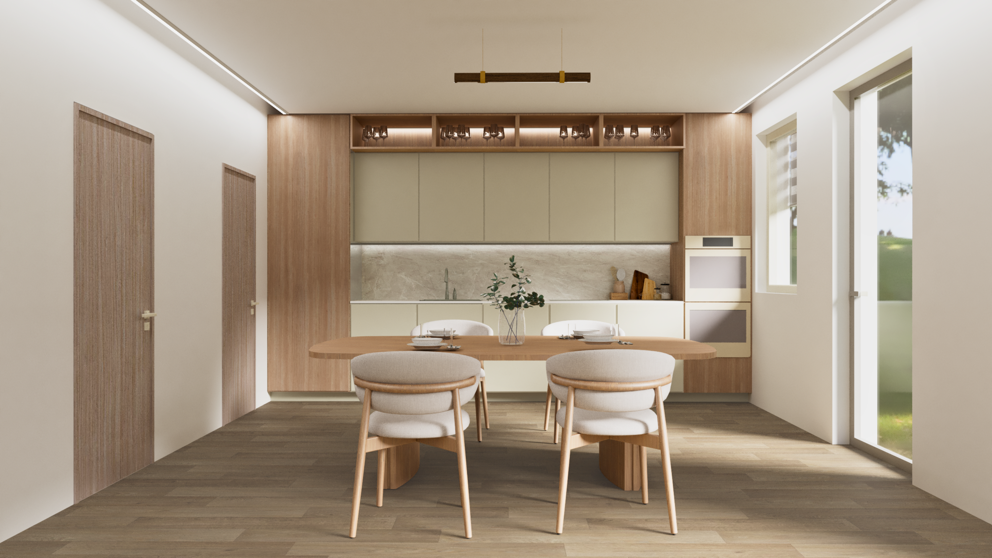 Kuchyňa je navrhnutá v tvare písmena l, čo umožňuje efektívne využitie priestoru. Kuchyňa je prepojená s jedálňou, ktorej centrom je jedálensky stôl so štyrmi stoličkami zvolenými s ohľadom na funkčnosť a pohodlie.