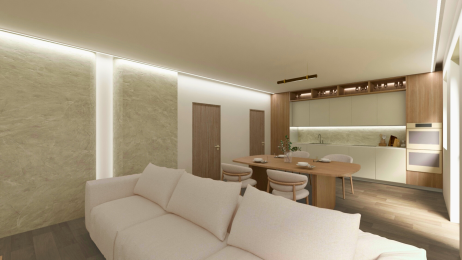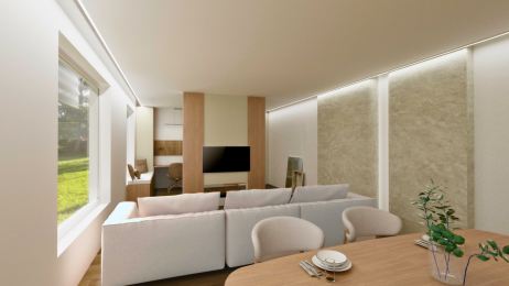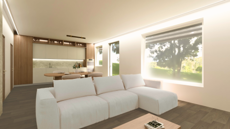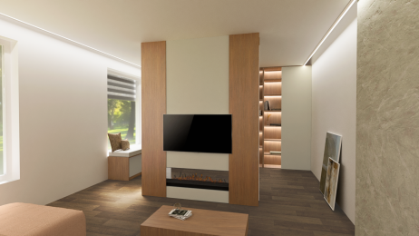 V obývacej časti bola pridaná priečka s biokrbom, čo dodáva priestoru atmosféru pokoja a relaxácie. Táto časť nie je oddelená od kuchyne a tým vznikol otvorený a spojený dojem, podporujúci vzájomnú komunikáciu.