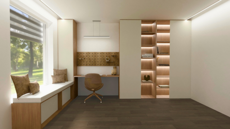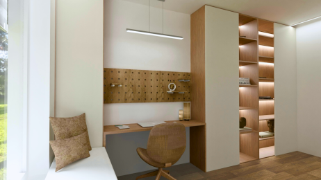 Pracovňa je umiestnená na konci spoločenskej zóny, čím sa vytvoril tichý a koncentrovaný priestor na prácu.