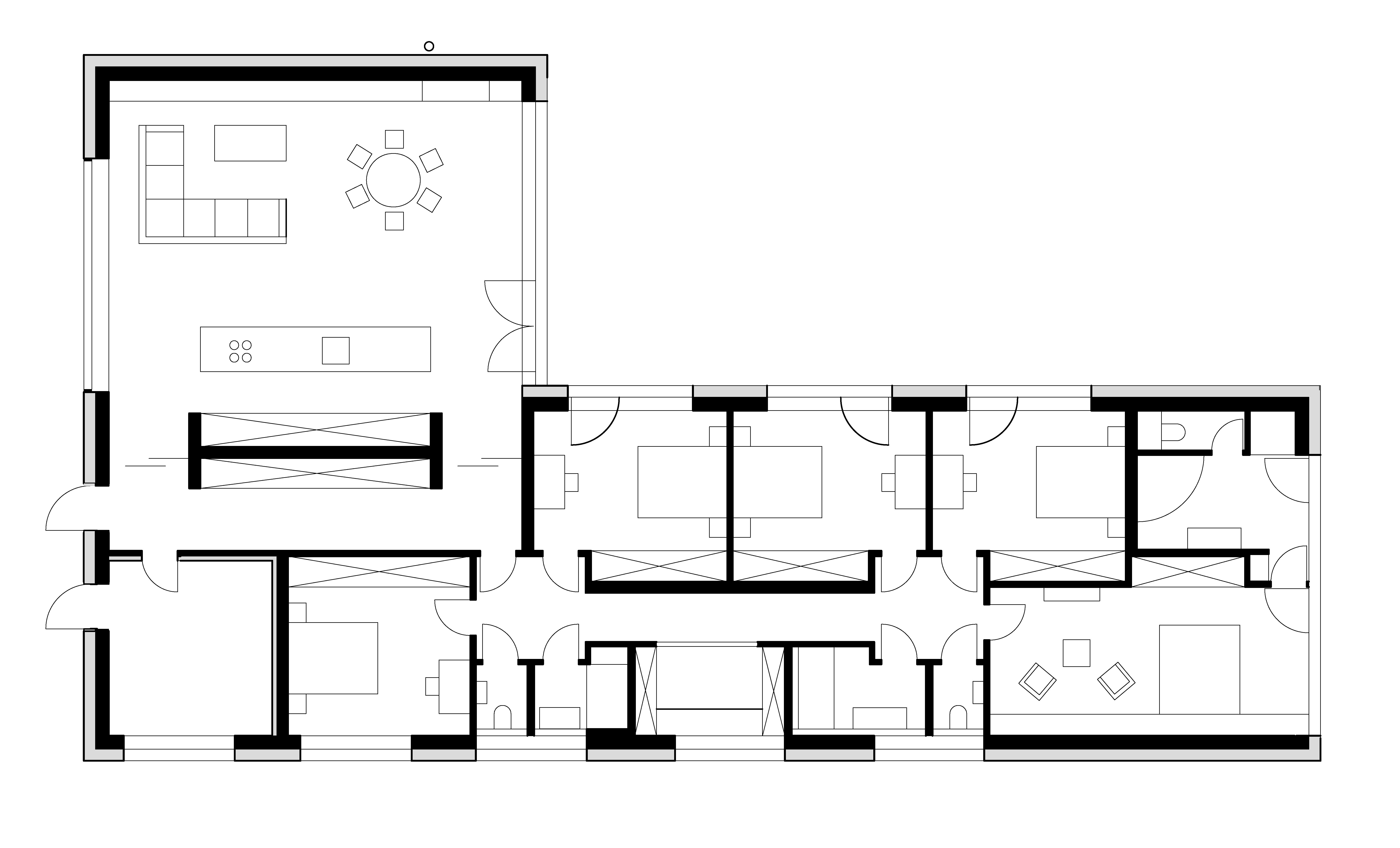Krídla pôdorysu vytvátajú smerom na juhozápad chránenú oddychovú zónu, napojenú priamo na priľahlú záhradu. V kratšom krídle dispozície je umiestnená denná časť, v dlhšom časť nočná. Najatraktívnejšie obytné priestory sú orientované do chráneného átria. Technické a pomocné priestory sú umiestnené pozdĺž severozápadnej steny krídla nočnej časti. Steny do átria sú maximálne otvorené, aby zabezpečili obyvateľom dostatok slnka aj výhľad do okolia. Takisto je tu možný priamy výstup z domu von. Veľkú časť roka si obyvatelia môžu rosšíriť využiteľnú plochu aj o priľahlé vonkajšie priestory terasy.