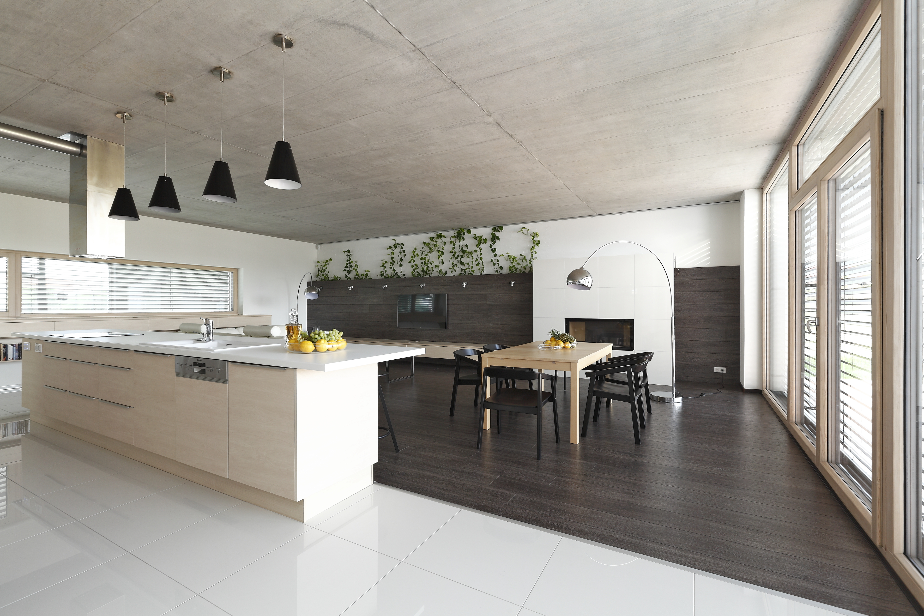 Hlavný obytný priestor - obývačka s kuchyňou a jedálňou tvorí ústrený, voľný spoločenský priestor domu. Jednotlivé funkčné časti sú definované nábytkom. Svetlá výška neznížených vnútorných priestorov s priznaným stropom z betónu je 2,8 m.
