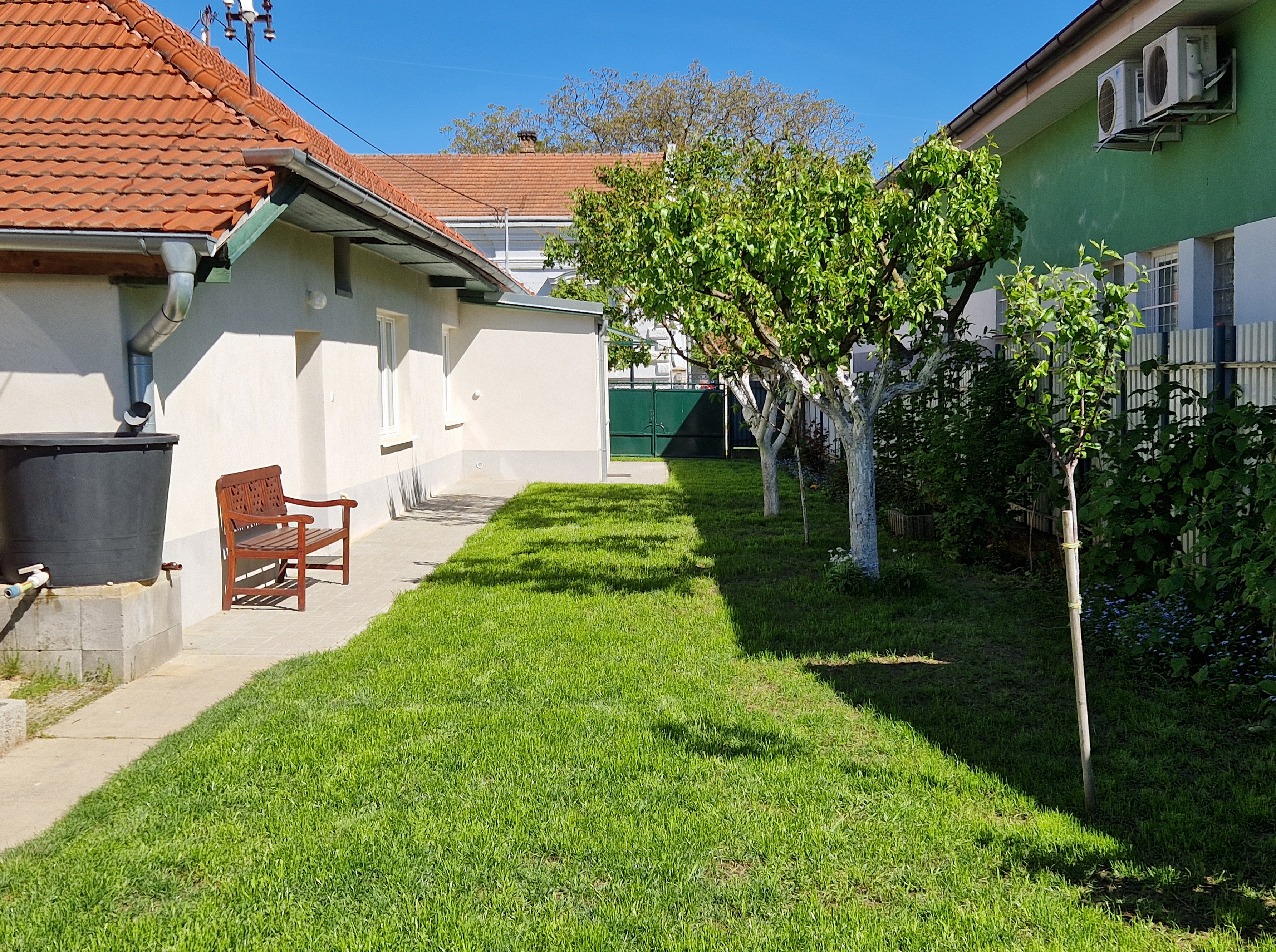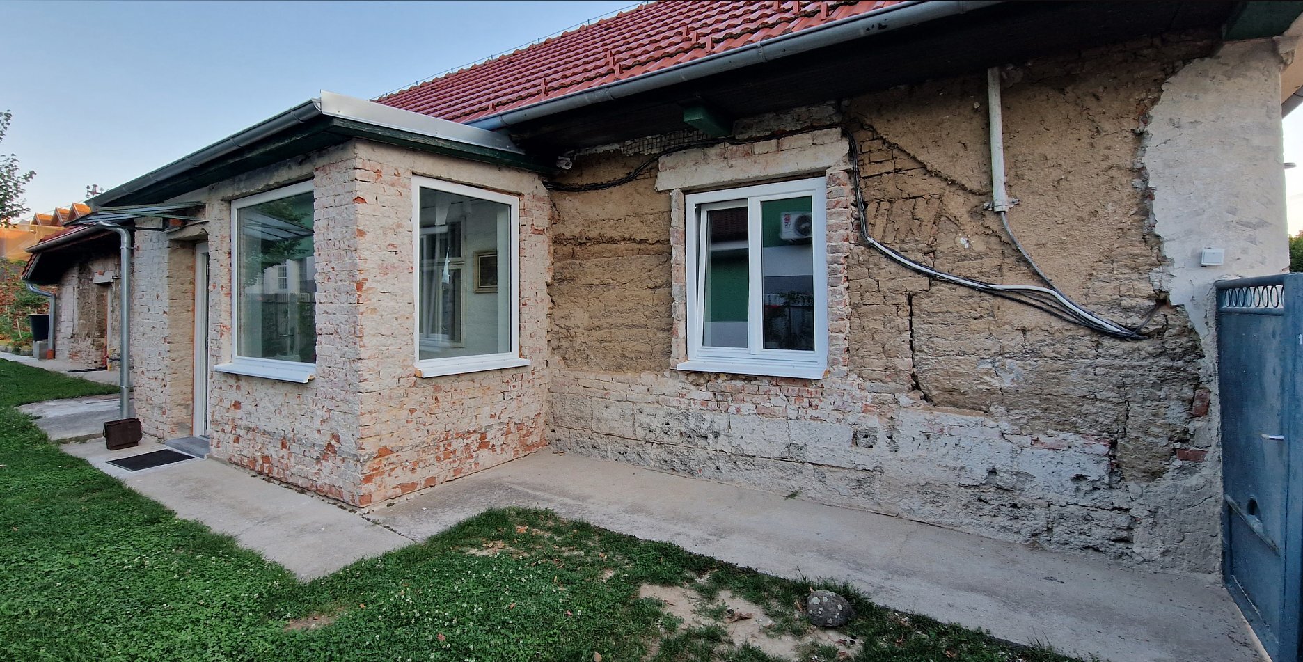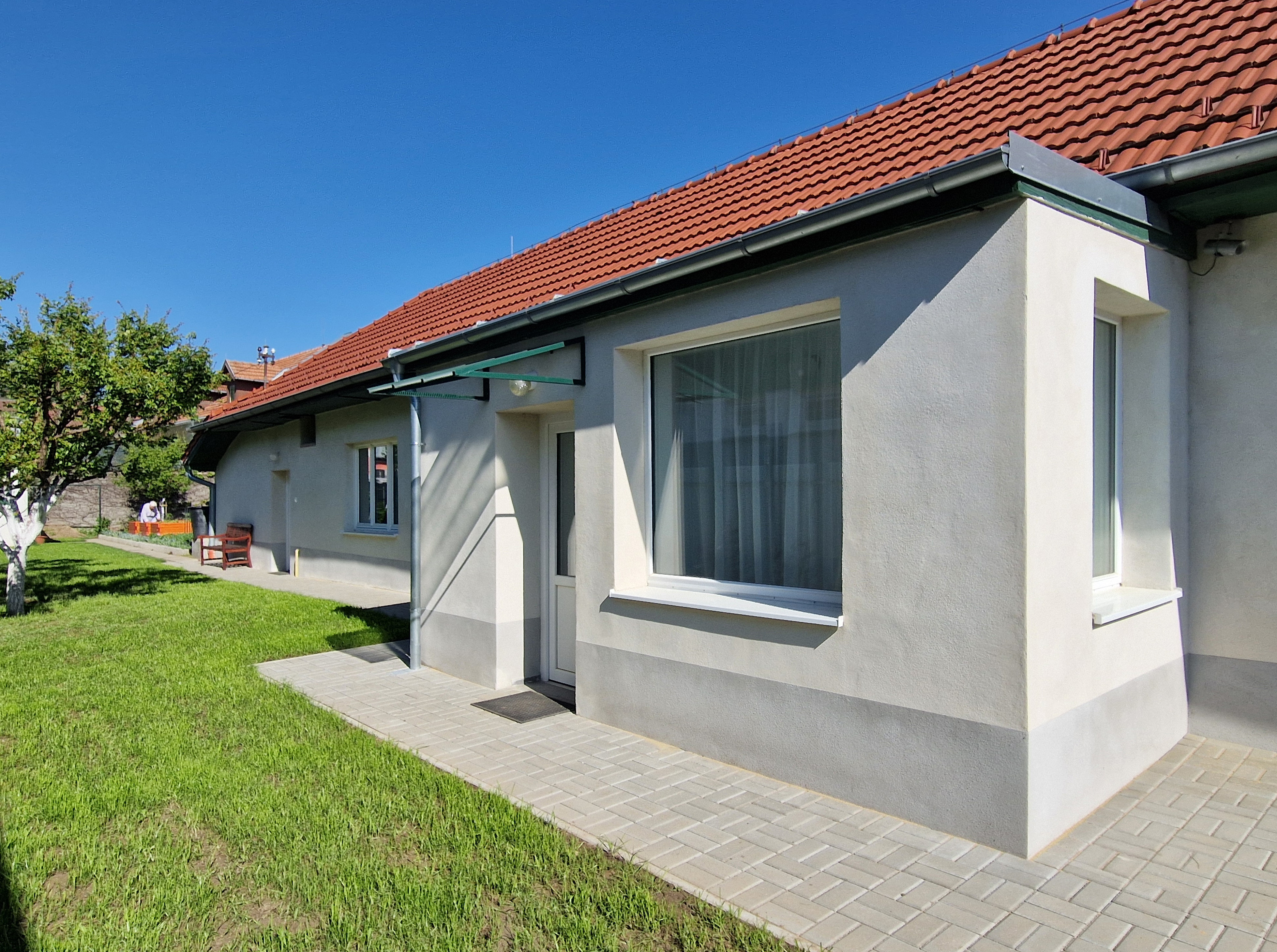 Dom po Obnove, s novou strechou, novými odkvapmi, novými oknami a dverami, novou fasádnou omietkou, novou zámkovou dlažbou a s obnoveným terénom a trávnikom na dvore.