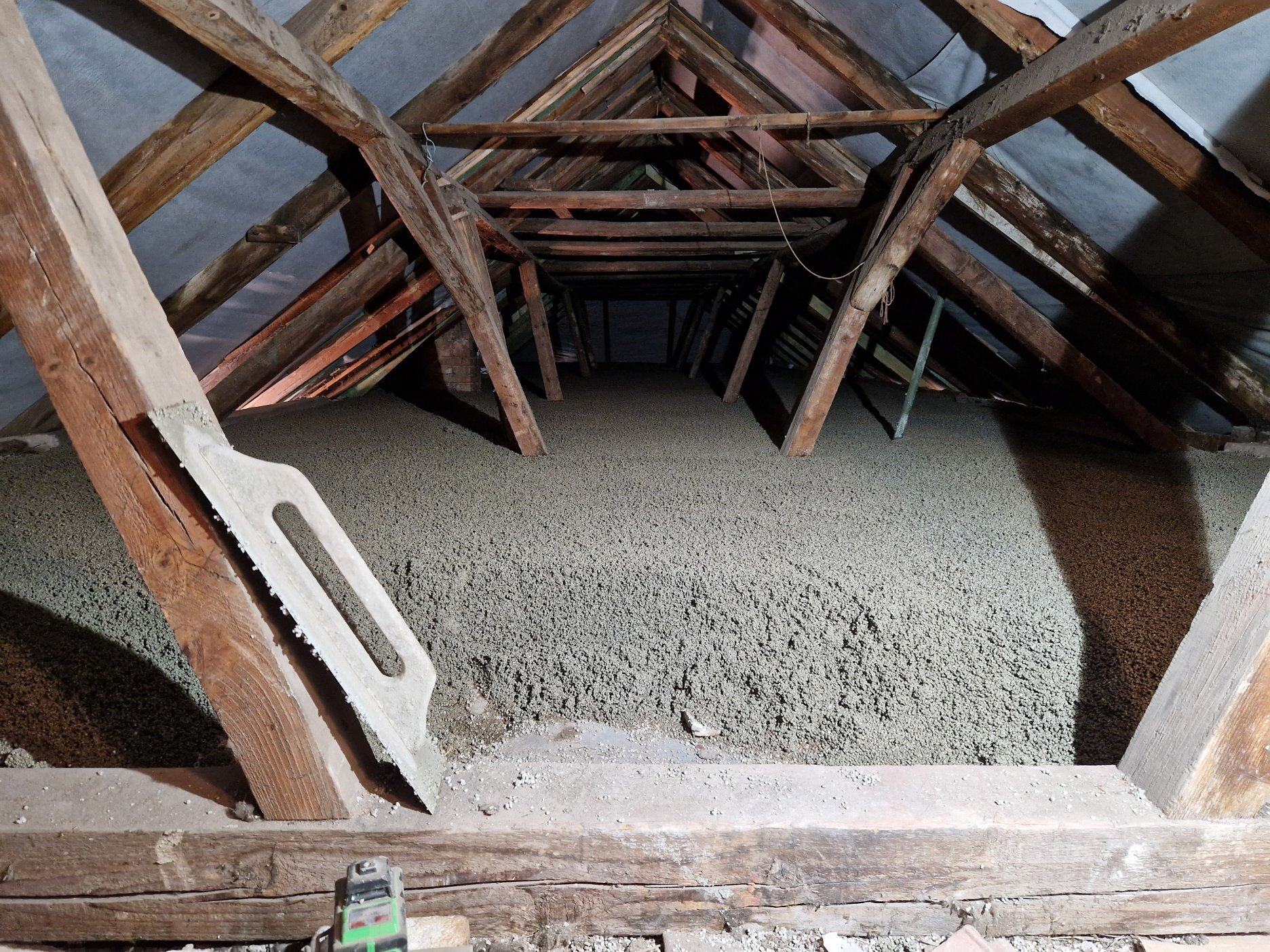 Práce na zatepľovaní: Nanášanie 25cm vrstvy Styrcomixu. Je to výborný tepelnoizolačný materiál, ktorý je zároveň aj paropriepustný. Tvoria ho guličky polystyrénu obalené v cementovom mlieku. Aplikácia Styrcomixu je veľmi jednoduchá. Po vyzretí cementu je povrch pochôdzny a pripravený na prípadnú ďalšiu povrchovú úpravu.