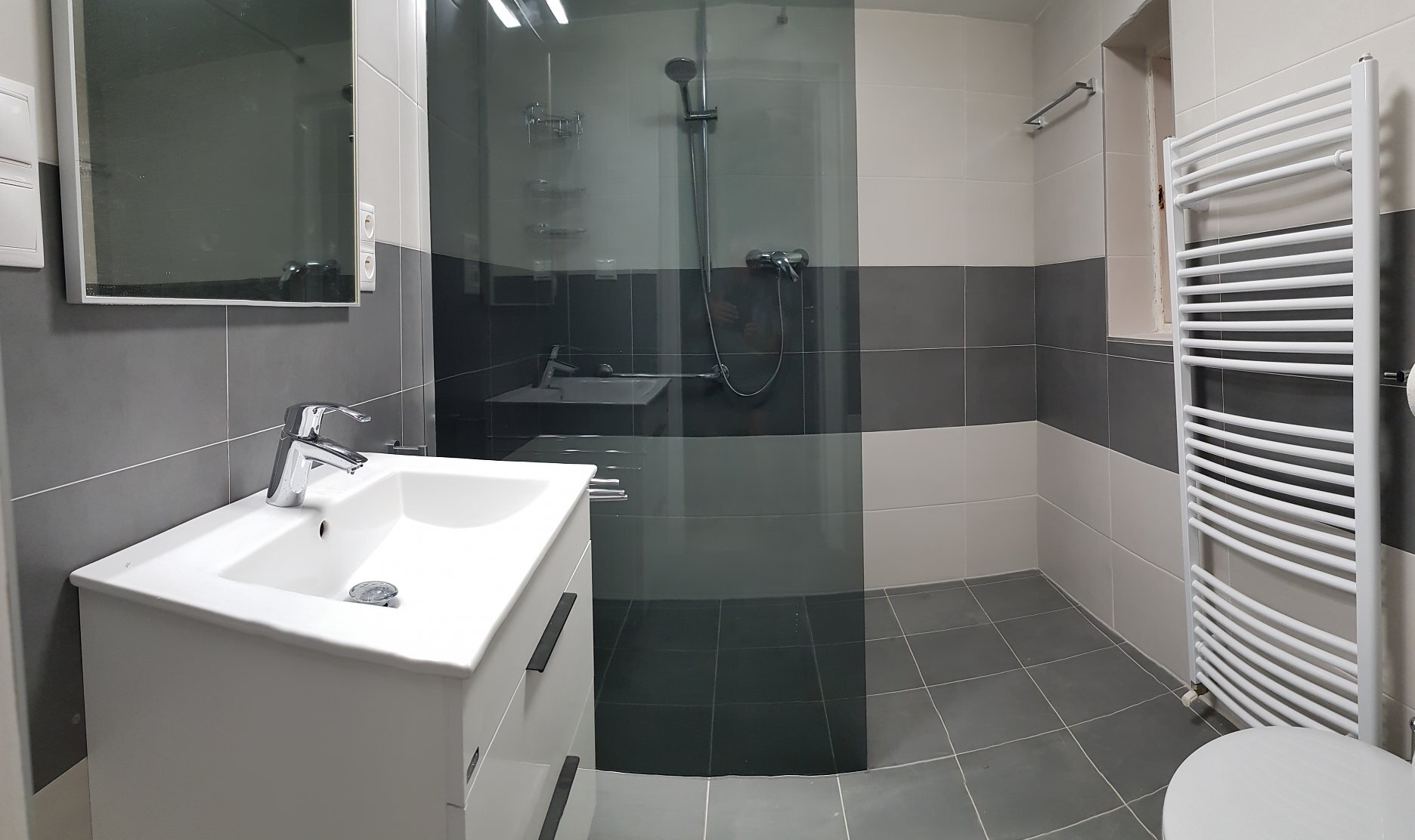 Kúpeľňa po obnove, so sprchou s bezbariérovým prístupom, s odvetranou a zateplenou podlahou a s protišmykovou dlažbou.