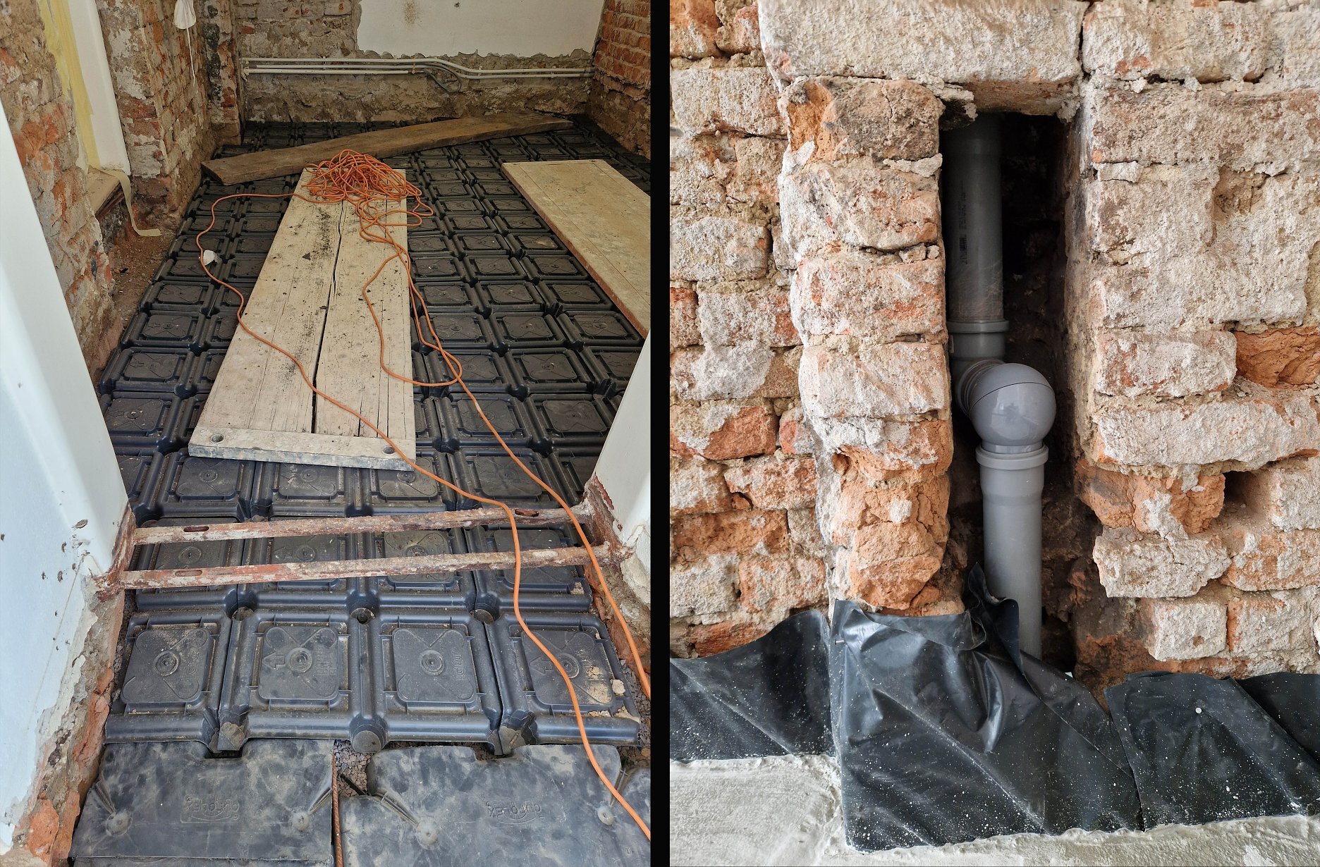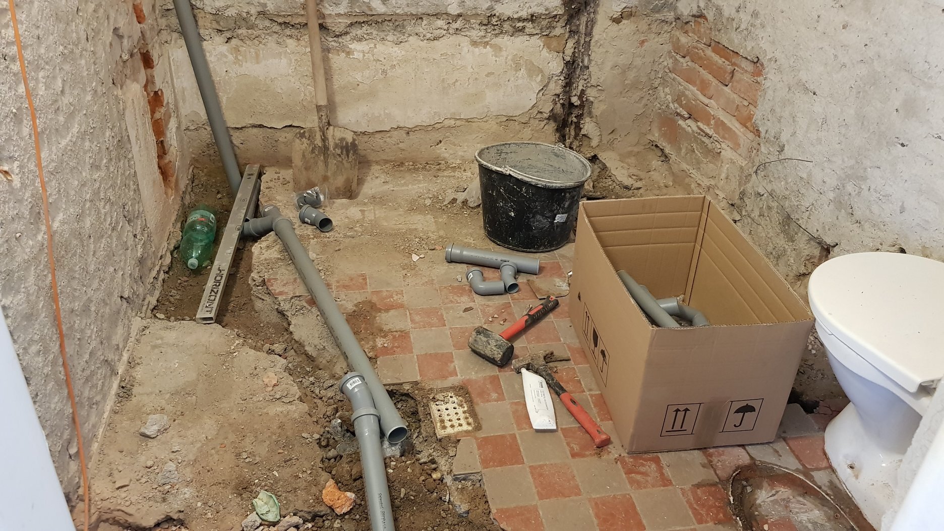 Práce na prestavbe: V kúpeľni bolo nutné vymeniť staré rozvody vody a kanalizácie, nakoľko už boli miestami popraskané a prehnité. Bolo tiež nutné vymeniť starý bojler na ohrievanie vody.