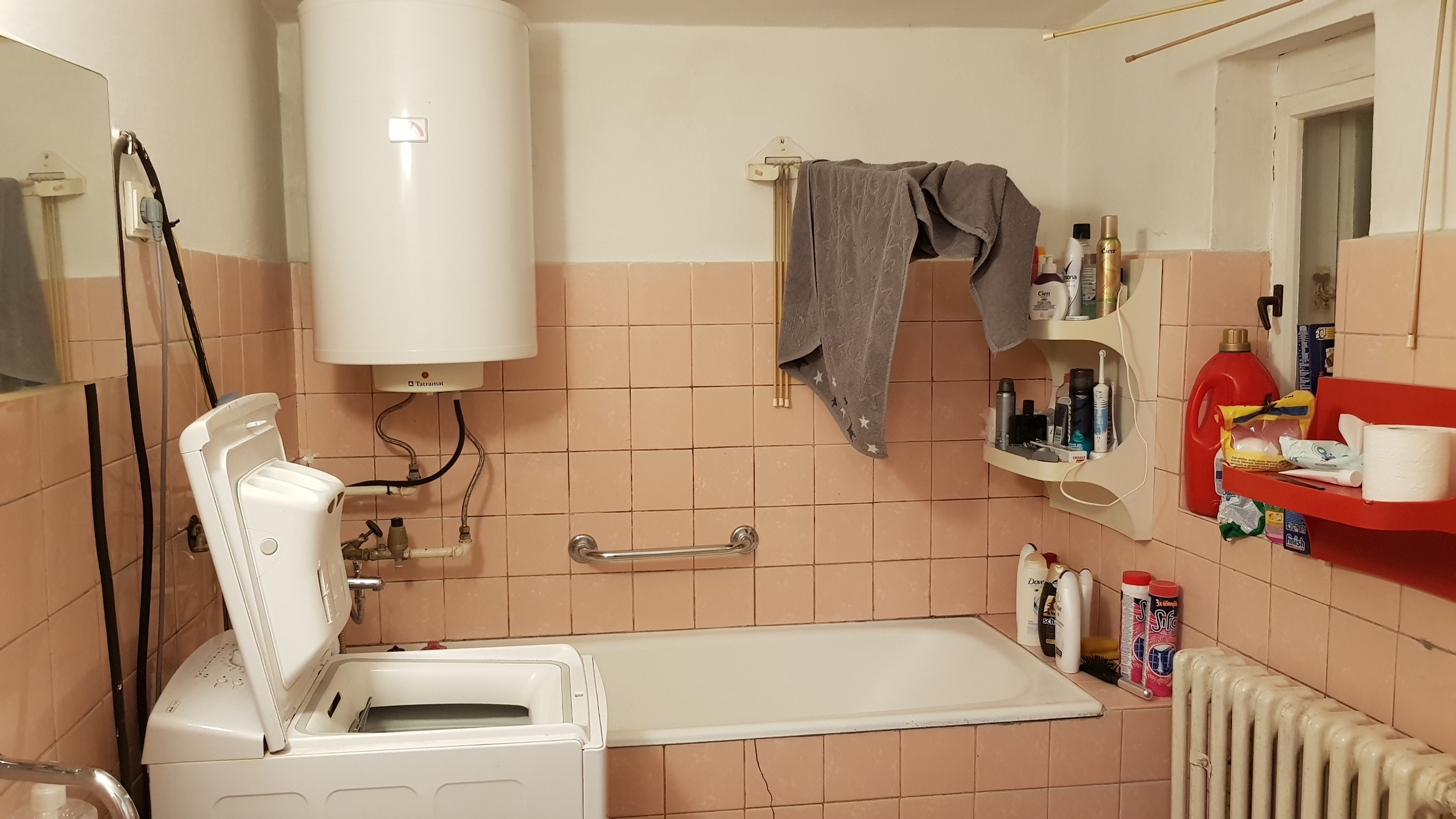 Stará kúpelňa pred obnovou. Jedným z hlavných cieľov obnovy bolo nahradenie vane sprchou s bezbariérovým prístupom, nakoľko mamka, ktorá bola vtedy vo veku viac než 80 rokov, v tej dobe už nedokázala vstúpiť do vane.