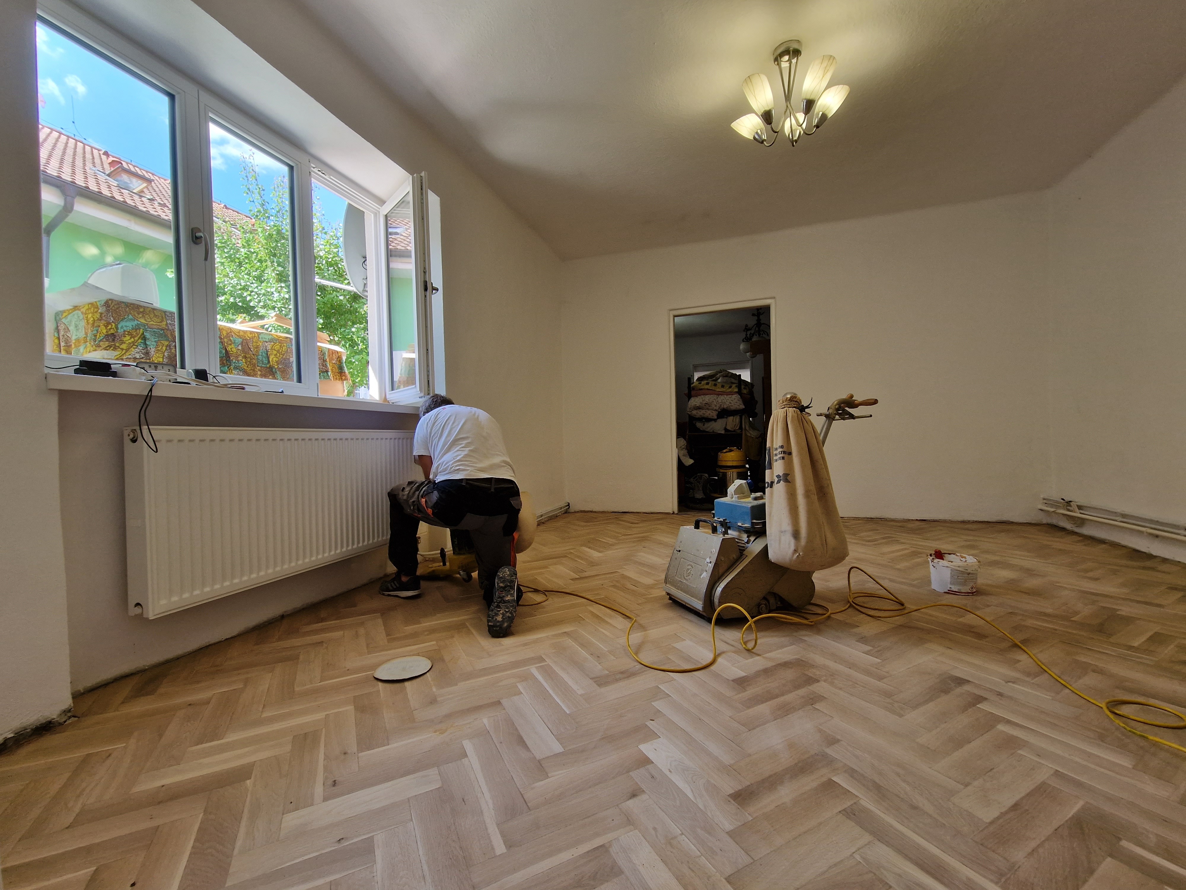 Brúsenie, tmelenie a lakovanie pôvodných parkiet, ktoré tam pred 50 rokmi nechali osadiť moji rodičia.
