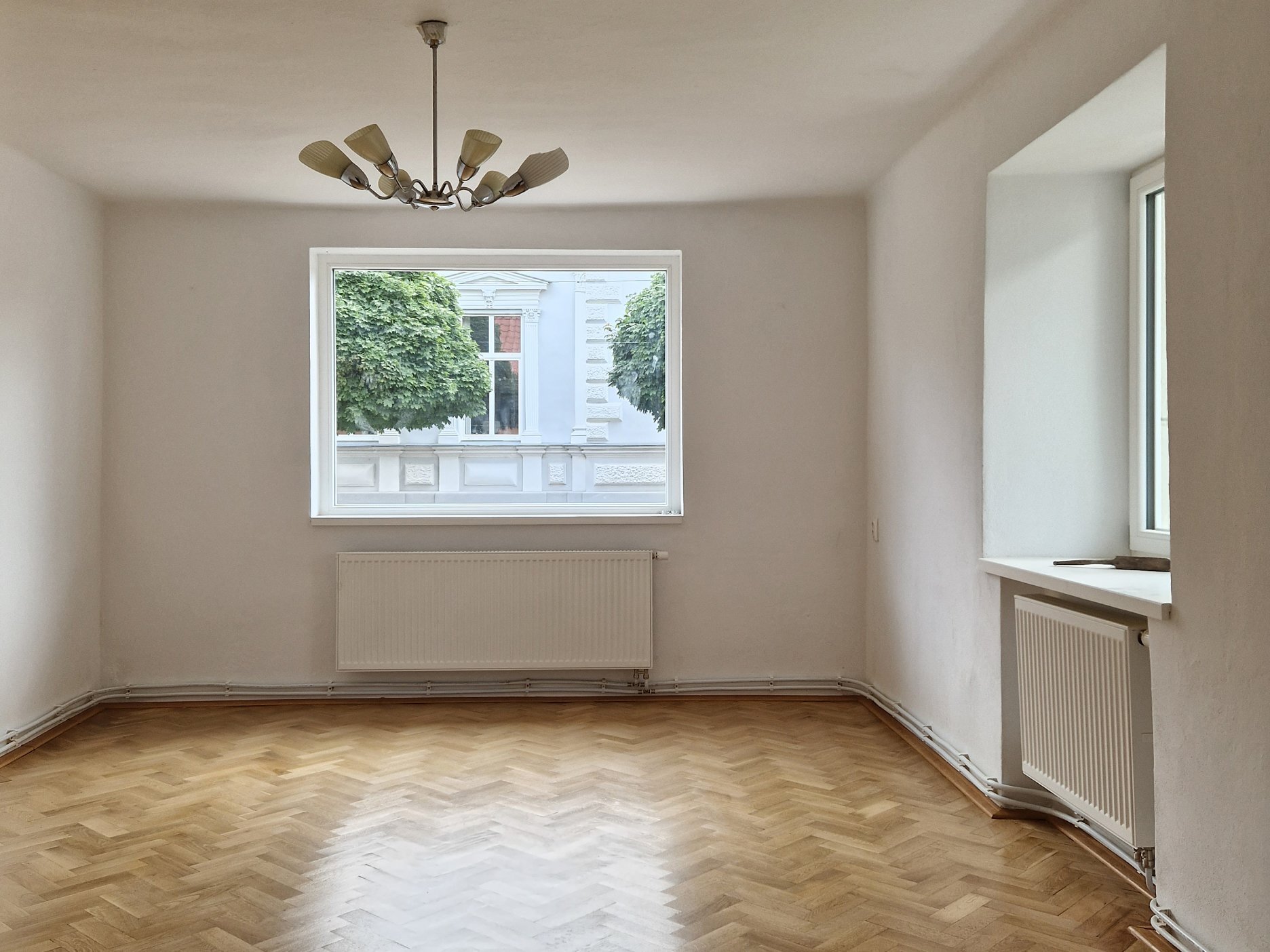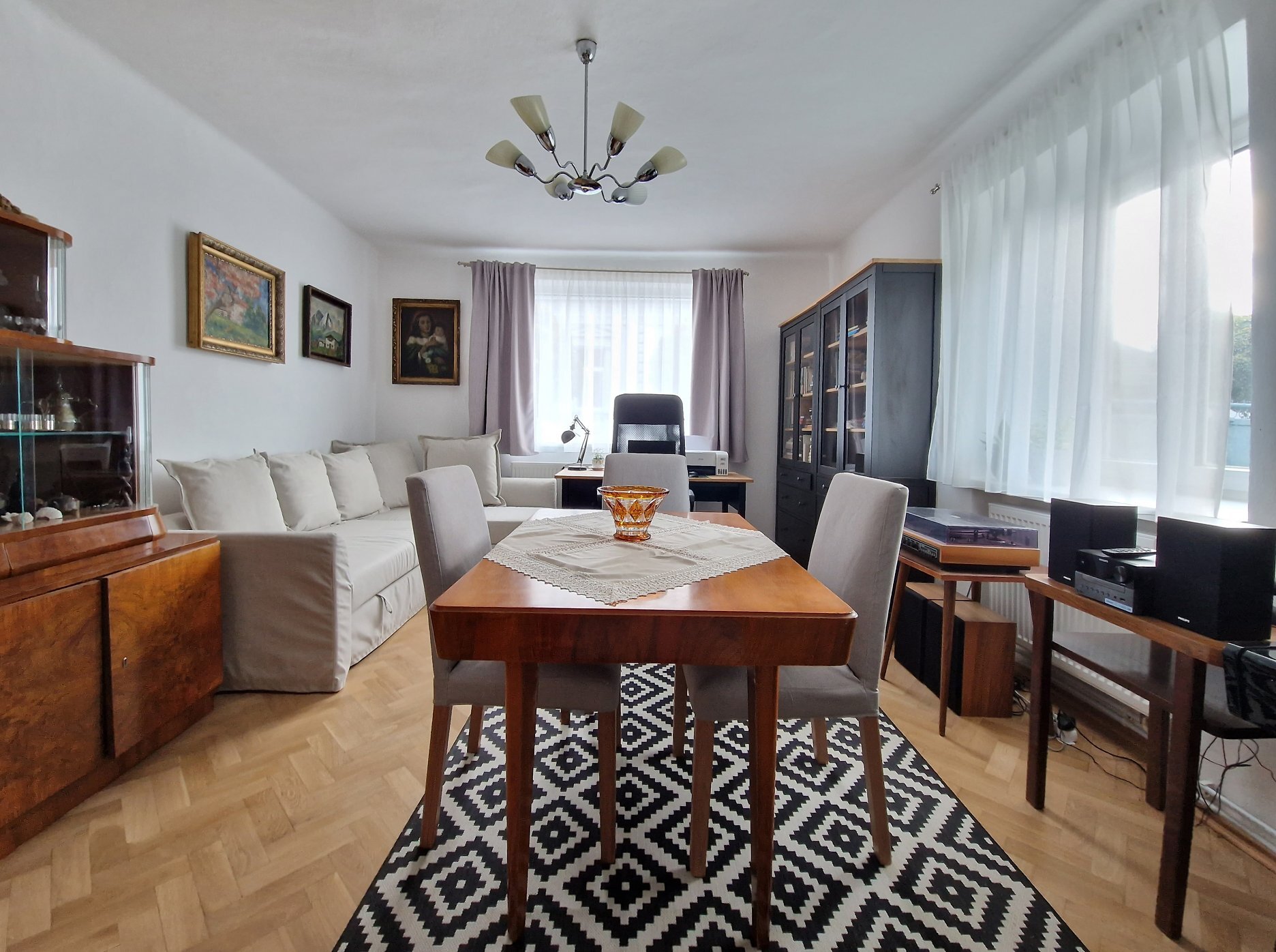 Obývacia izba nanovo vymaľovaná, s novými oknami, s novými rozvodmi ÚK a novými radiátormi, s obnovenými pôvodnými parketami, ktoré boli prebrúsené, zatmelené a nalakované.