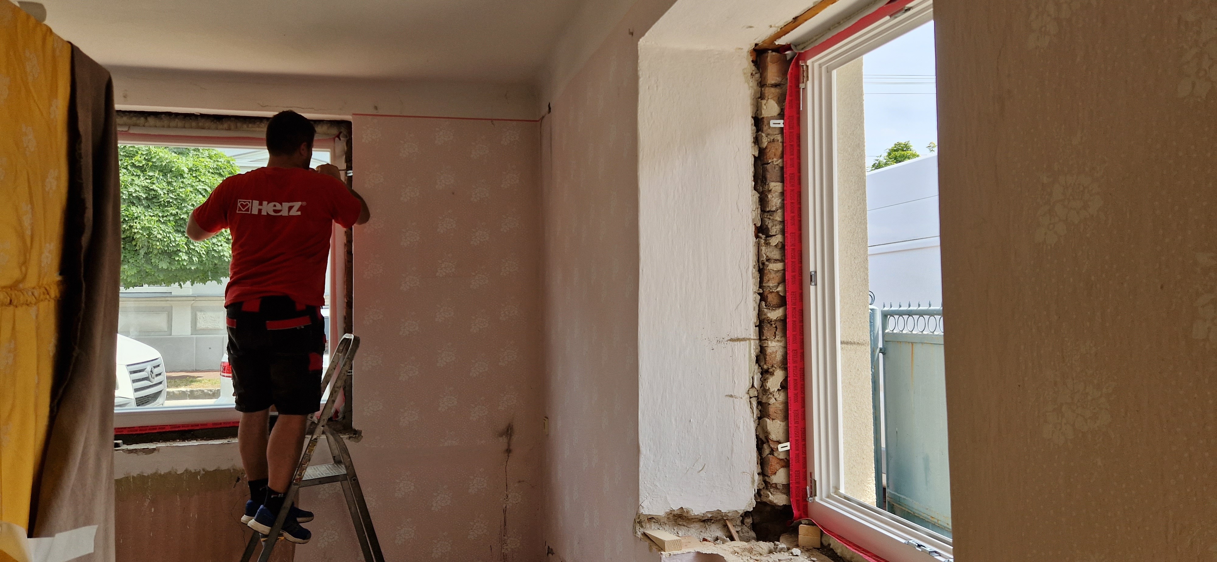Obývacia izba v priebehu stavebných prác, pri montáži nových okien.