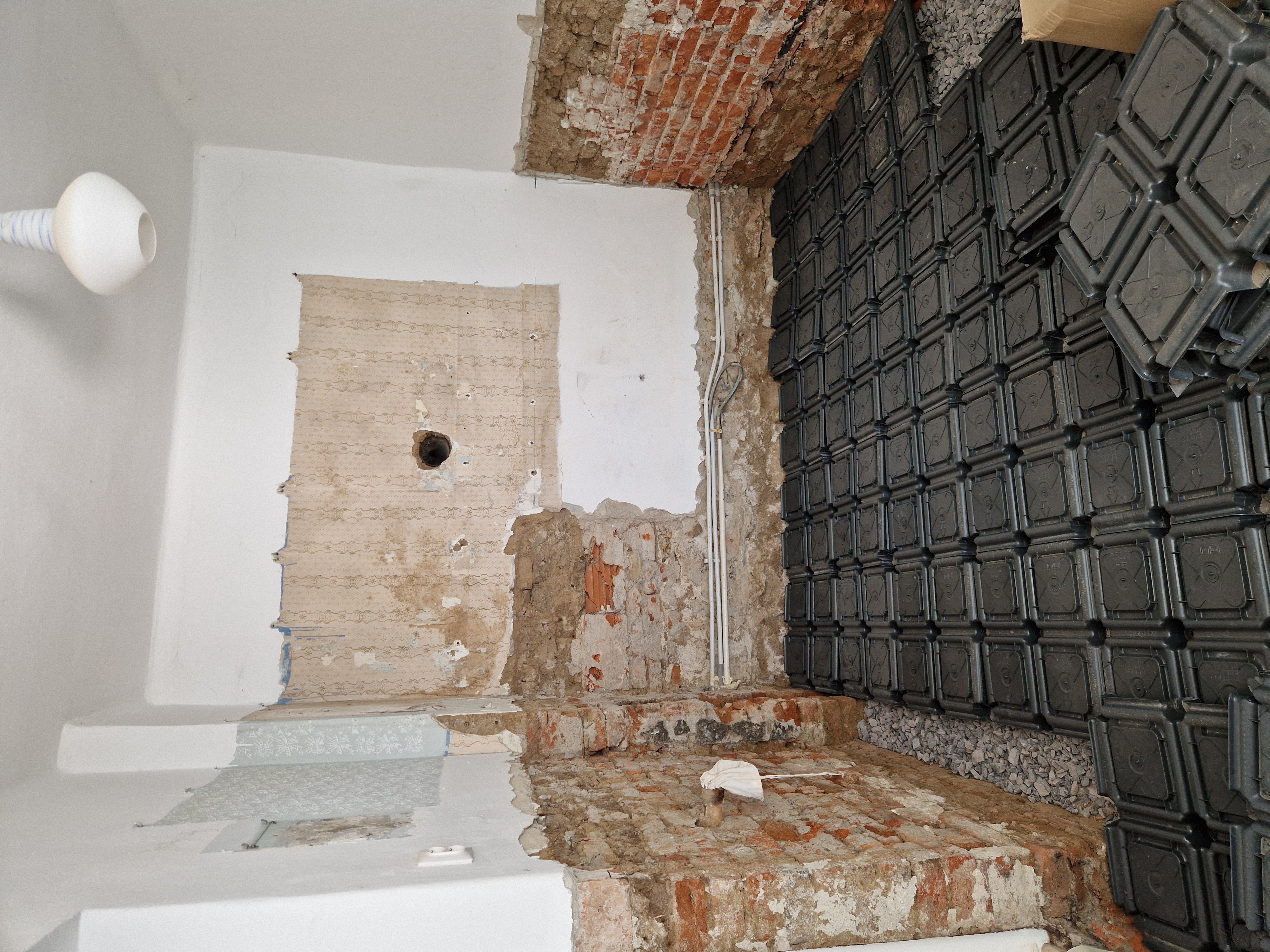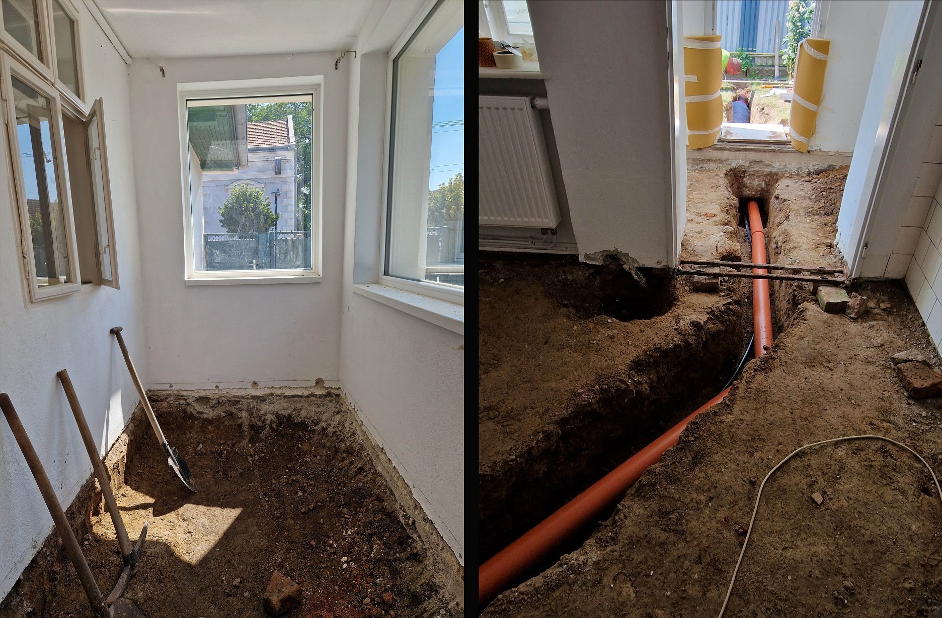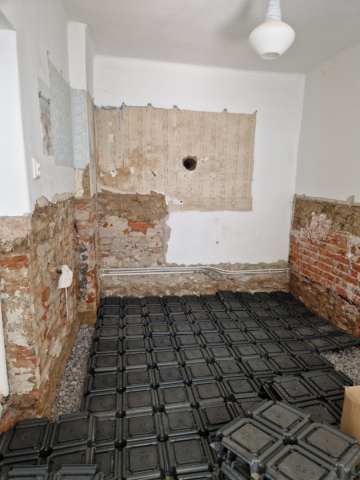 Z dôvodu značnej vlhkosti a vysokej hladine spodnej vody na pozemku boli odstránené všetky vrstvy pôvodnej podlahy.