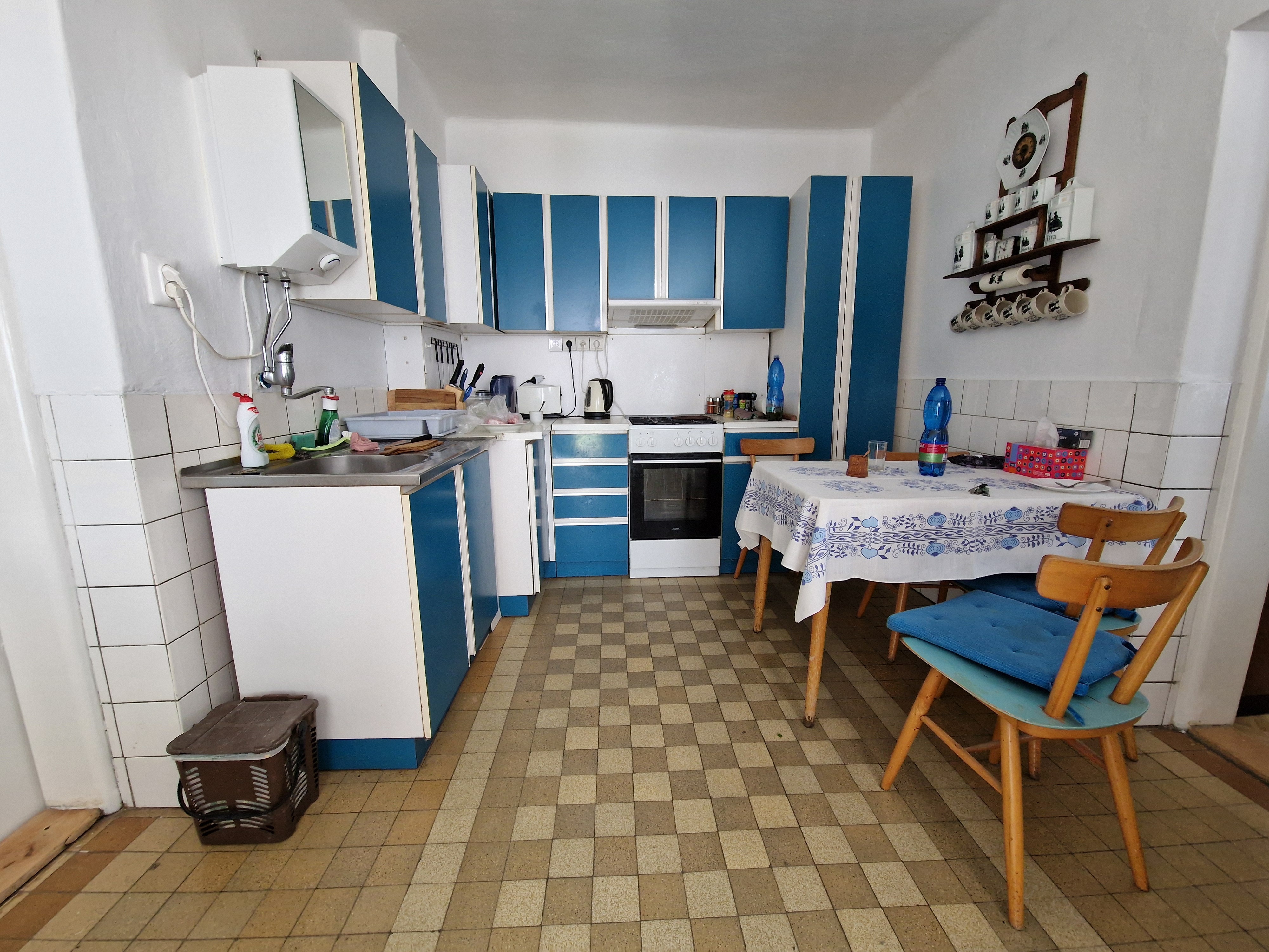 Kuchyňa pred Obnovou, s historickou kuchynskou linkou Carmen z produkcie Mier Topoľčany, približne z roku 1979.