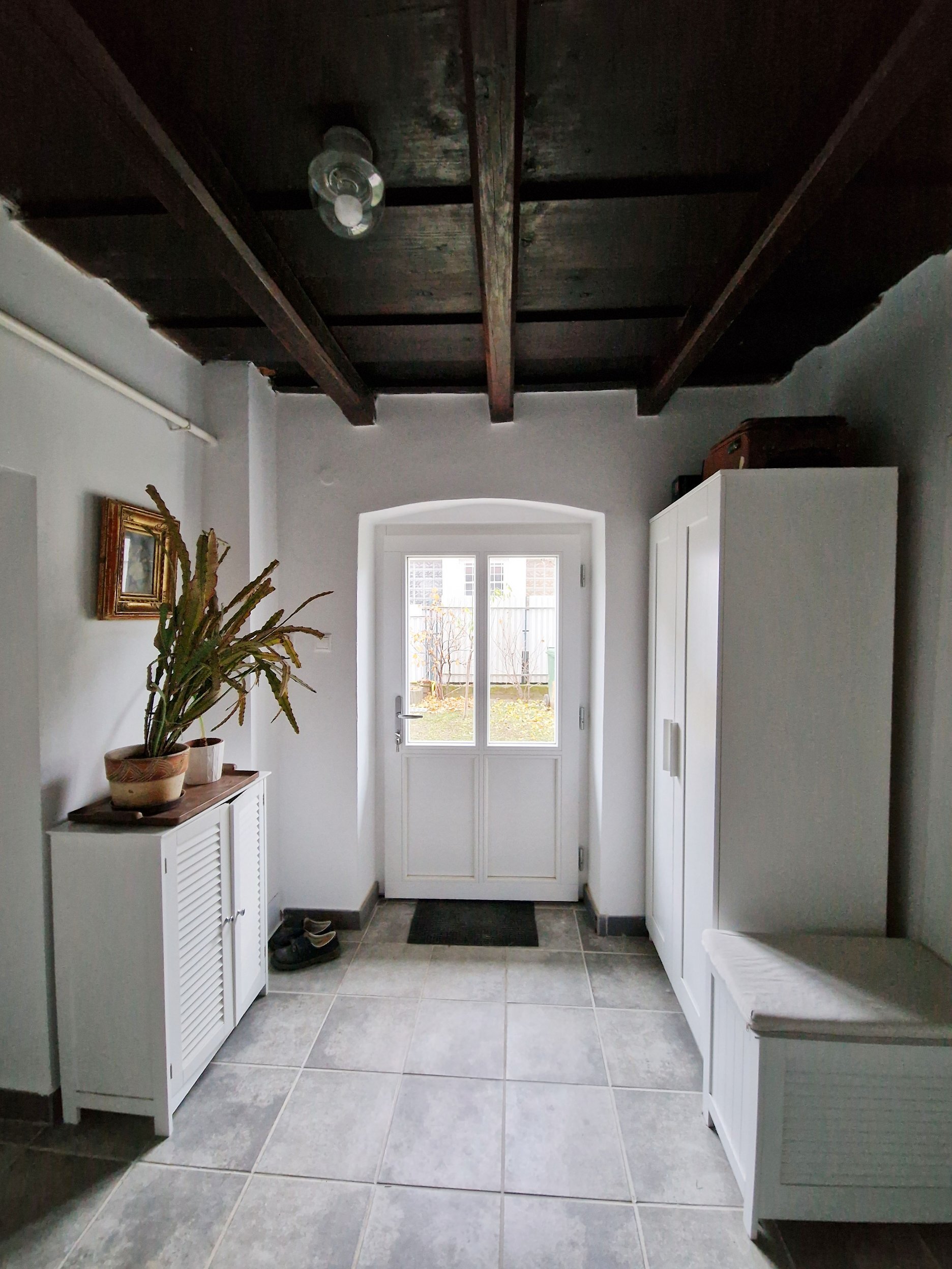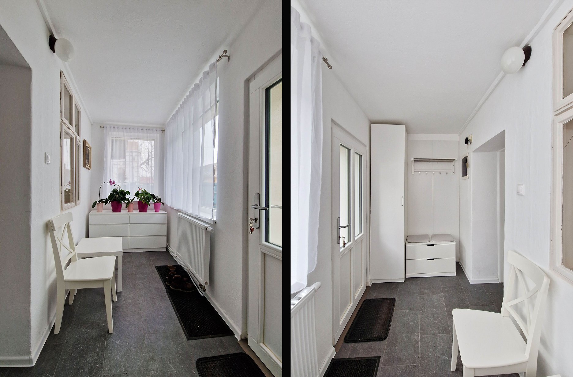 Predsieň po Obnove, s novou odvetranou podlahou a protišmykovou dlažbou, s novými oknami a dverami a s novým nábytkom.