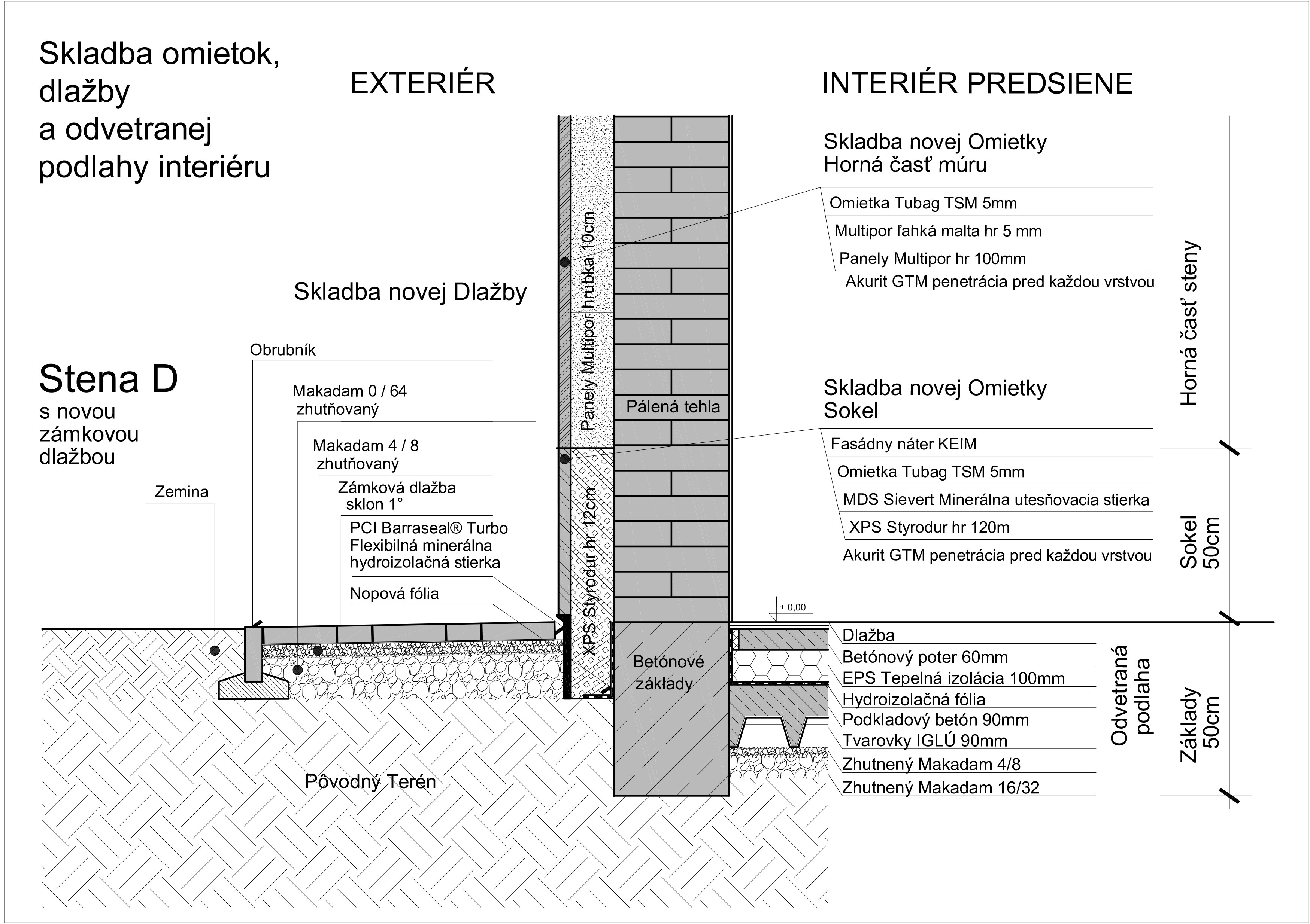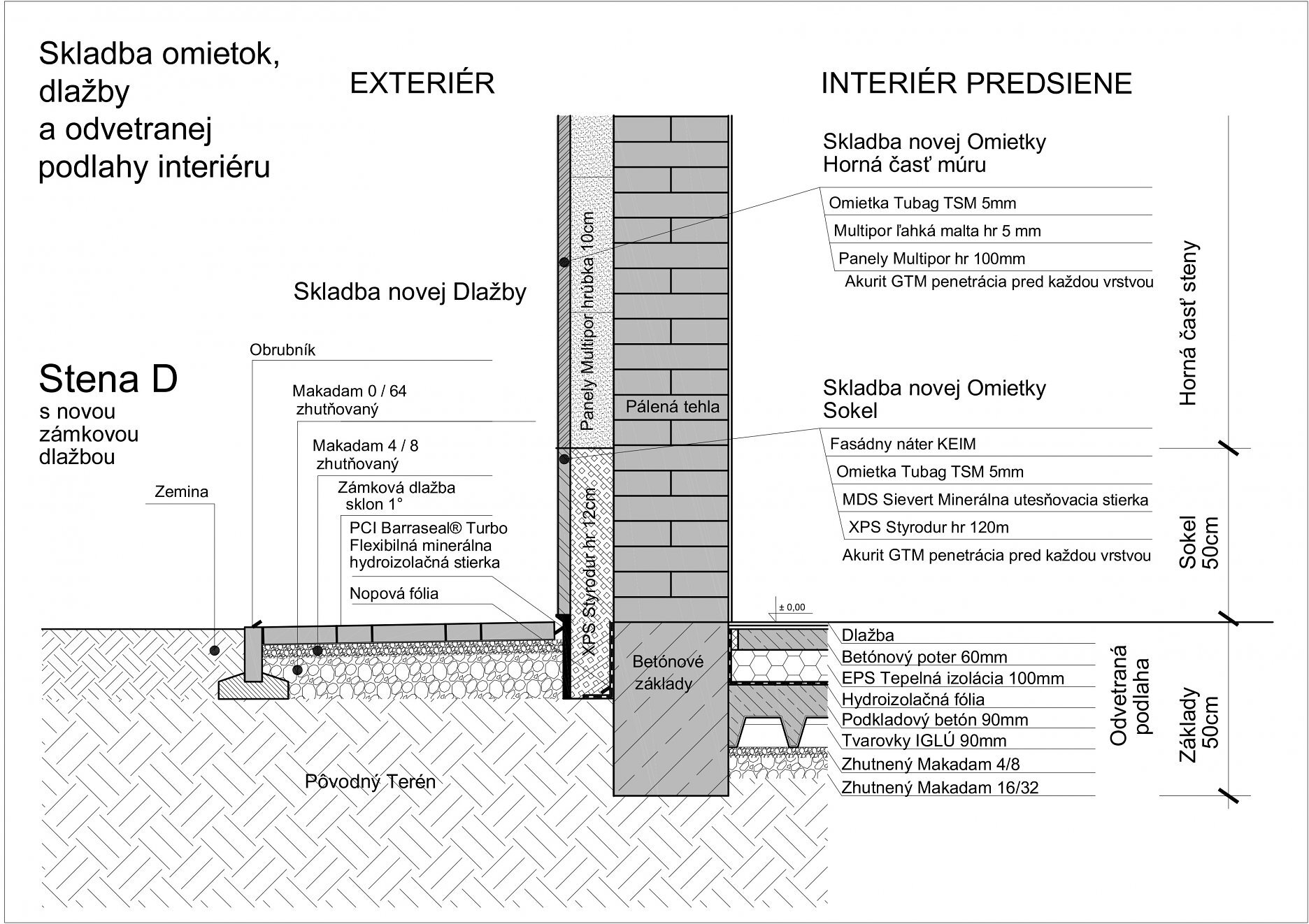 Na spodnú vrstvu z makadamu sa na celú plochu podlahy predsiene a kuchyne boli položené plastové tvarovky Iglu, ktoré tam vytvárajú odvetrávanú vzduchovú vrstvu. Nasávanie odvetrávania je riešené z dvora cez stenu predsiene, odsávanie je vytvárané komínovým efektom. Vyústenie odsávania je na druhej strane priestoru, zabudované do pôvodného komína.