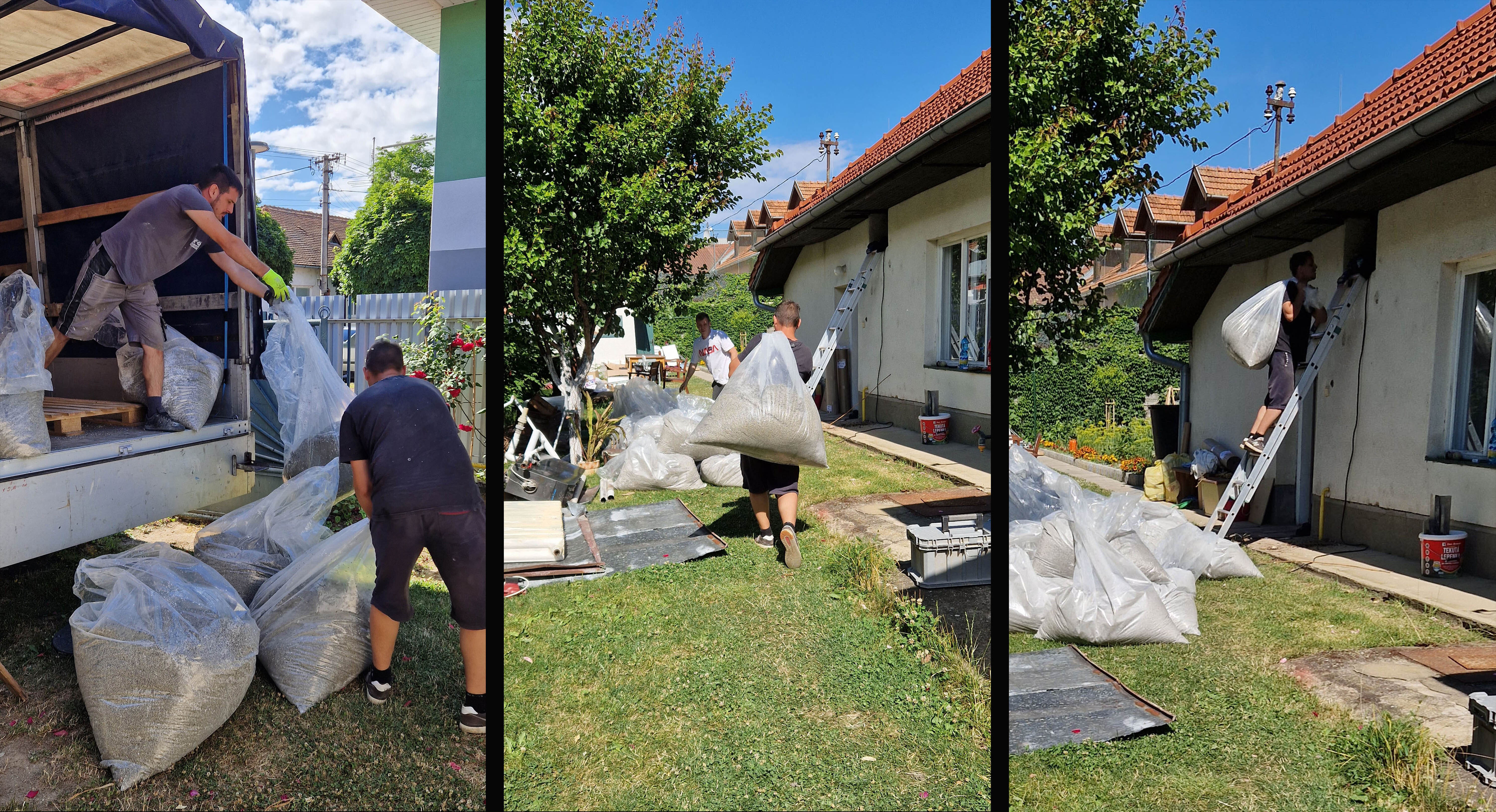 Vynášanie čerstvo namiešaného Styrcomixu do priestoru podkrovia.