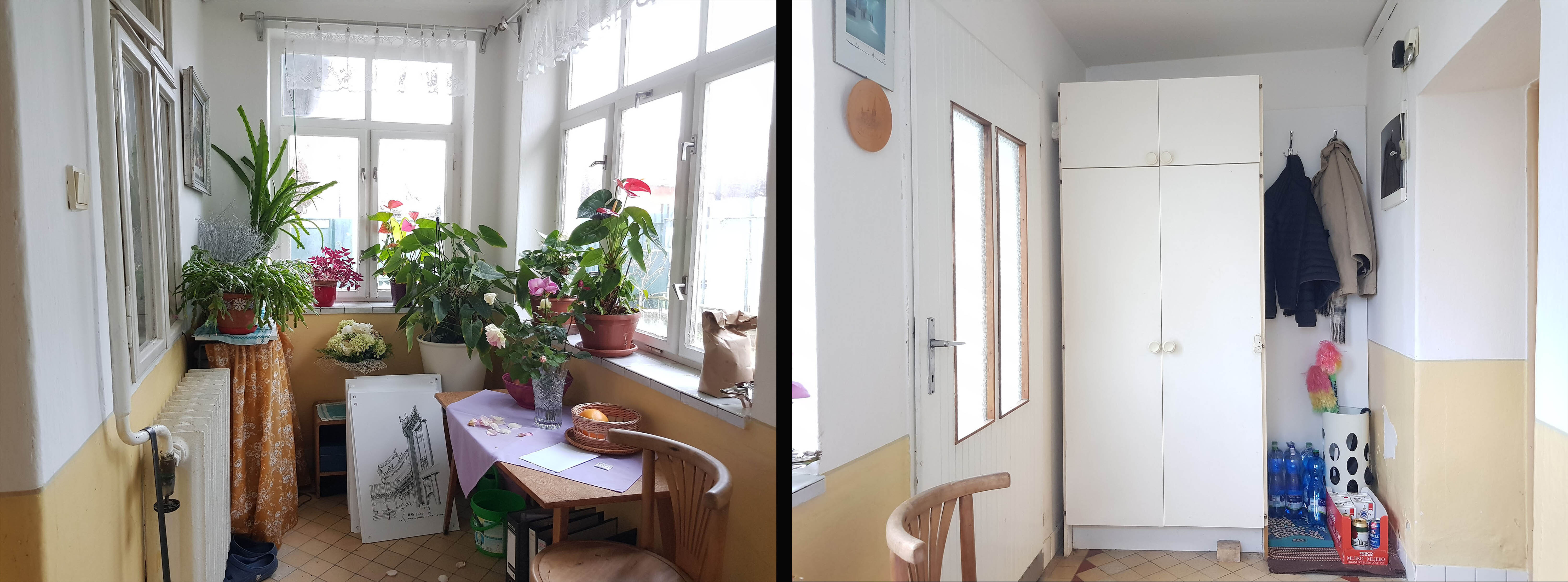 Predsieň pred Obnovou, s pôvodným značne schátraným nábytkom a so starými schátranými zatekajúcimi oknami a dverami.
