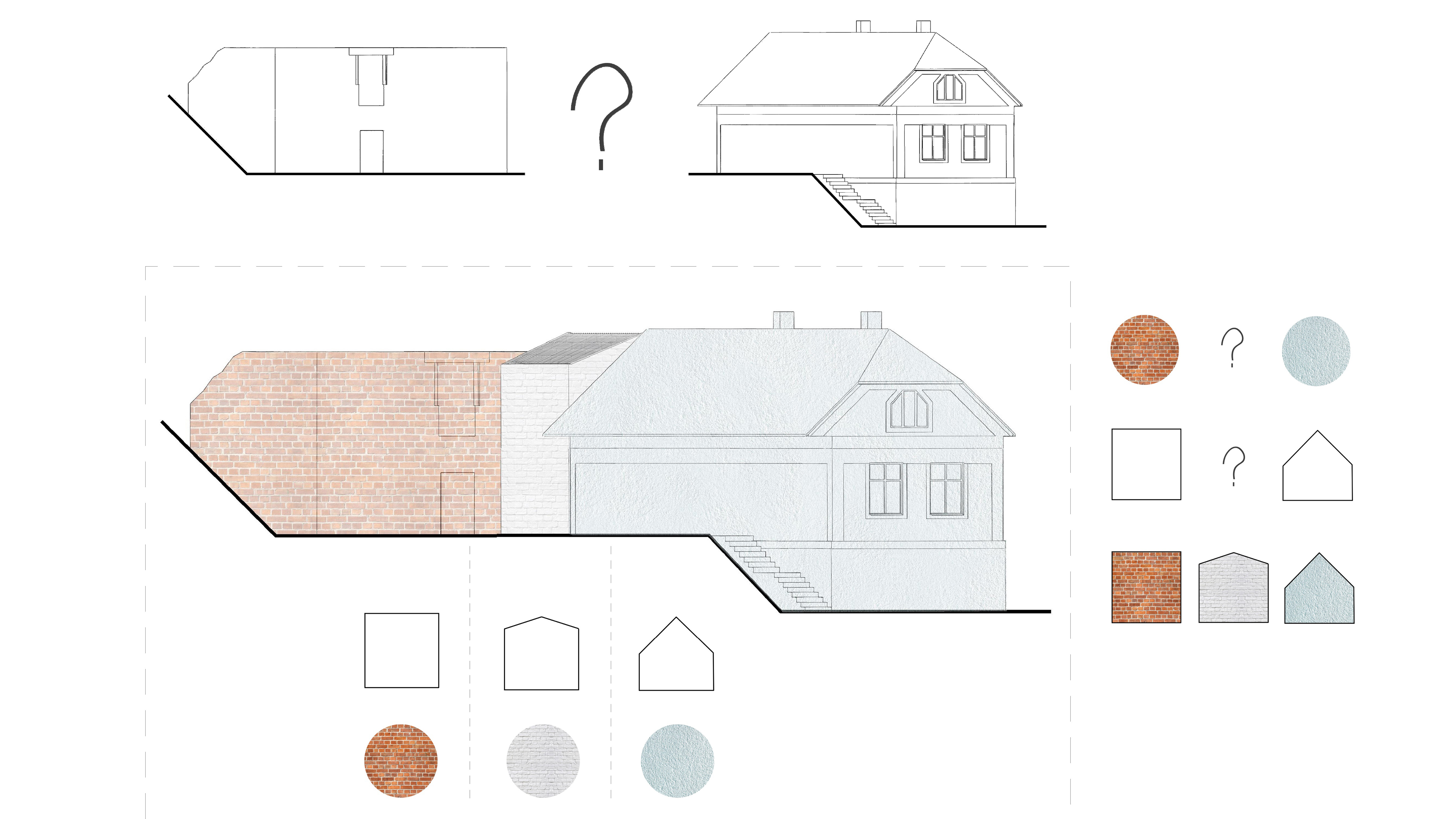 Samotná prístavba bude nasledovať pôvodnú štruktúru tradičného domu a ustupujúcou čelnou stenou na seba nebude upozorňovať. Materiálové riešenie priečelia navrhovanej prístavby reaguje na okolité materiály. Hlavným materiálom udávajúci štruktúru je plná pálená tehla, ktorá bude odobratá z ruiny starej stodoly stojacej za domom a následne použitá v prevetrávanej fasáde. Tá bude natretá bielou farbou, ktorá prepojí myšlienku omietania a farbenia - ako je možné badať na tradičnom dome. Tradičnému domu sa prinavráti modrastá farba na znak pôvodnej farebnosti.