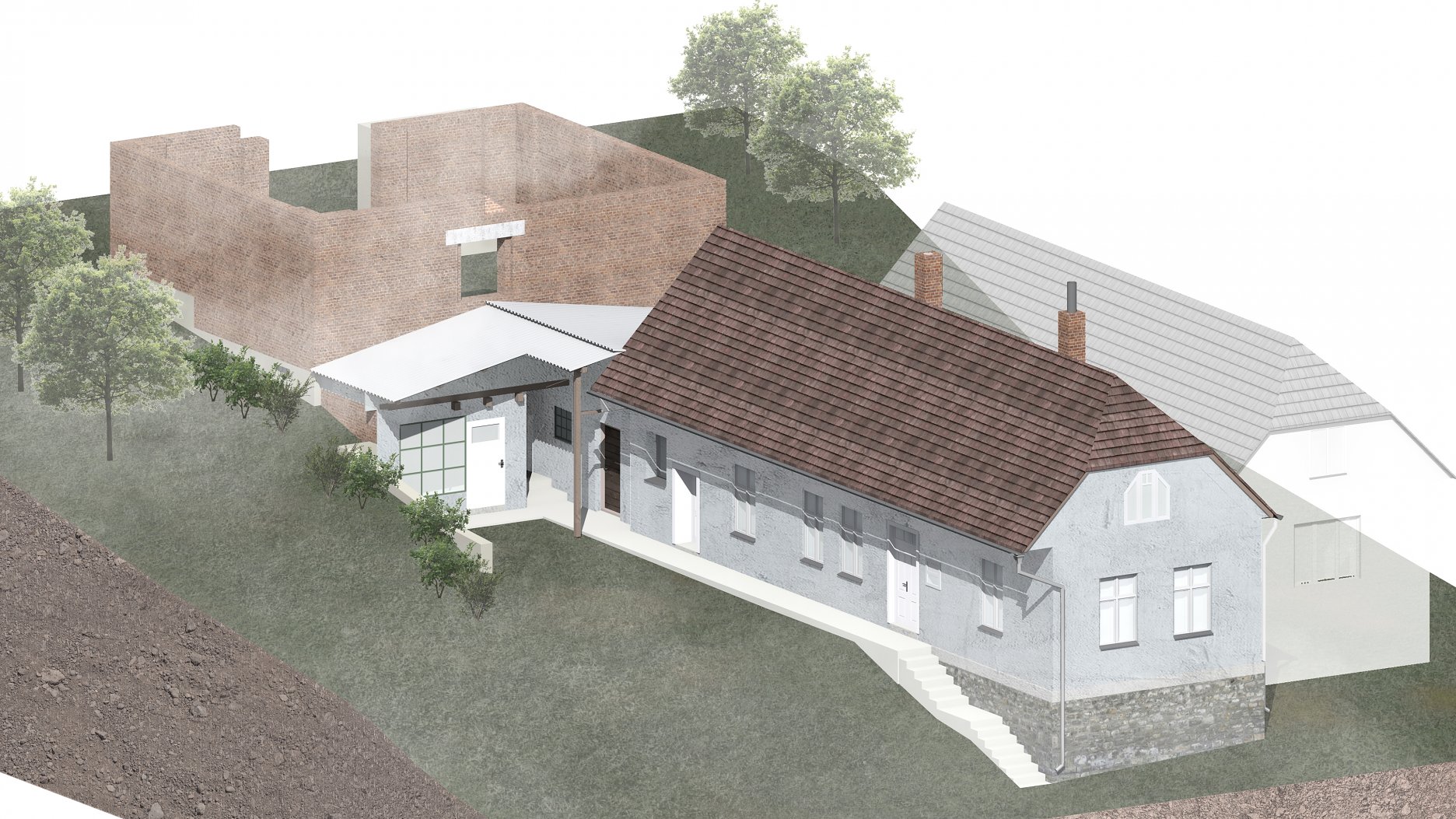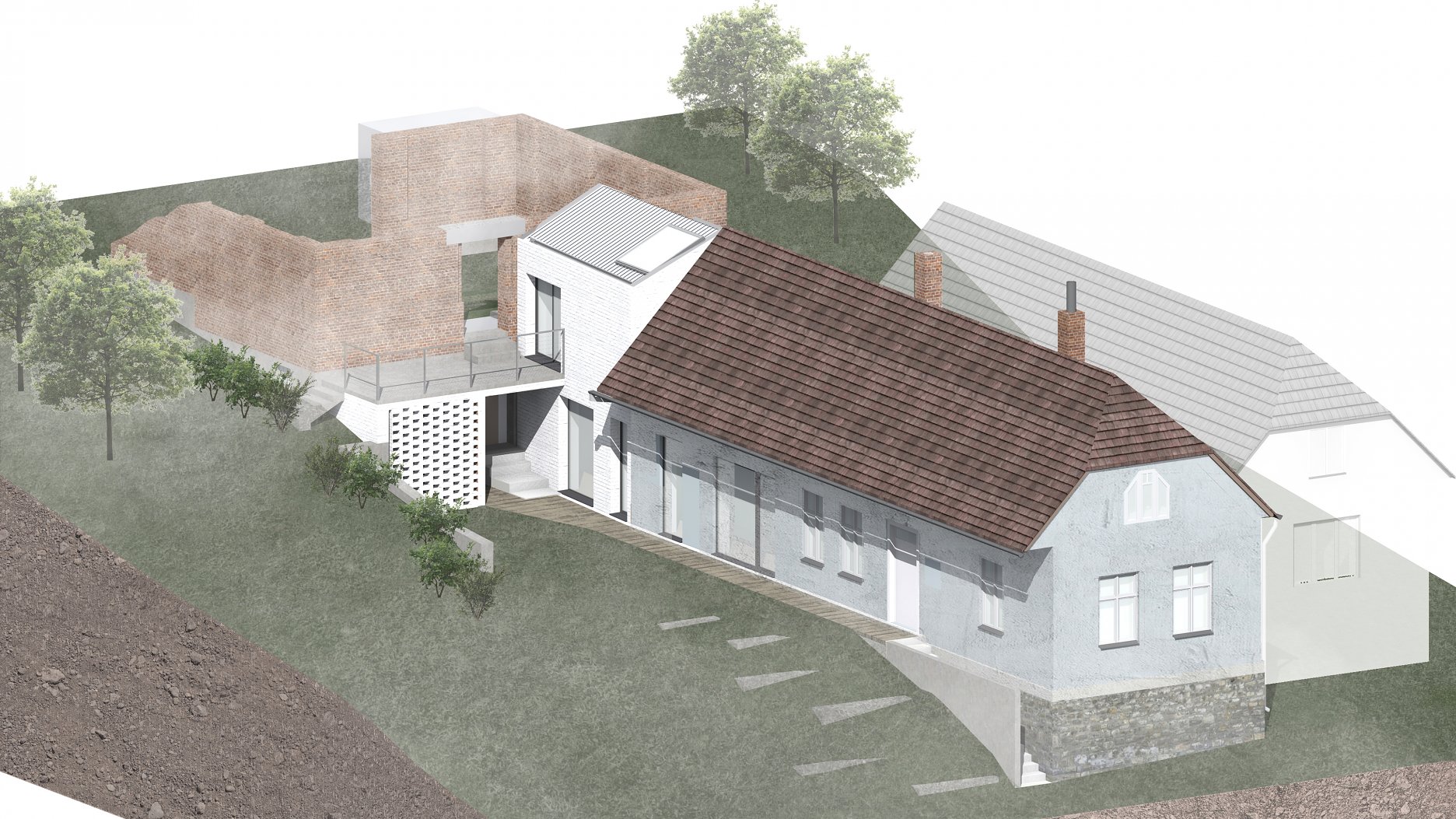 Odstránená následne pridaná hmota sa teda nachádza medzi starou stodolou a obnovovanou časťou. Nová štruktúra v tejto polohe nenarúša pôvodný vzhľad objektu a z urbanistického hľadiska ostáva v pôvodnej stope predošlých prístavieb (prílepkov), ktoré budú odstránené. Vďaka tomu je možné nenavýšiť zastavanú plochu, samotná prístavba bude nasledovať pôvodnú štruktúru tradičného domu a ustupujúcou čelnou stenou na seba nebude upozorňovať. Zvýraznený bude vchod k zachovaným pivniciam pod starou stodolou. V mieste pôvodného záhradného domčeka je navrhovaný nový záhradný domček, ktorý bude svojou hmotou a materiálovým riešením opticky pričlenený k novej prístavbe domu. Zároveň tak vzniká krytý priestor pri vstupe do pivničných priestorov a terasa, ktorá funkčne i opticky prepája 2. nadzemné podlažie obytných izieb s exteriérom (ruinami starej stodoly a záhradu).