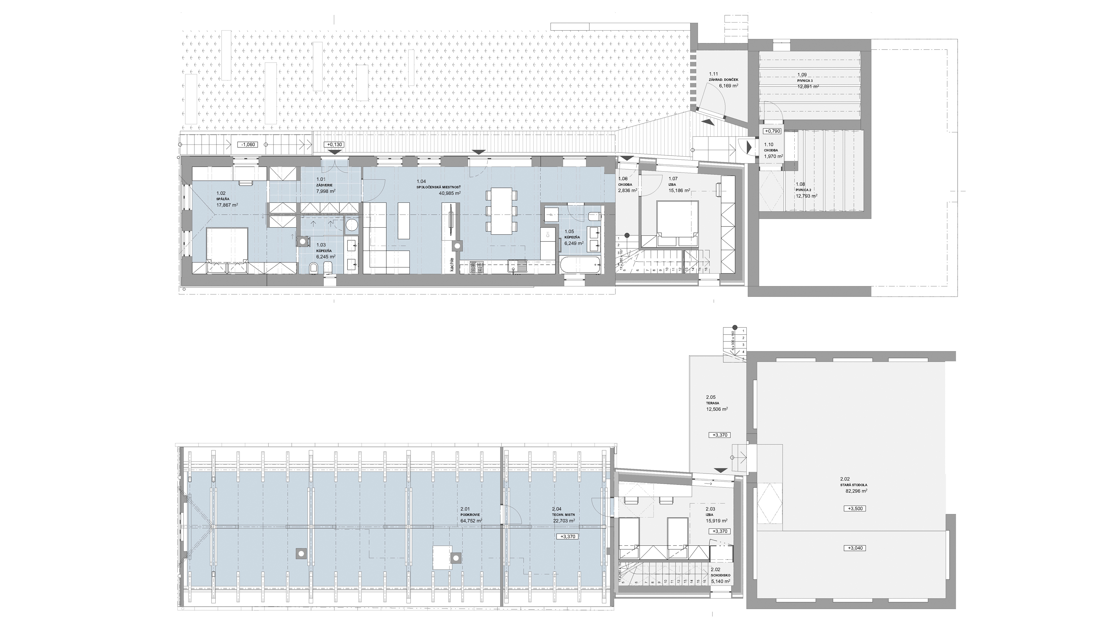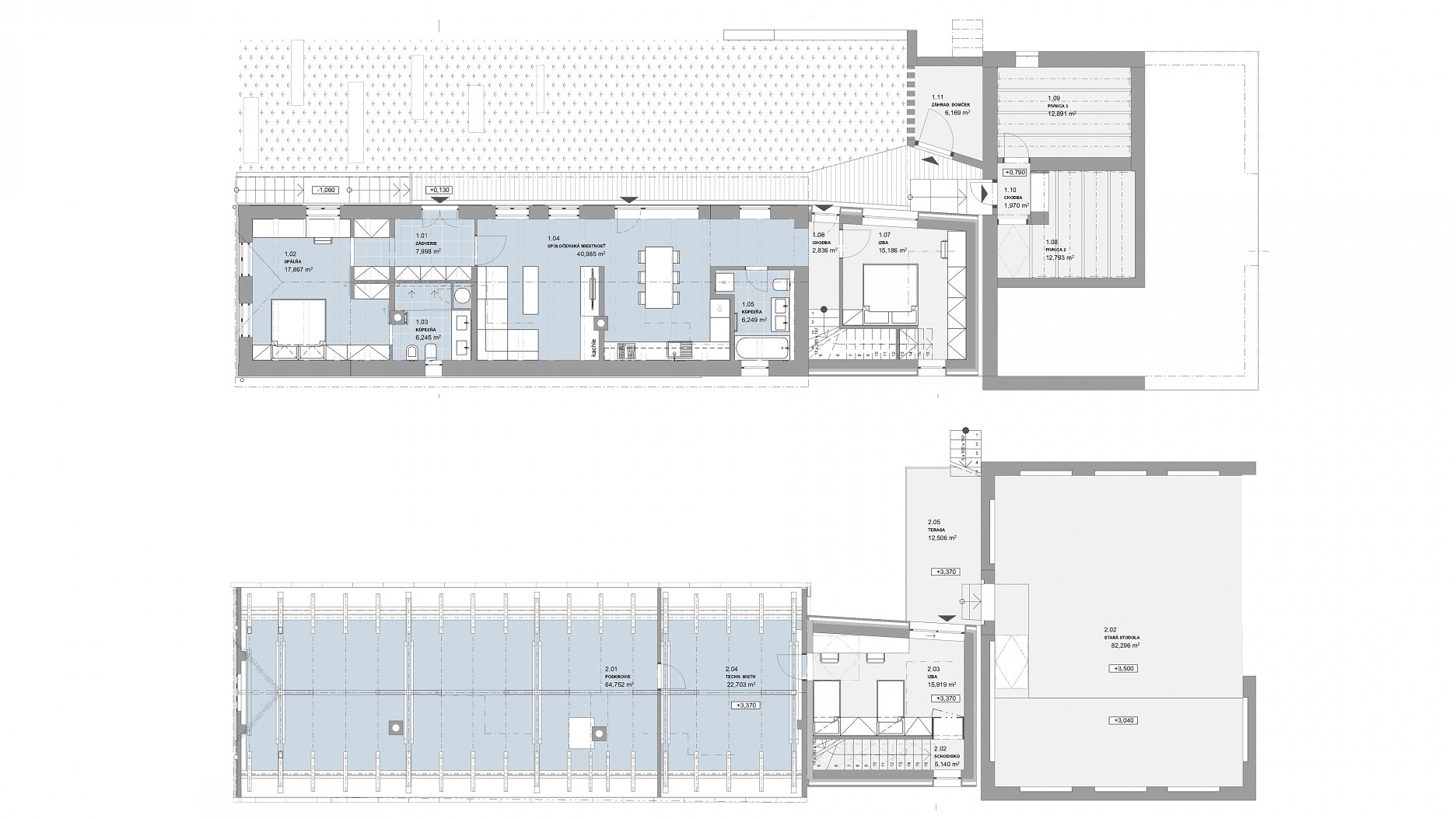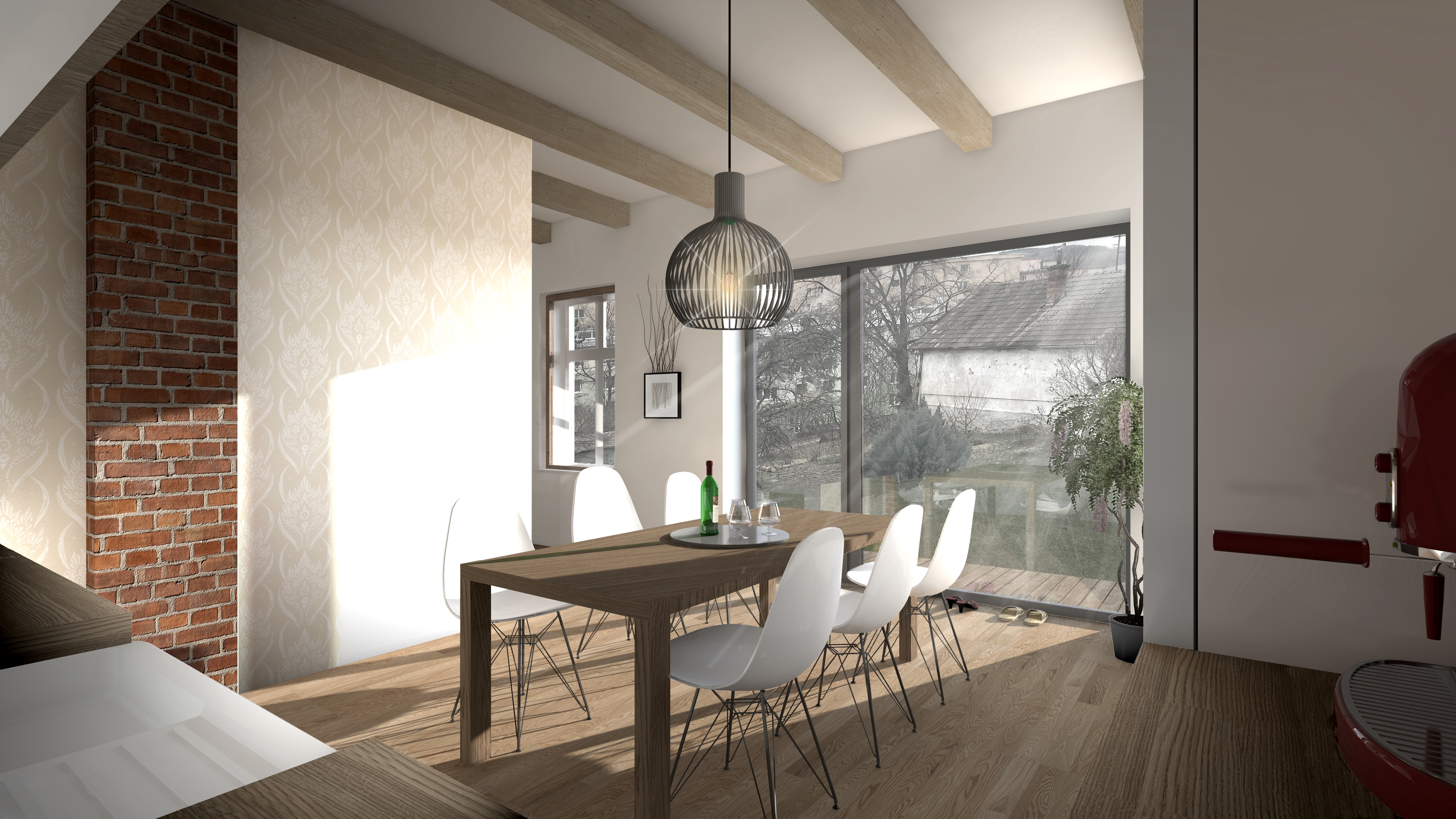 Pôvodný objekt ostáva ako ústredný pre spoločenskú časť. Hlavný vchod sa nachádza na pôvodnom mieste, pri terénnych schodoch. Z hlavného vstupu sa dostávame do zádveria so šatníkovým priestorom, cez ktorý je možné prejsť do spálne. Umiestnenie spálne je tiež v pôvodnom stave ako zádverie a kúpeľňa, no v novom stave sa kúpeľňa stáva privátnou iba pre spálňu, vďaka čomu sa môže neskôr transformovať na hosťovskú izbu. V kúpeľni sa nachádza priestor na kotol, murovaný sprchový kút, dvoj-umývadlo, WC a bidet. Cez zádverie sa dostávame do spoločenskej časti. Tá je po celej dĺžke prepojená chodbou, ako ponáška na pôvodné dispozičné riešenie. Prvý kontakt v priestore je obývacia časť, ďalej kuchyňa s jedálňou a nakoniec chodba smerujúca k prístavbe a ku kúpeľni.