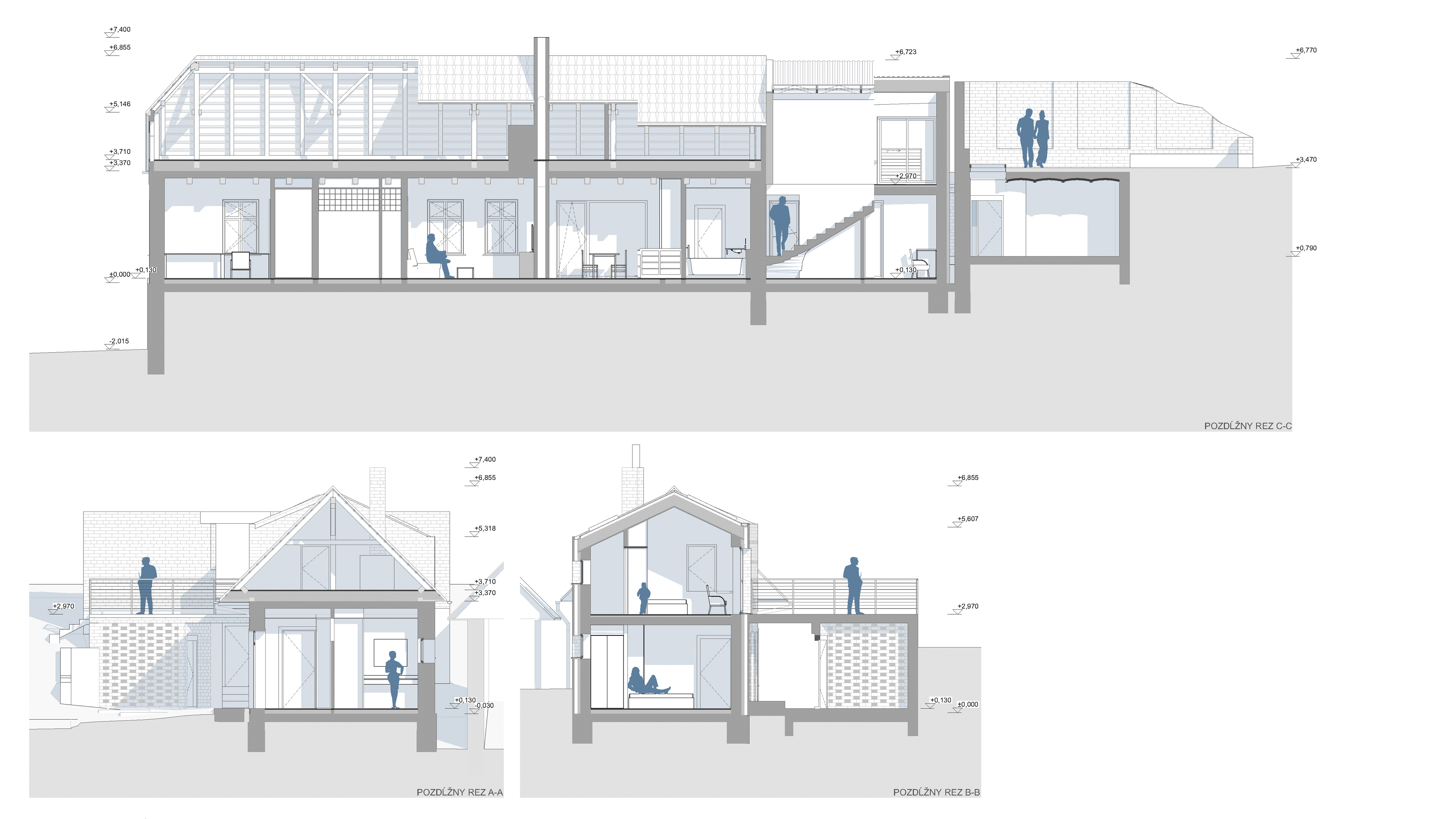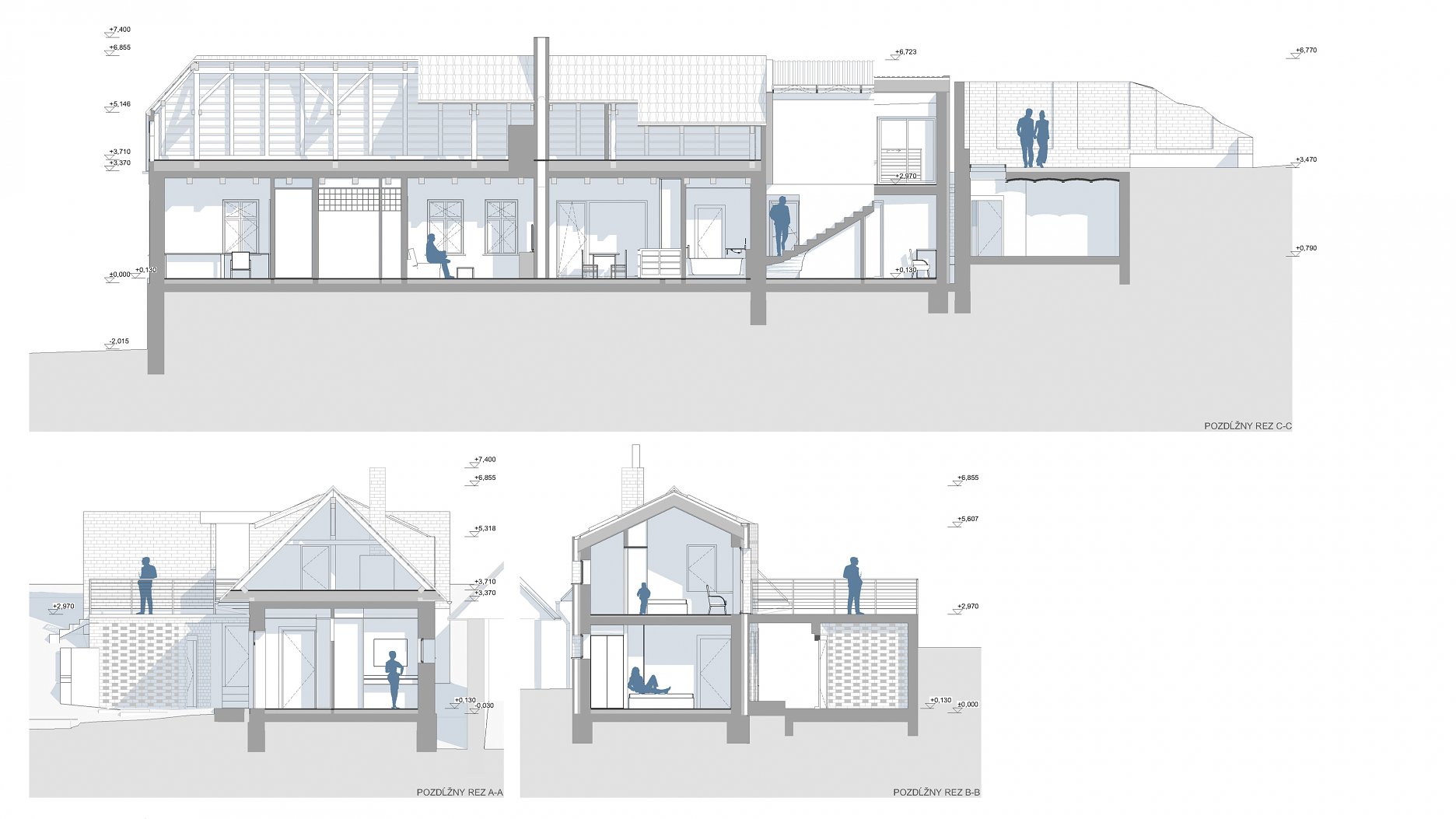 V zadnej časti domu smerujúcej k vyvýšenému terénu sa v súčasnosti nachádzajú prístavby v podobe pivníc, záhradného domčeka, vyhorenej stodoly, ktoré sa časom pristavovali k pôvodnej tradičnej štruktúre. Vnímame ich ako prílepky, ktoré tam časom vznikali podľa potrieb majiteľa. Pôvodné prílepky však nespĺňajú súčasné kritéria a nemajú vyššiu hodnotu, pre ktorú by bolo vhodné ich formu zachovávať. Práve ich odstránením je vytvorený potenciál pre požadované rozšírenie obytných kapacít formou umierneného novotvaru.