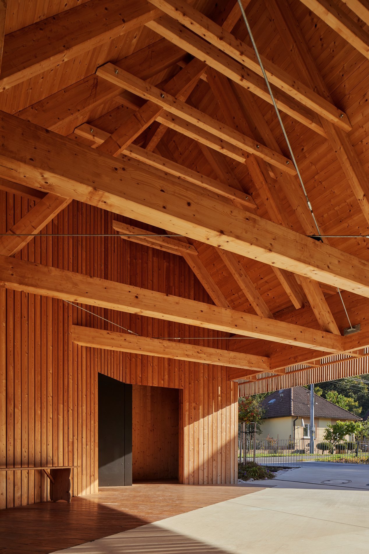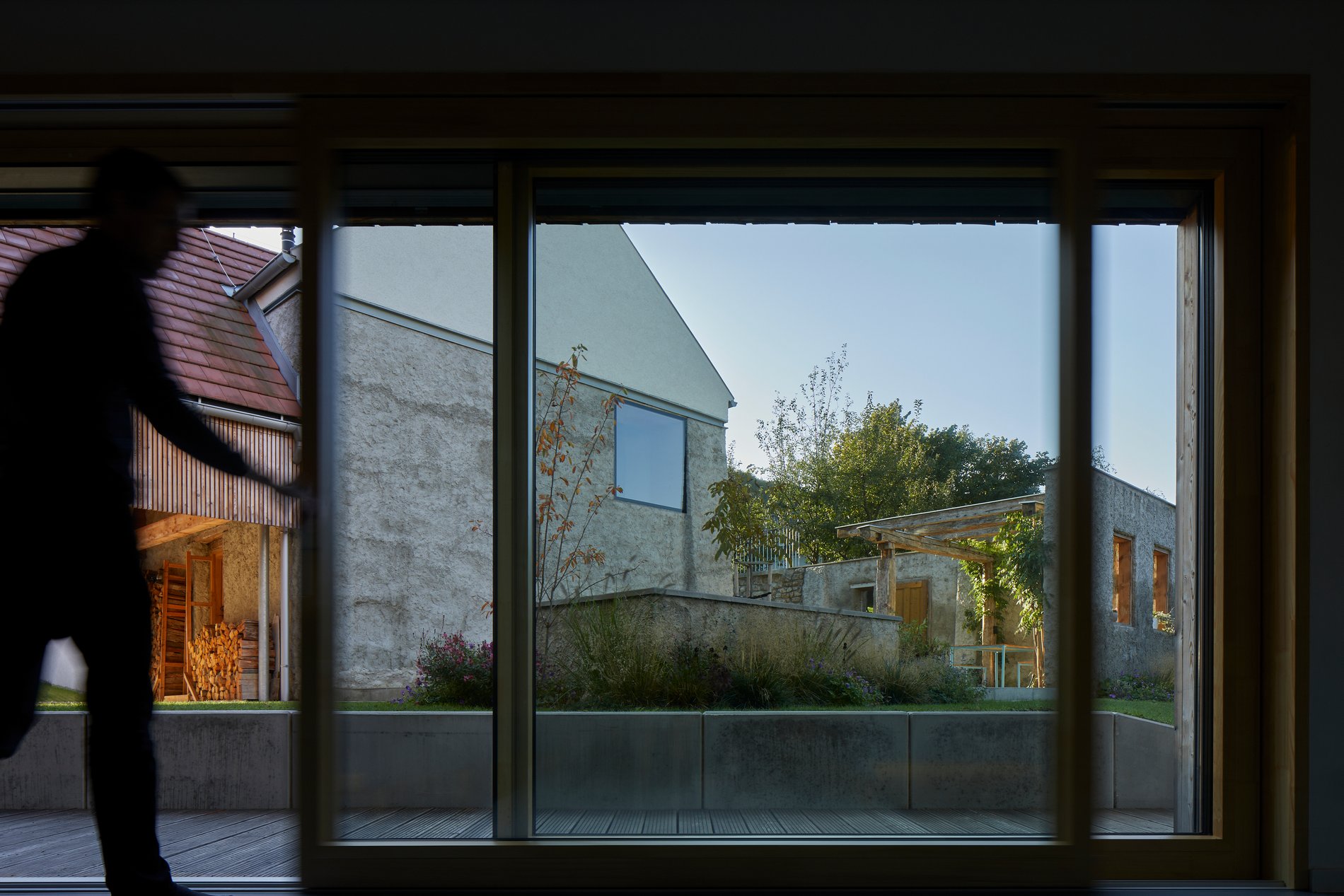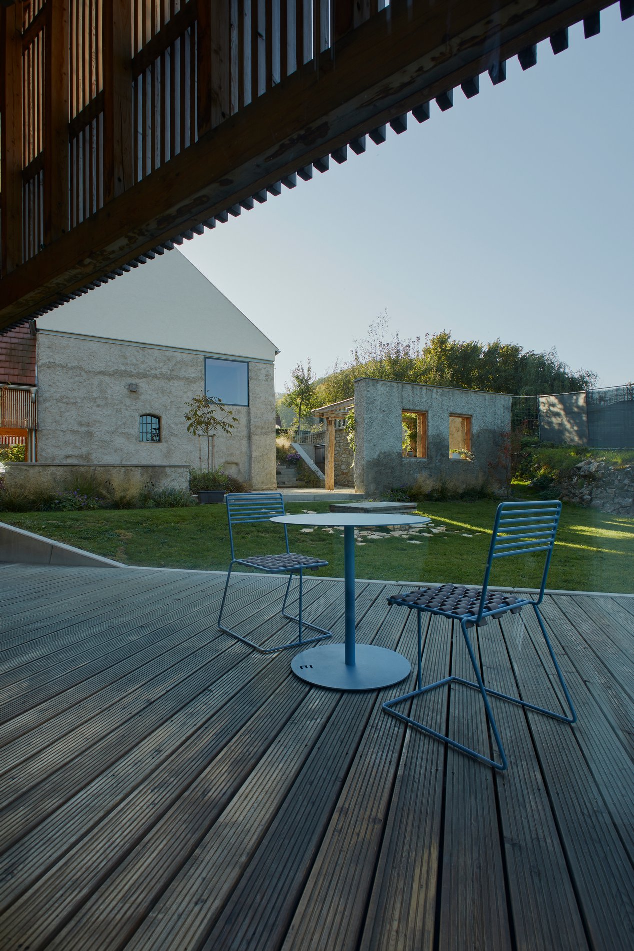 Zastřešení parkovacích stání nesou subtilní ocelové sloupy podepírající dlouhé lepené nosníky, které sahají od domu až ke mlýnu. Je do nich vetknutý mohutný krov s ležatou stolicí. Tato otevřená tesařská konstrukce se sama o sobě se stává esteticky důležitou součástí celé usedlosti. Je dimenzovaná tak, aby na vazné trámy v budoucnu bylo možné provést dostavbu další pobytové části domu. Mezi parkovacími stáními stojí jednoduchý objekt opláštěný poloprůhledným tahokovem. Slouží jako sklad zahradního náčiní a sportovního vybavení.