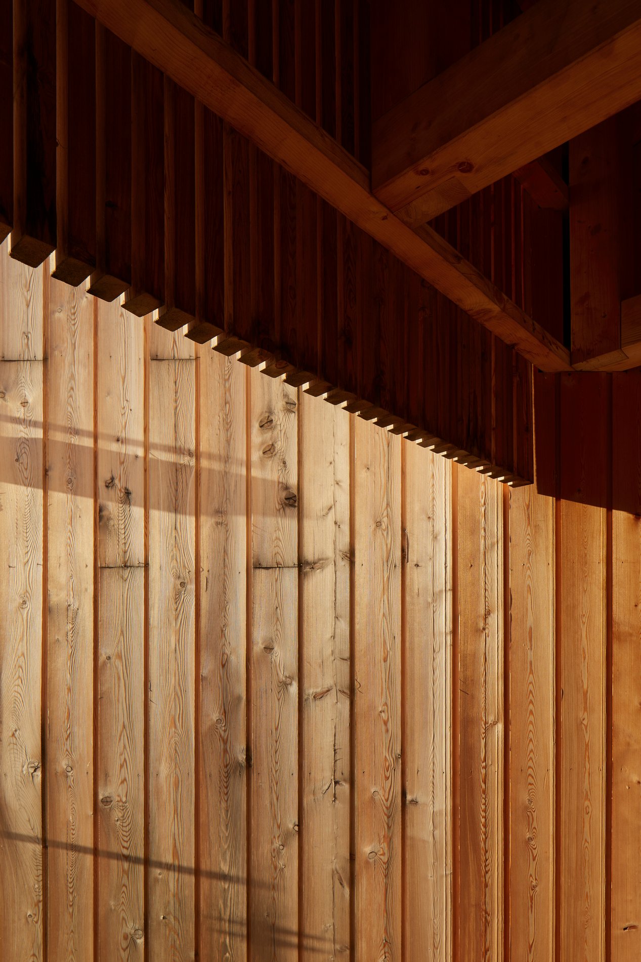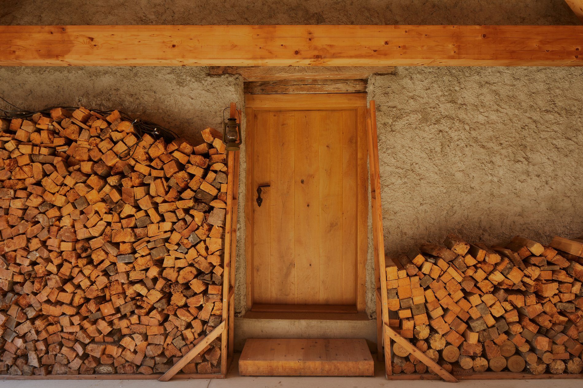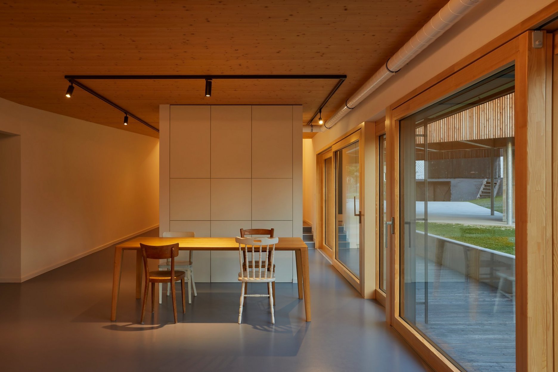 Zastřešení parkovacích stání nesou subtilní ocelové sloupy podepírající dlouhé lepené nosníky, které sahají od domu až ke mlýnu. Je do nich vetknutý mohutný krov s ležatou stolicí. Tato otevřená tesařská konstrukce se sama o sobě se stává esteticky důležitou součástí celé usedlosti. Je dimenzovaná tak, aby na vazné trámy v budoucnu bylo možné provést dostavbu další pobytové části domu. Mezi parkovacími stáními stojí jednoduchý objekt opláštěný poloprůhledným tahokovem. Slouží jako sklad zahradního náčiní a sportovního vybavení.