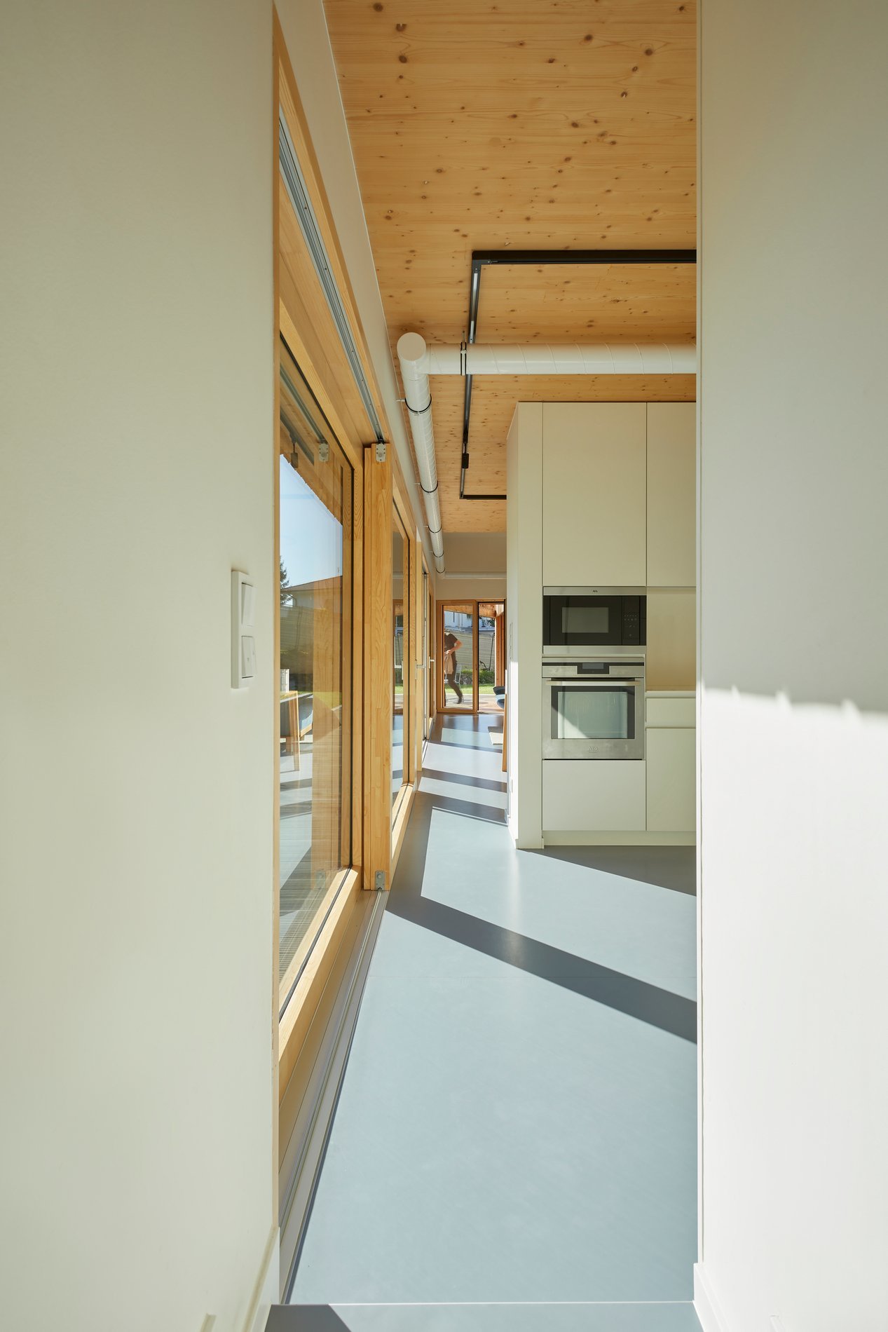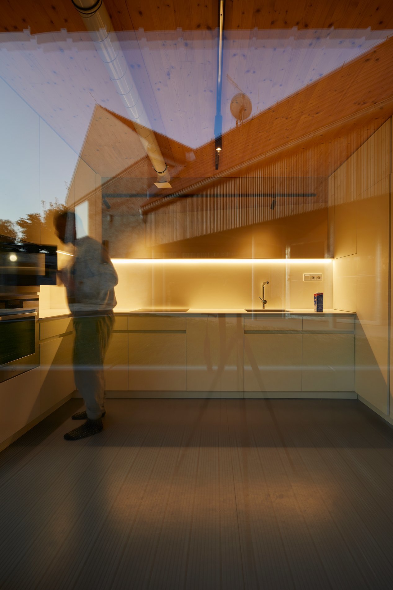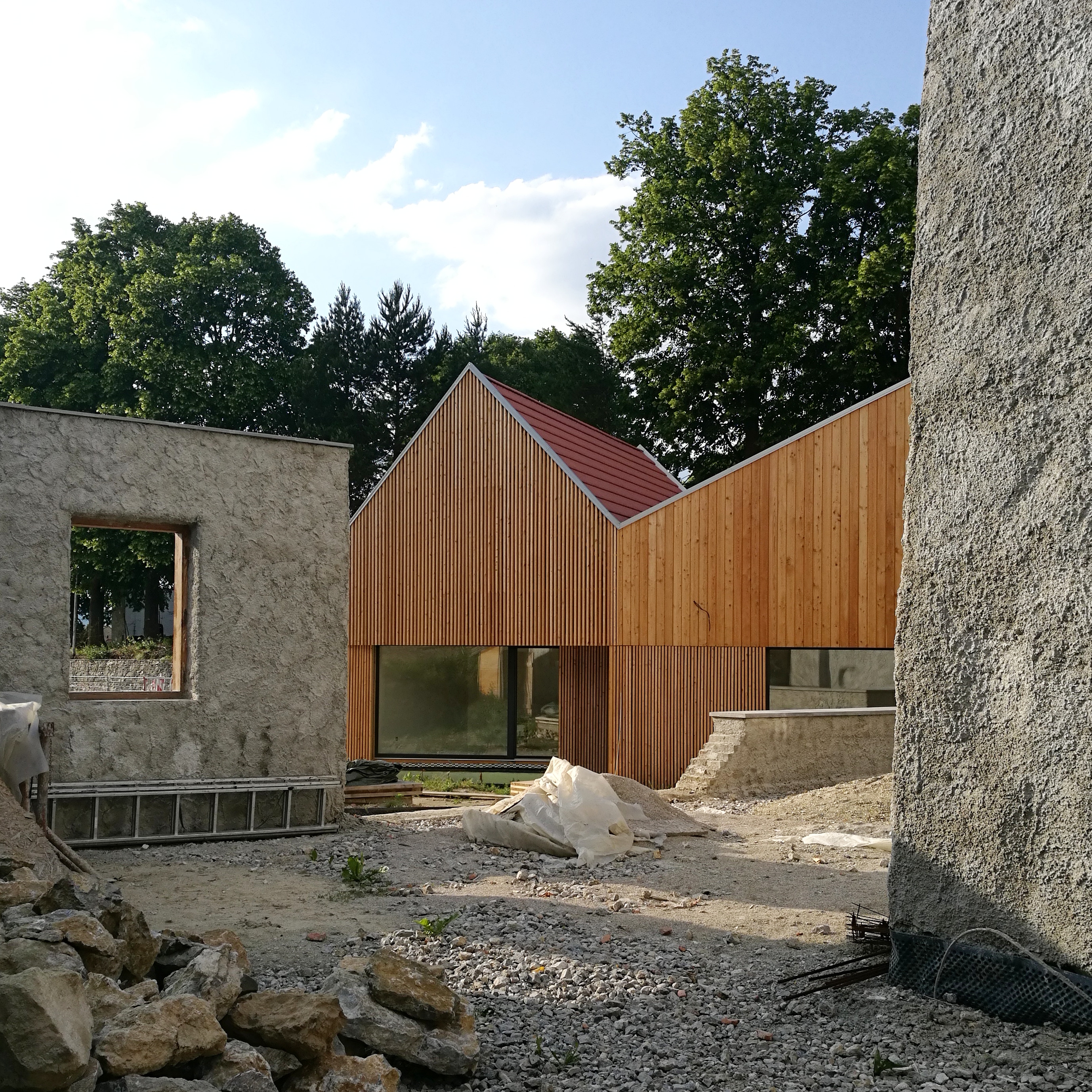 Novostavba rodinného domu se přimyká k potoku a svou hmotou vytváří soukromí na dvorku za domem. Vyniká siluetou tří nestejných navazujících sedlových střech. Díky nim v domě vzniká prostorová pestrost a umožňuje obyvatelům zažívat přechody z menších, spojovacích a užitkových prostor do někdy překvapivě velkých, otevřených, pobytových místností. Novostavba kontrastuje s historickým objektem mlýna téměř minimalistickou estetikou. Stěny a stropy jsou bílé, hladké. Jen v některých neopláštěných plochách prozrazují, že konstrukce domu je tvořena CLT panely, které zásadně urychlily proces hrubé stavby domu. Na podlaze je jednobarevné marmoleum, koupelny jsou střídmé, s malými čtvercovými bledě šedými obklady. Fasáda je obložena modřínem, a to i před okny do ulice, kde jsou časti fasády otvíravé. Dům je velice dobře zateplen tlustou vrstvou dřevovláknité izolace. Zdrojem tepla je tepelné čerpadlo, jehož hospodárnost výrazně zvyšuje rekuperační technologie. Ta domu pomáhá udržet zdravé klima i když domácí zapomenou vyvětrat.