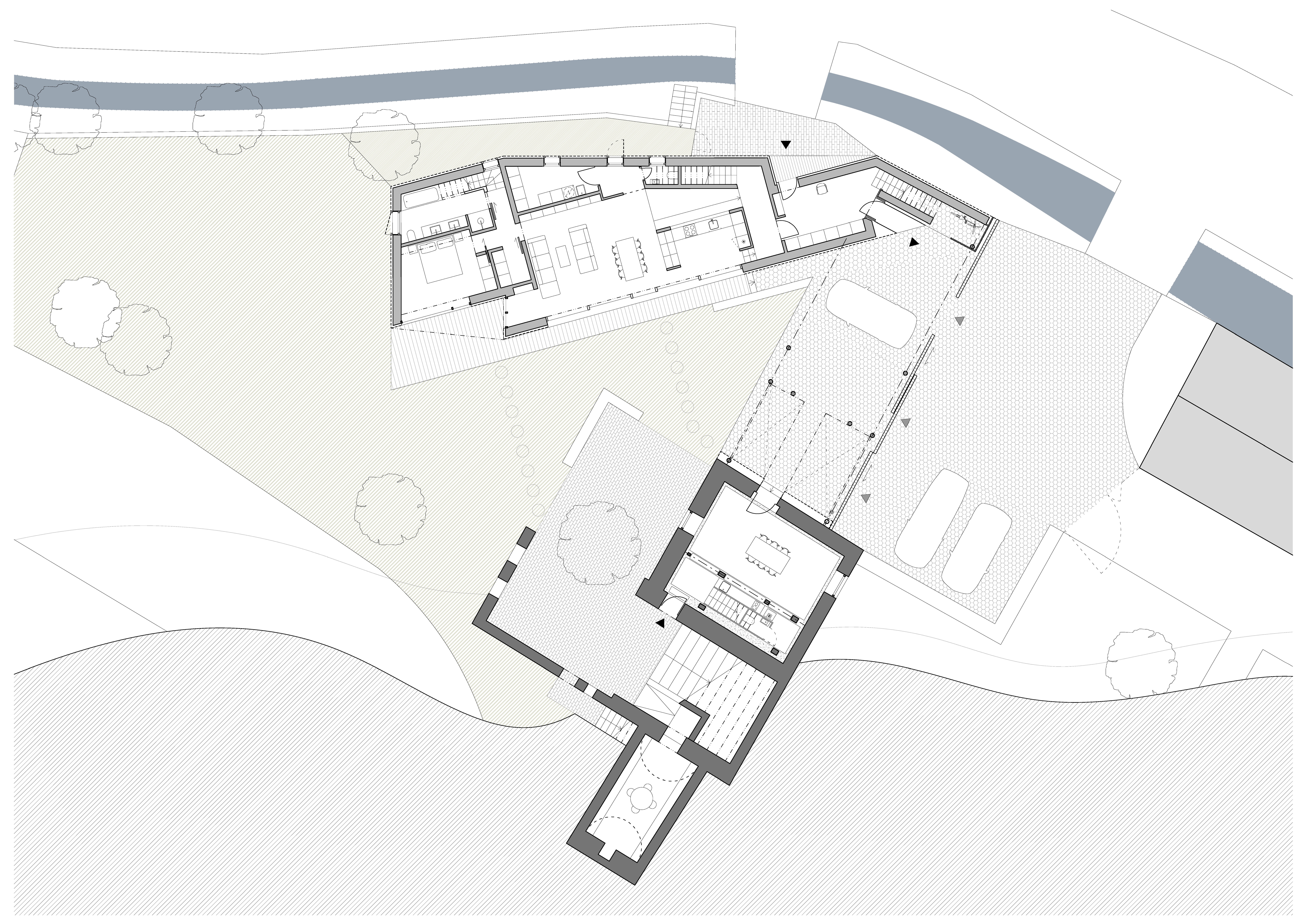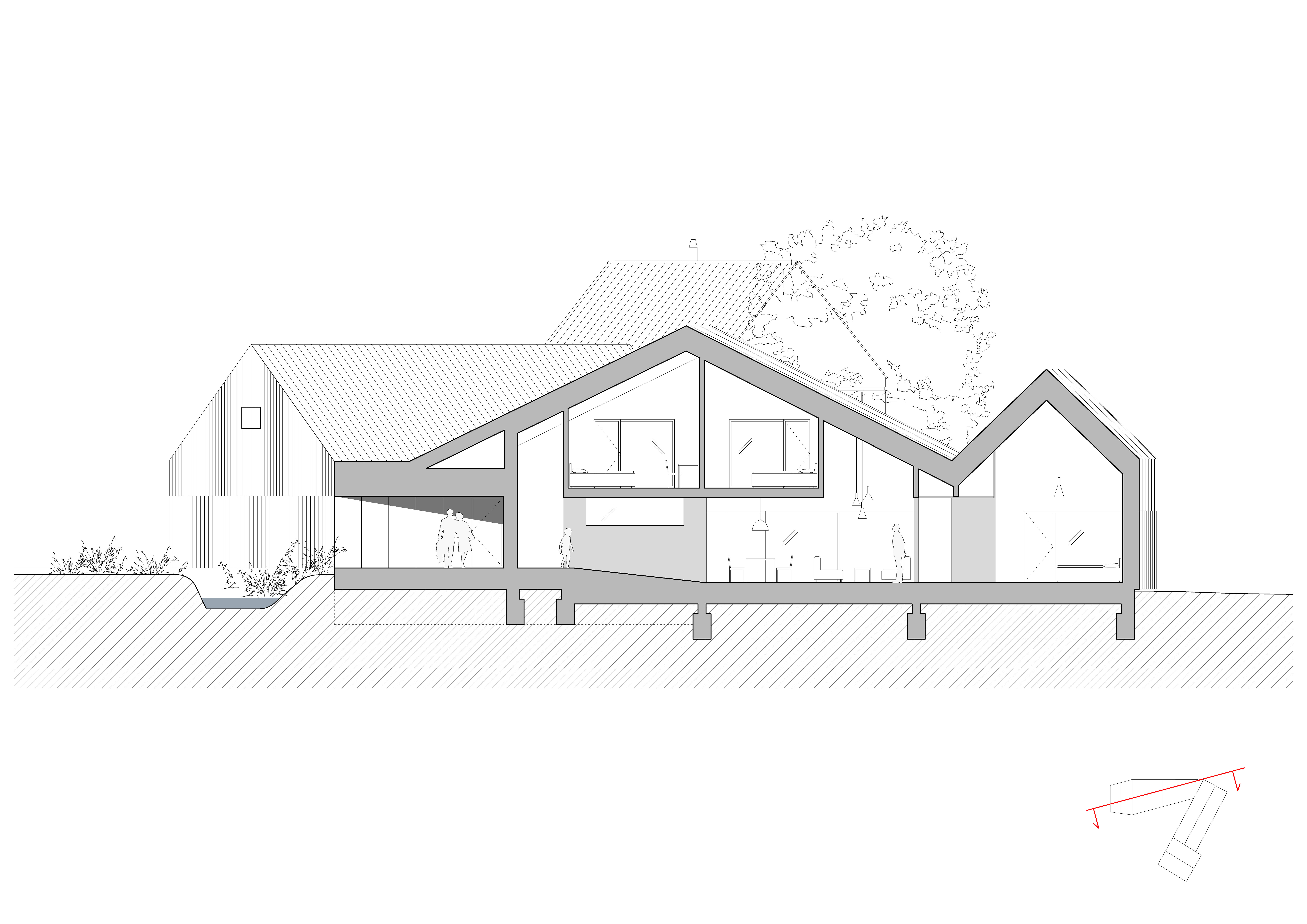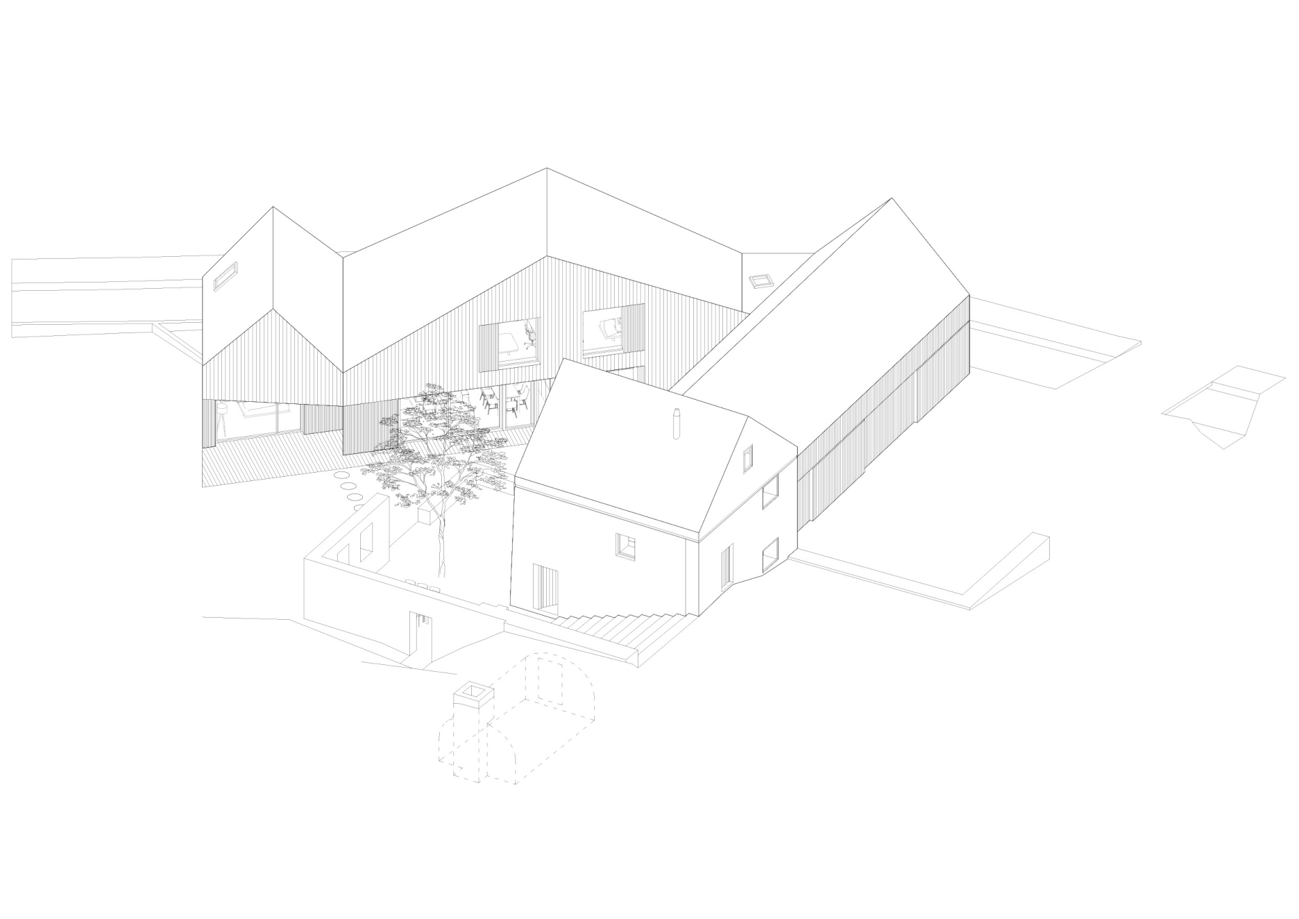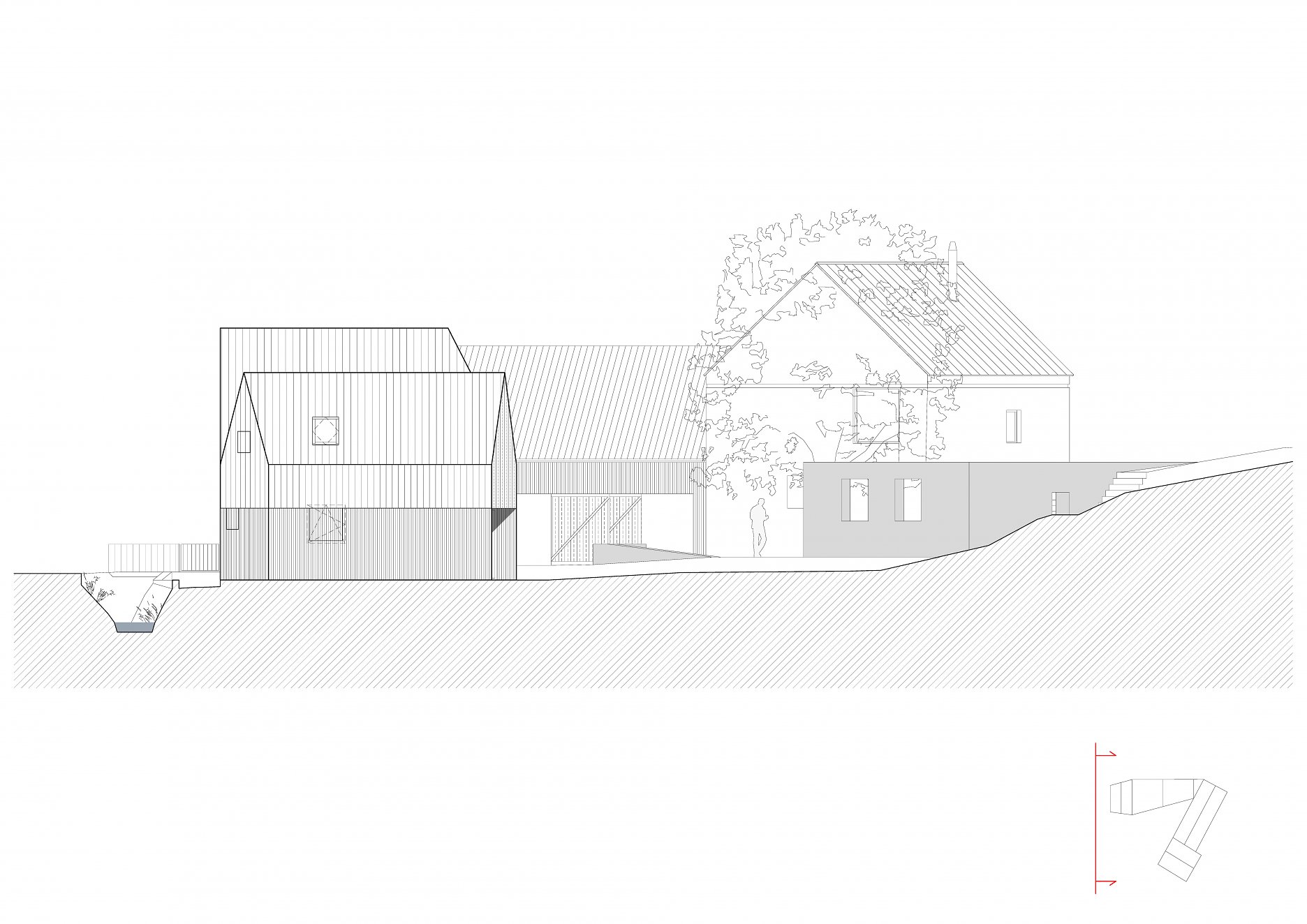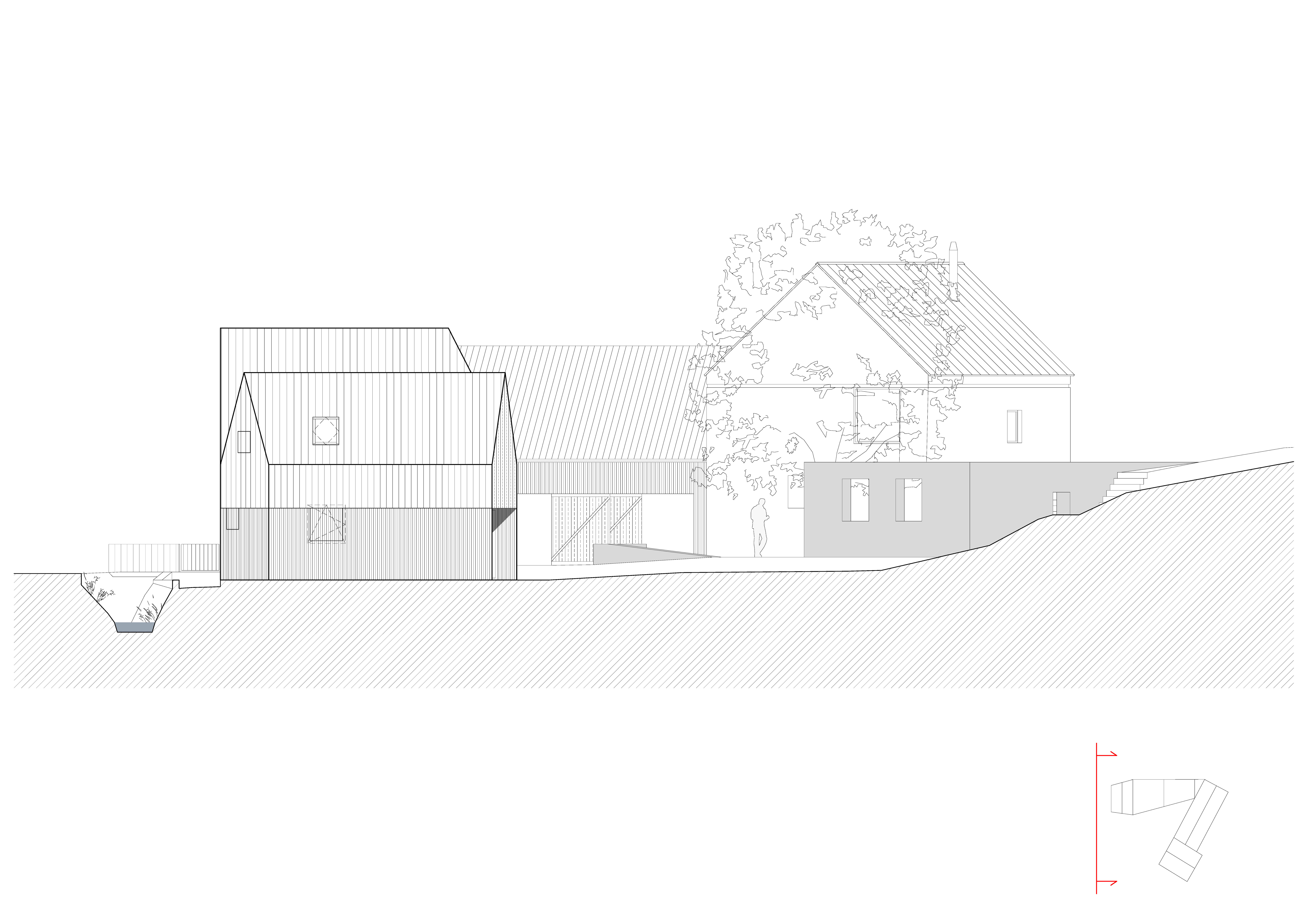 Tvar parcely je komplikovaný. Velkou část pozemku zabírá mlýn a jeho pozdější dostavby. Nehodnotná zemědělská stavení jsou u potoka. Tyto malé objekty a dostavby demolujeme. Výsledným řešením je usedlost tvořená třemi hmotami. Mlýnem, který částečně zachováváme, novostavbou rodinného domu, která zaujímá prostor u potoka a zastřešení parkovacích stání, které oba objekty spojuje. Mezi těmito třemi hmotami vzniká příjemný, částečně uzavřený prostor zahrady a dvora.